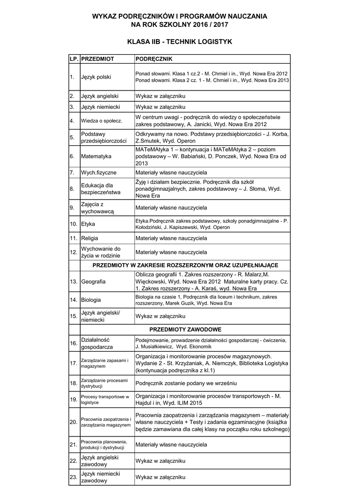 WYKAZ PODRĘCZNIKÓW I PROGRAMÓW NAUCZANIA NA ROK SZKOLNY 2016 / 2017 KLASA IIB - TECHNIK LOGISTYK LP. PRZEDMIOT PODRĘCZNIK 1. Język polski Ponad słowami. Klasa 1 cz.2 - M. Chmiel i in., Wyd. Nowa Era 2012 Ponad słowami. Klasa 2 cz. 1 - M. Chmiel i in., Wyd. Nowa Era 2013 2. Język angielski Wykaz w załączniku 3. Język niemiecki Wykaz w załączniku 4. Wiedza o społecz. W centrum uwagi - podręcznik do wiedzy o społeczeństwie zakres podstawowy, A. Janicki, Wyd. Nowa Era 2012 5. Podstawy przedsiębiorczości Odkrywamy na nowo. Podstawy przedsiębiorczości - J. Korba, Z.Smutek, Wyd. Operon 6. Matematyka MATeMAtyka 1 – kontynuacja i MATeMAtyka 2 – poziom podstawowy – W. Babiański, D. Ponczek, Wyd. Nowa Era od 2013 7. Wych.fizyczne Materiały własne nauczyciela 8. Edukacja dla bezpieczeństwa Żyję i działam bezpiecznie. Podręcznik dla szkół ponadgimnazjalnych, zakres podstawowy – J. Słoma, Wyd. Nowa Era 9. Zajęcia z wychowawcą Materiały własne nauczyciela 10. Etyka Etyka.Podręcznik zakres podstawowy, szkoły ponadgimnazjalne - P. Kołodziński, J. Kapiszewski, Wyd. Operon 11. Religia Materiały własne nauczyciela 12. Wychowanie do życia w rodzinie Materiały własne nauczyciela PRZEDMIOTY W ZAKRESIE ROZSZERZONYM ORAZ UZUPEŁNIAJĄCE 13. Geografia Oblicza geografii 1. Zakres rozszerzony - R. Malarz,M. Więckowski, Wyd. Nowa Era 2012 Maturalne karty pracy. Cz. 1. Zakres rozszerzony - A. Karaś, wyd. Nowa Era 14. Biologia Biologia na czasie 1, Podręcznik dla liceum i technikum, zakres rozszerzony, Marek Guzik, Wyd. Nowa Era 15. Język angielski/ niemiecki Wykaz w załączniku PRZEDMIOTY ZAWODOWE 16. Działalność gospodarcza Zarządzanie zapasami i 17. magazynem Zarządzanie procesami 18. dystrybucji Procesy transportowe w 19. logistyce Podejmowanie, prowadzenie działalności gospodarczej - ćwiczenia, J. Musiałkiewicz, Wyd. Ekonomik Organizacja i monitorowanie procesów magazynowych. Wydanie 2 - St. Krzyżaniak, A. Niemczyk, Biblioteka Logistyka (kontynuacja podręcznika z kl.1) Podręcznik zostanie podany we wrześniu Organizacja i monitorowanie procesów transportowych - M. Hajdul i in, Wyd. ILIM 2015 Pracownia zaopatrzenia i zarządzania magazynem – materiały Pracownia zaopatrzenia i 20. zarządzania magazynem własne nauczyciela + Testy i zadania egzaminacyjne (książka będzie zamawiana dla całej klasy na początku roku szkolnego) Pracownia planowania, 21. produkcji i dystrybucji Materiały własne nauczyciela 22. Język angielski zawodowy Wykaz w załączniku 23. Język niemiecki zawodowy Wykaz w załączniku