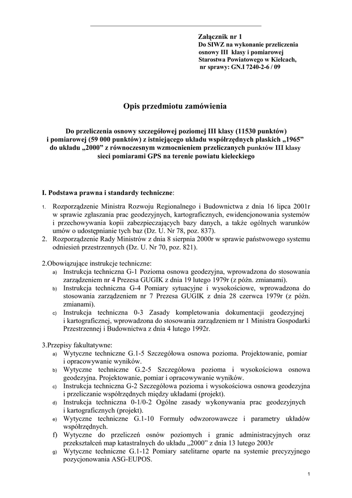 Załącznik nr 1 Do SIWZ na wykonanie przeliczenia osnowy III klasy i pomiarowej Starostwa Powiatowego w Kielcach, nr sprawy: GN.I 7240-2-6 / 09 Opis przedmiotu zamówienia Do przeliczenia osnowy szczegółowej poziomej III klasy (11530 punktów) i pomiarowej (59 000 punktów) z istniejącego układu współrzędnych płaskich „1965” do układu „2000” z równoczesnym wzmocnieniem przeliczanych punktów III klasy sieci pomiarami GPS na terenie powiatu kieleckiego I. Podstawa prawna i standardy techniczne: Rozporządzenie Ministra Rozwoju Regionalnego i Budownictwa z dnia 16 lipca 2001r w sprawie zgłaszania prac geodezyjnych, kartograficznych, ewidencjonowania systemów i przechowywania kopii zabezpieczających bazy danych, a także ogólnych warunków umów o udostępnianie tych baz (Dz. U. Nr 78, poz. 837). 2. Rozporządzenie Rady Ministrów z dnia 8 sierpnia 2000r w sprawie państwowego systemu odniesień przestrzennych (Dz. U. Nr 70, poz. 821). 1. 2.Obowiązujące instrukcje techniczne: a) Instrukcja techniczna G-1 Pozioma osnowa geodezyjna, wprowadzona do stosowania zarządzeniem nr 4 Prezesa GUGIK z dnia 19 lutego 1979r (z późn. zmianami). b) Instrukcja techniczna G-4 Pomiary sytuacyjne i wysokościowe, wprowadzona do stosowania zarządzeniem nr 7 Prezesa GUGIK z dnia 28 czerwca 1979r (z późn. zmianami). c) Instrukcja techniczna 0-3 Zasady kompletowania dokumentacji geodezyjnej i kartograficznej, wprowadzona do stosowania zarządzeniem nr 1 Ministra Gospodarki Przestrzennej i Budownictwa z dnia 4 lutego 1992r. 3.Przepisy fakultatywne: a) Wytyczne techniczne G.1-5 Szczegółowa osnowa pozioma. Projektowanie, pomiar i opracowywanie wyników. b) Wytyczne techniczne G.2-5 Szczegółowa pozioma i wysokościowa osnowa geodezyjna. Projektowanie, pomiar i opracowywanie wyników. c) Instrukcja techniczna G-2 Szczegółowa pozioma i wysokościowa osnowa geodezyjna i przeliczanie współrzędnych między układami (projekt). d) Instrukcja techniczna 0-1/0-2 Ogólne zasady wykonywania prac geodezyjnych i kartograficznych (projekt). e) Wytyczne techniczne G.1-10 Formuły odwzorowawcze i parametry układów współrzędnych. f) Wytyczne do przeliczeń osnów poziomych i granic administracyjnych oraz przekształceń map katastralnych do układu „2000” z dnia 13 lutego 2003r g) Wytyczne techniczne G.1-12 Pomiary satelitarne oparte na systemie precyzyjnego pozycjonowania ASG-EUPOS. 1 Charakterystyka obiektu − Obiekt położony w granicach administracyjnych powiatu kieleckiego o powierzchni 505798 ha w której skład wchodzą 23 gminy w tym cztery miasta. − Ilość punktów I klasy 85 wraz z o punktami poza powiatem w pasie 3 km − Ilość punktów II klasy 608 wraz z o punktami poza powiatem w pasie 3 km − Ilość wszystkich punktów III klasy 11530 w tym 675 pkt. główne rozetowe 2025 par punktów kotw. Do pomiaru GPS około 250 punktów ( właściwą ilość punktów do pomiaru określi wykonawca po przeanalizowaniu materiałów i przedstawi zleceniodawcy do akceptacji) − Ilość punktów osnowy 4 klasy oraz pomiarowej szacuje się na około 59 000 z błędem oszacowania 10%. Materiały archiwalne: Operaty z modernizacji osnowy poziomej III kl. − − − − − − − − − − − − − − − − − − − − − Gm. Bieliny 2403-10/1994 Gm. Bodzentyn 2275-2/1993 Gm. Chęciny 2463/43/1992 Gm. Chmielnik 2721-403/1996 Gm. Daleszyce 2466-1/1994 Obr. Bolmin 2462/16/1992 Gm. Łagów 2532-14/1993 Gm. Nowa Słupia 2404-2/1993 Gm. Miedziana Góra 2272-15/1994 Gm. Masłow i górna 2337-15/1993 Gm. Morawica 2528-55/1994 Gm Mniów op z 1987 r. Obr. Górno – Cedzyna 2401-44/1994 Gm. Pierzchnica 2593-37/1992 Gm. Sitkówka Nowiny 2463-23/1994 Gm. Piekoszów 2335-38/1993 Obr. Sładków Duży – Śladków Mały – Chomentówek – Sędziejowice 2785-134/1996 Gm. Łopuszno 35/1982 Gm. Raków 2260-27/1993 Gm. Strawczyn 2270-1/1991 Gm. Zagnańsk 2208-4/1992 , 2208-91/1996 Operaty z niwelacji osnowy poziomej III kl. − − − − − − − Gm. Strawczyn 2270-43/1996 Gm. Daleszyce 2466-43/1994 Gm. Łopuszno 2269-20/1996 Gm. Raków z 1994 Gm. Masłów Górno 2337-153/1996 Gm. Sitkówka nowiny 2463-137/1996 Obr. Bolmin 2463-135/1996 2 − Gm. Morawica – Chęciny Obr Ostrów –Łukowa 2463-208/1980 Z terenów w których zostały lub są wykonywane przeliczenia osnowy do układu 2000 przyjąć współrzędne punktów sąsiadujących z powiatem kieleckim. II. Przeliczanie osnowy III klasy i osnowy pomiarowej z terenu powiatu kieleckiego Przyjmuje się zasadę, że sieci szczegółowe III klasy zostaną przeliczone poprzez wyrównanie w oparciu o osnowę I i II klas, wykorzystując istniejące dane z pomiarów wykonanych zgodnie z instrukcją G-1 oraz pseudoobserwacje otrzymane z obserwacji GPS w postaci rzutów wektorów i azymutów, natomiast sieci wykonane wg instrukcji BIII (stara) zostaną przeliczone poprzez transformacje w oparciu o punkty I-III klasy oraz co szczególnie istotne, w oparciu o ewentualne punkty identyczne z punktami wyższych klas jako punktami dostosowania. Punkty osnowy pomiarowej (łącznie ok. 59000 punktów) zostaną przeliczone poprzez transformację. W przypadku niemożliwości identyfikacji punktów dostosowania transformacji należy dokonać przy zastosowaniu korekty globalnej metodą konforemną Helmerta, a następnie stosując korektę potransformacyjną Hausbrandta. 1) Wprowadzenie do pliku tekstowego brakujących współrzędnych punktów sieci dawnych założonych wg przepisów instrukcji BIII oraz nadanie im unikalnej numeracji wraz ze sporządzeniem odpowiednich słowników synchronizacyjnych w dwóch wersjach: wg starej i wg nowej numeracji. 2) Sprawdzenie wprowadzenia punktów I-III klasy do Banku Osnów i ewentualne uzupełnienie brakujących punktów na podstawie obrazu wyświetlających się punktów na tle rastrów map przeglądowych. 3) Pobranie współrzędnych punktów I i II klasy w układach „1965” i „2000” z Podgik 