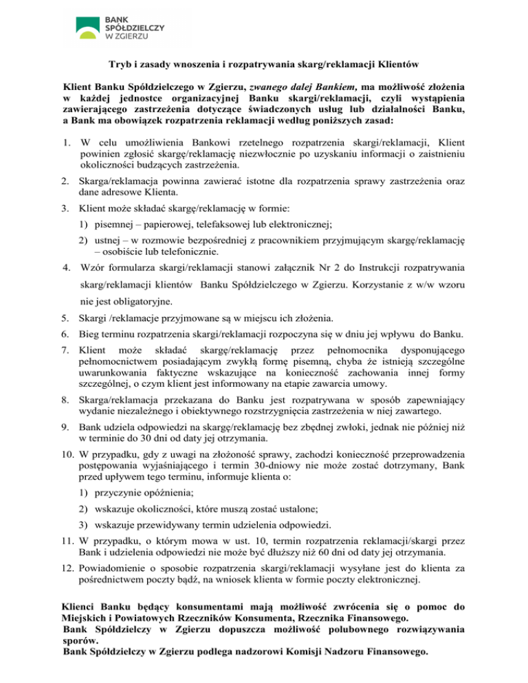 Tryb i zasady wnoszenia i rozpatrywania skarg/reklamacji Klientów Klient Banku Spółdzielczego w Zgierzu, zwanego dalej Bankiem, ma możliwość złożenia w każdej jednostce organizacyjnej Banku skargi/reklamacji, czyli wystąpienia zawierającego zastrzeżenia dotyczące świadczonych usług lub działalności Banku, a Bank ma obowiązek rozpatrzenia reklamacji według poniższych zasad: 1. W celu umożliwienia Bankowi rzetelnego rozpatrzenia skargi/reklamacji, Klient powinien zgłosić skargę/reklamację niezwłocznie po uzyskaniu informacji o zaistnieniu okoliczności budzących zastrzeżenia. 2. Skarga/reklamacja powinna zawierać istotne dla rozpatrzenia sprawy zastrzeżenia oraz dane adresowe Klienta. 3. Klient może składać skargę/reklamację w formie: 1) pisemnej – papierowej, telefaksowej lub elektronicznej; 2) ustnej – w rozmowie bezpośredniej z pracownikiem przyjmującym skargę/reklamację – osobiście lub telefonicznie. 4. Wzór formularza skargi/reklamacji stanowi załącznik Nr 2 do Instrukcji rozpatrywania skarg/reklamacji klientów Banku Spółdzielczego w Zgierzu. Korzystanie z w/w wzoru nie jest obligatoryjne. 5. Skargi /reklamacje przyjmowane są w miejscu ich złożenia. 6. Bieg terminu rozpatrzenia skargi/reklamacji rozpoczyna się w dniu jej wpływu do Banku. 7. Klient może składać skargę/reklamację przez pełnomocnika dysponującego pełnomocnictwem posiadającym zwykłą formę pisemną, chyba że istnieją szczególne uwarunkowania faktyczne wskazujące na konieczność zachowania innej formy szczególnej, o czym klient jest informowany na etapie zawarcia umowy. 8. Skarga/reklamacja przekazana do Banku jest rozpatrywana w sposób zapewniający wydanie niezależnego i obiektywnego rozstrzygnięcia zastrzeżenia w niej zawartego. 9. Bank udziela odpowiedzi na skargę/reklamację bez zbędnej zwłoki, jednak nie później niż w terminie do 30 dni od daty jej otrzymania. 10. W przypadku, gdy z uwagi na złożoność sprawy, zachodzi konieczność przeprowadzenia postępowania wyjaśniającego i termin 30-dniowy nie może zostać dotrzymany, Bank przed upływem tego terminu, informuje klienta o: 1) przyczynie opóźnienia; 2) wskazuje okoliczności, które muszą zostać ustalone; 3) wskazuje przewidywany termin udzielenia odpowiedzi. 11. W przypadku, o którym mowa w ust. 10, termin rozpatrzenia reklamacji/skargi przez Bank i udzielenia odpowiedzi nie może być dłuższy niż 60 dni od daty jej otrzymania. 12. Powiadomienie o sposobie rozpatrzenia skargi/reklamacji wysyłane jest do klienta za pośrednictwem poczty bądź, na wniosek klienta w formie poczty elektronicznej. Klienci Banku będący konsumentami mają możliwość zwrócenia się o pomoc do Miejskich i Powiatowych Rzeczników Konsumenta, Rzecznika Finansowego. Bank Spółdzielczy w Zgierzu dopuszcza możliwość polubownego rozwiązywania sporów. Bank Spółdzielczy w Zgierzu podlega nadzorowi Komisji Nadzoru Finansowego.
