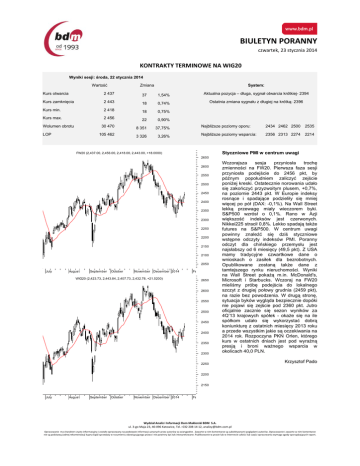 BIULETYN PORANNY czwartek, 23 stycznia 2014 KONTRAKTY TERMINOWE NA WIG20 Wyniki sesji: środa, 22 stycznia 2014 Wartość Zmiana System: Kurs otwarcia 2 437 37 1,54% Aktualna pozycja – długa, sygnał otwarcia krótkiej- 2394 Kurs zamknięcia 2 443 18 0,74% Ostatnia zmiana sygnału z długiej na krótką- 2396 Kurs min. 2 418 18 0,75% Kurs max. 2 456 22 0,90% 30 470 8 351 37,75% 3 326 3,26% Wolumen obrotu LOP 105 462 Najbliższe poziomy oporu: 2434 2462 2500 2535 Najbliższe poziomy wsparcia: 2356 2313 2274 2214 Styczniowe PMI w centrum uwagi FW20 (2,437.00, 2,456.00, 2,418.00, 2,443.00, +18.0000) 2650 2600 2550 2500 2450 2400 2350 2300 2250 2200 2150 2100 2050 July August September October November December 2014 Fe WIG20 (2,423.73, 2,443.84, 2,407.73, 2,432.78, +21.5200) 2650 2600 2550 2500 2450 2400 2350 2300 Wczorajsza sesja przyniosła trochę zmienności na FW20. Pierwsza faza sesji przyniosła podejście do 2456 pkt, by późnym popołudniem zaliczyć zejście poniżej kreski. Ostatecznie norowania udało się zakończyć przyzwoitym plusem, +0,7%, na poziomie 2443 pkt. W Europie indeksy rosnące i spadające podzieliły się mniej więcej po pół (DAX: -0,1%). Na Wall Street lekką przewagę miały wieczorem byki. S&P500 wzrósł o 0,1%. Rano w Azji większość indeksów jest czerwonych. Nikkei225 stracił 0,8%. Lekko spadają także futures na S&P500. W centrum uwagi powinny znaleźć się dziś styczniowe wstępne odczyty indeksów PMI. Poranny odczyt dla chińskiego przemysłu jest najsłabszy od 6 miesięcy (49,5 pkt). Z USA mamy tradycyjne czwartkowe dane o wnioskach o zasiłek dla bezrobotnych. Opublikowane zostaną także dane z tamtejszego rynku nieruchomości. Wyniki na Wall Street pokażą m.in. McDonald's, Microsoft i Starbucks. Wczoraj na FW20 mieliśmy próbę podejścia do lokalnego szczyt z drugiej połowy grudnia (2459 pkt), na razie bez powodzenia. W drugą stronę, sytuacja byków wygląda bezpiecznie dopóki nie pojawi się zejście pod 2360 pkt. Jutro oficjalnie zacznie się sezon wyników za 4Q’13 krajowych spółek - okaże się na ile spółkom udało się wykorzystać dobrą koniunkturę z ostatnich miesięcy 2013 roku a przede wszystkim jakie są oczekiwania na 2014 rok. Rozpoczyna PKN Orlen, którego kurs w ostatnich dniach jest pod wyraźną presją i broni ważnego wsparcia w okolicach 40,0 PLN. 2250 Krzysztof Pado 2200 2150 July August September October November December 2014 Fe Wydział Analiz i Informacji Dom Maklerski BDM S.A. ul. 3‐go Maja 23, 40‐096 Katowice, Tel.: 032 208 14 12, [email protected] Opracowanie ma charakter czysto informacyjny i zostało opracowany na podstawie informacji uznanych przez autorów za wiarygodne . Zawarte w nim komentarze są subiektywnymi poglądami autorów. Opracowanie i zawarte w nim komentarze nie są podstawą żadnej rekomendacji kupna bądź sprzedaży w rozumieniu obowiązującego prawa i nie powinny być tak interpretowane. Publikowanie w prasie lub w Internecie całości lub części opracowania wymaga zgody sporządzających raport. BIULETYN PORANNY czwartek, 23 stycznia 2014 RYNEK AKCJI Wyniki sesji: środa, 22 stycznia 2014 52 tygodnie Indeks Kurs otwarcia Kurs zamknięcia Zmiana [%] Kurs min. Kurs max. Zakres wahań Wartość obrotów [mln PLN] Kurs max. Kurs min. WIG20 2 625,8 2 150,8 2 423,73 2 432,78 0,89% 2 407,73 2 443,84 36,1 770,0 WIG30 2 764,4 2 435,3 2 551,11 2 559,82 0,93% 2 535,84 2 570,23 34,4 908,0 sWIG80 15 156,8 10 183,5 14 304,78 14 275,94 0,06% 14 257,15 14 362,58 105,4 61,5 mWIG40 3 599,3 2 453,4 3 371,14 3 383,84 1,03% 3 368,81 3 388,86 20,1 214,0 WIG-PL 56 438,7 43 438,1 52 997,85 52 928,12 0,83% 52 679,74 52 997,85 318,1 - WIG 55 384,8 42 842,1 51 766,14 51 906,45 0,78% 51 529,19 52 051,68 522,5 1 070,0 Spółka zmiana % zmiana % względem WIG30 Cena [PLN] Mkt Cap [mln PLN] ALIOR BANK 86,00 6 015 ASSECOPOL 45,44 3 772 1,2% -2,1% -9,1% -3,1% 0,3% -2,6% -4,3% -7,9% AZOTY TARNÓW 50,40 4 999 -4,1% -18,0% -39,2% -27,5% -5,0% -18,6% -34,4% -32,4% BANK HANDLOWY 111,15 14 523 2,3% 4,9% -10,5% 16,7% 1,4% 4,3% -5,7% 11,8% BOGDANKA 127,25 4 328 1,0% 2,6% 12,1% 25,2% 0,1% 2,1% 16,9% 20,4% BORYSZEW 0,52 1 144 0,0% 2,0% -5,5% 10,6% -0,9% 1,4% -0,6% 5,8% BRE 513,00 21 636 1,6% 2,6% -2,2% 29,5% 0,7% 2,0% 2,7% 24,7% BZ WBK 397,80 37 212 3,6% 1,7% 6,6% 31,2% 2,7% 1,2% 11,5% 26,4% CCC 117,50 4 512 4,6% 2,3% -13,8% 30,0% 3,7% 1,7% -8,9% 25,1% CYFROWY POLSAT 19,82 6 904 2,2% -0,1% -14,5% -11,2% 1,2% -0,7% -9,6% -16,1% ENEA 13,28 5 862 -0,2% -3,8% -10,3% -5,8% -1,1% -4,3% -5,4% -10,7% EUROCASH 41,30 5 717 1,7% -12,1% -17,4% -30,6% 0,8% -12,6% -12,6% -35,5% GTC 7,35 2 347 -2,0% -3,3% -9,8% -10,6% -2,9% -3,8% -5,0% -15,5% ING BSK 117,50 15 287 1,7% 2,2% -3,6% 20,0% 0,8% 1,6% 1,2% 15,1% JSW 50,32 5 908 0,6% -7,2% -25,1% -23,8% -0,3% -7,7% -20,3% -28,6% dzienna 1M 3M 6M dzienna 1M 3M 6M 0,8% 7,5% 5,5% -1,7% -0,1% 6,9% 10,4% -6,6% KERNEL 41,90 3 339 1,9% 6,6% -20,2% -20,5% 0,9% 6,0% -15,3% -25,4% KGHM 114,20 22 840 0,4% -0,4% -5,9% -2,8% -0,5% -0,9% -1,1% -7,7% LOTOS 36,00 4 675 1,4% 0,1% -6,5% 0,6% 0,5% -0,5% -1,6% -4,3% 9 190,00 16 828 2,1% 4,4% 1,0% 34,7% 1,2% 3,9% 5,8% 29,8% LPP NETIA 5,02 1 747 -0,2% -2,3% -3,1% 11,6% -1,1% -2,9% 1,8% 6,7% PEKAO 188,00 49 344 1,2% 5,3% -1,2% 16,8% 0,3% 4,7% 3,7% 11,9% PGE 17,10 31 973 0,9% 0,6% -9,0% 12,6% 0,0% 0,0% -4,2% 7,8% PGNIG 5,13 30 267 1,6% -2,7% -10,3% -14,5% 0,7% -3,2% -5,5% -19,4% PKNORLEN 40,46 17 305 -1,2% -2,0% -11,7% -13,4% -2,1% -2,5% -6,8% -18,3% PKOBP 41,90 52 375 1,2% 5,6% 7,2% 13,3% 0,3% 5,1% 12,0% 8,4% PZU 436,00 37 650 0,5% -3,6% -5,3% -3,1% -0,4% -4,2% -0,5% -8,0% SYNTHOS 5,44 7 198 0,0% -2,0% 3,0% 22,5% -0,9% -2,5% 7,9% 17,6% TAURON 4,31 7 553 0,9% -4,9% -12,4% 2,6% 0,0% -5,4% -7,6% -2,3% TPSA 10,20 13 386 -1,8% 4,4% 8,2% 27,5% -2,8% 3,8% 13,0% 22,6% TVN 14,83 5 140 0,2% 2,3% -4,3% 33,4% -0,7% 1,7% 0,5% 28,5% Wydział Analiz i Informacji Dom Maklerski BDM S.A. ul. 3‐go Maja 23, 40‐096 Katowice, Tel.: 032 208 14 12, [email protected]