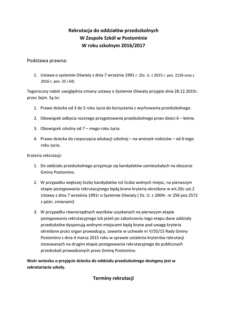 Rekrutacja do oddziałów przedszkolnych W Zespole Szkół w Postominie W roku szkolnym 2016/2017 Podstawa prawna: 1. Ustawa o systemie Oświaty z dnia 7 września 1991 r. (Dz. U. z 2015 r. poz. 2156 oraz z 2016 r. poz. 35 i 64) Tegoroczny nabór uwzględnia zmiany ustawy o Systemie Oświaty przyjęte dnia 28.12.2015r. przez Sejm. Są to: 1. Prawo dziecka od 3 do 5 roku życia do korzystania z wychowania przedszkolnego. 2. Obowiązek odbycia rocznego przygotowania przedszkolnego przez dzieci 6 – letnie. 3. Obowiązek szkolny od 7 – mego roku życia. 4. Prawo dziecka do rozpoczęcia edukacji szkolnej – na wniosek rodziców – od 6-tego roku życia. Kryteria rekrutacji: 1. Do oddziału przedszkolnego przyjmuje się kandydatów zamieszkałych na obszarze Gminy Postomino. 2. W przypadku większej liczby kandydatów niż liczba wolnych miejsc, na pierwszym etapie postępowania rekrutacyjnego będą brane kryteria określone w art.20c ust.2 Ustawy z dnia 7 września 1991r o Systemie Oświaty ( Dz. U. z 2004r. nr 256 poz.2572 z póżn. zmianami) 3. W przypadku równorzędnych wyników uzyskanych na pierwszym etapie postępowania rekrutacyjnego lub jeżeli po zakończeniu tego etapu dane oddziały przedszkolne dysponują wolnymi miejscami będą brane pod uwagę kryteria określone przez organ prowadzący, zawarte w uchwale nr V/35/15 Rady Gminy Postomino z dnia 4 marca 2015 roku w sprawie ustalenia kryteriów rekrutacji stosowanych na drugim etapie postępowania rekrutacyjnego do publicznych przedszkoli prowadzonych przez Gminę Postomino. Wzór wniosku o przyjęcie dziecka do oddziału przedszkolnego dostępny jest w sekretariacie szkoły. Terminy rekrutacji Terminy określa Zarządzenie nr 16/2016 Wójta Gminy Postomino z dnia 29.01.2016r. w sprawie ustalenia harmonogramu czynności w postępowaniu rekrutacyjnym oraz postępowaniu uzupełniającym na rok szkolny 2016/2017 do publicznych przedszkoli oraz do klas I publicznych szkół podstawowych, dla których Gmina Postomino jest organem prowadzącym. Kontynuacja wychowania przedszkolnego Rodzice dzieci uczęszczających do oddziału przedszkolnego składają na kolejny rok szkolny „ Deklarację o kontynuowaniu wychowania przedszkolnego” w terminie 7 dni poprzedzających termin rozpoczęcia postępowania rekrutacyjnego. Wzór deklaracji o kontynuowaniu wychowania przedszkolnego dostępny jest w sekretariacie szkoły.