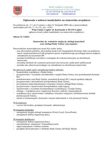 WÓJT GMINY CEGŁÓW ul. Tadeusza Kościuszki 4, 05-319 Cegłów tel. (25) 759 59 48, fax. (25) 759 59 38 www.ceglow.pl; [email protected] Ogłoszenie o naborze kandydatów na stanowisko urzędnicze Na podstawie art. 11 i art.13 ustawy z dnia 21 listopada 2008 roku o pracownikach samorządowych (Dz. U. Nr 232, poz. 1458.) Wójt Gminy Cegłów ul. Kościuszki 4, 05-319 Cegłów ogłasza otwarty nabór kandydatów na stanowisko urzędnicze : Oferta Nr 3/2012 Stanowisko ds. wniosków unijnych, obsługi kancelarii oraz obsługi Rady Gminy i jej organów Pracownikiem samorządowym może być osoba, która: - jest obywatelem polskim, obywatelem kraju Unii Europejskiej lub kraju, który na podstawie umów międzynarodowych lub przepisów prawa wspólnotowego przysługuje prawo podjęcia zatrudnienia na terytorium RP - posiada kwalifikacje zawodowe wymagane do wykonywania prac na określonym stanowisku - ma pełną zdolność do czynności prawnych oraz korzysta z pełni praw publicznych - posiada stan zdrowia pozwalający na zatrudnienie na określonym stanowisku Do głównych zadań osoby zatrudnionej będzie należało: - bezpośrednia współpraca z Radą Gminy - przygotowanie i wysyłanie zawiadomień o sesjach Rady Gminy oraz posiedzeniach Komisji RG, - protokołowanie sesji Rady Gminy, posiedzeń Komisji RG i innych spotkań radnych, - przygotowanie i prowadzenie korespondencji Rady Gminy, - prowadzenie innej dokumentacji związanej z biurem obsługi Rady Gminy, - przyjmowanie i rejestrowanie korespondencji wpływającej, - rejestrowanie i wysyłanie korespondencji wychodzącej z Urzędu Gminy, - obsługa i współpraca przy organizacji festynów stałych i okazjonalnych, - współpraca przy opracowaniu i składaniu wniosków unijnych o dofinansowanie działań promocyjnych Gminy, - udział w konferencjach, festynach i innych zdarzeniach w celu promocji Gminy Wykształcenie: - wyższe lub średnie, pożądany kierunek: administracja Wymagania niezbędne: - umiejętność biegłej obsługi komputera (Word, Excel, PowerPoint), - umiejętność dobrej organizacji pracy, Wymagania dodatkowe: - umiejętność dobrej organizacji pracy, - samodzielność, staranność i komunikatywność, - odpowiedzialność i kultura osobista - pożądane doświadczenie w obsłudze Rady Gminy lub Rady Miasta Informacja o warunkach pracy - wymiar zatrudnienia: pełny etat - miejsce pracy: budynek Urzędu Gminy w Cegłowie ul. Tadeusza Kościuszki 4. Bezpieczne warunki pracy na stanowisku. - stanowisko pracy: praca przy komputerze stacjonarnym lub przenośnym (laptop), obsługa urządzeń peryferyjnych (drukarki, skanery) obsługa kserokopiarek, - czas pracy: podstawowy czas pracy 8.00 – 16.00, praca w godzinach popołudniowych przy obsłudze sesji Rady Gminy i Komisji, praca w soboty i niedziele przy działaniach promocyjnych, Informacja o wskaźniku zatrudnienia osób niepełnosprawnych: W miesiącu poprzedzającym datę opublikowania ogłoszenia wskaźnik zatrudnienia osób niepełnosprawnych w jednostce, w rozumieniu przepisów o rehabilitacji zawodowej i społecznej oraz zatrudnienia osób niepełnosprawnych, jest niższy niż 6 %. Wymagane dokumenty i oświadczenia: - kopia dowodu osobistego, - kopie dokumentów potwierdzających wykształcenie, - oświadczenie kandydata o korzystaniu z pełni praw publicznych i o niekaralności za przestępstwo popełnione umyślnie, - oświadczenie kandydata o wyrażeniu zgody na przetwarzania danych osobowych do celów rekrutacji, - życiorys i list motywacyjny, - kwestionariusz osobowy dla kandydata do pracy (strona www.bip.ceglow.pl/formularze), - kopia dokumentów potwierdzających doświadczenie zawodowe (o ile kandydat posiada) w tym doświadczenie w obsłudze Rady Gminy lub Rady Miasta, - kopia dokumentu potwierdzającego niepełnosprawność w przypadku kandydata, który zamierza skorzystać z uprawnienia wynikającego z art. 13a ust.2 ustawy z dnia 21 listopada 2008r o pracownikach samorządowych. Wszystkie składane dokumenty muszą być podpisane własnoręcznie przez kandydata do zatrudnienia. Dokumenty należy składać / przesyłać w terminie do: - 15 października 2012r, osobiście lub pocztą pod adresem: Urząd Gminy Cegłów ul. Kościuszki 4, 05-319 Cegłów, z dopiskiem „oferta pracy – stanowisko ds. obsługi Rady Gminy i kancelarii”. Decyduje data wpływu do Urzędu Gminy w Cegłowie. Dodatkowe informacje: - Zgodnie z art. 15 ustawy z dnia 21 listopada 2008rr o pracownikach samorządowych (tj. Dz. U. Nr 232, poz. 1458 ) niezwłocznie po przeprowadzonym naborze wynik naboru podany będzie do publicznej wiadomości na stronie internetowej www.bip.ceglow.pl, oraz na tablicy ogłoszeń w Urzędzie Gminy Cegłów. - Wójt Gminy zastrzega możliwość przeprowadzenia naboru tylko na podstawie złożonej dokumentacji. - Oferty złożone lub wysłane po terminie nie będą rozpatrywane i zostaną odrzucone - Oferty odrzucone zostaną komisyjnie zniszczone, Inne informacje: Oferty osób niezakwalifikowanych zostaną komisyjnie zniszczone. WÓJT (-) Marcin Uchman