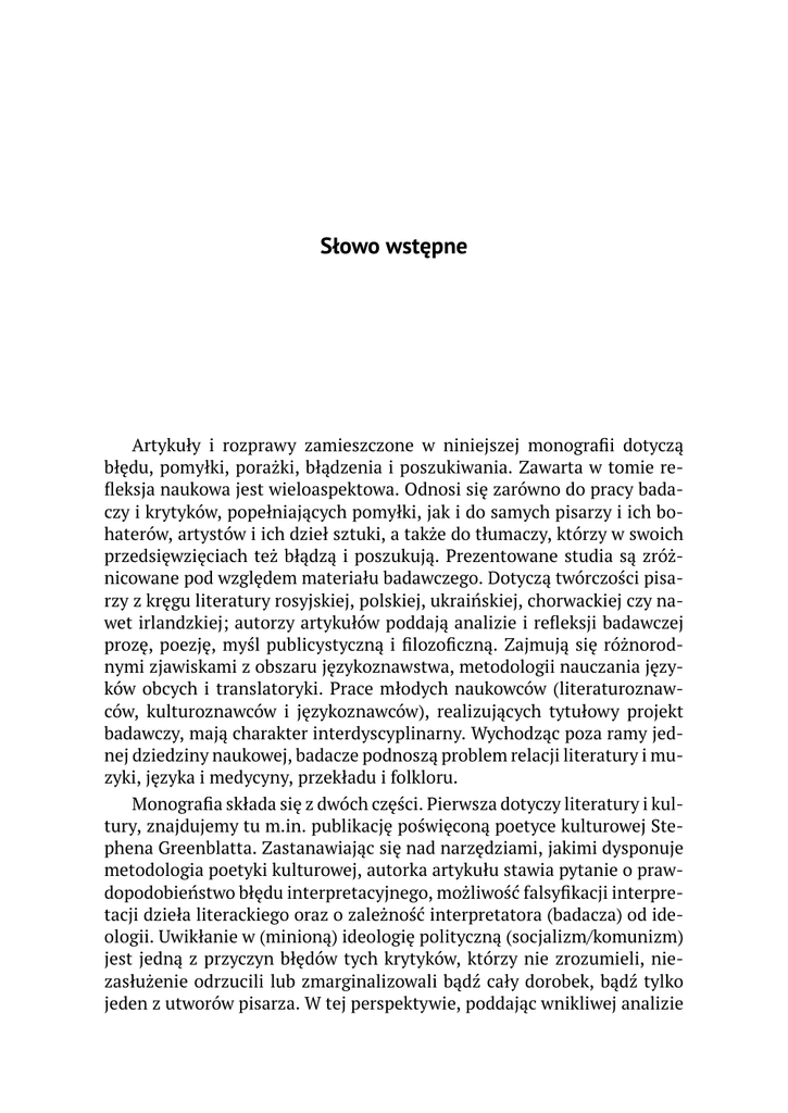 Słowo wstępne Artykuły i rozprawy zamieszczone w niniejszej monografii dotyczą błędu, pomyłki, porażki, błądzenia i poszukiwania. Zawarta w tomie refleksja naukowa jest wieloaspektowa. Odnosi się zarówno do pracy badaczy i krytyków, popełniających pomyłki, jak i do samych pisarzy i ich bohaterów, artystów i ich dzieł sztuki, a także do tłumaczy, którzy w swoich przedsięwzięciach też błądzą i poszukują. Prezentowane studia są zróżnicowane pod względem materiału badawczego. Dotyczą twórczości pisarzy z kręgu literatury rosyjskiej, polskiej, ukraińskiej, chorwackiej czy nawet irlandzkiej; autorzy artykułów poddają analizie i refleksji badawczej prozę, poezję, myśl publicystyczną i filozoficzną. Zajmują się różnorodnymi zjawiskami z obszaru językoznawstwa, metodologii nauczania języków obcych i translatoryki. Prace młodych naukowców (literaturoznawców, kulturoznawców i językoznawców), realizujących tytułowy projekt badawczy, mają charakter interdyscyplinarny. Wychodząc poza ramy jednej dziedziny naukowej, badacze podnoszą problem relacji literatury i muzyki, języka i medycyny, przekładu i folkloru. Monografia składa się z dwóch części. Pierwsza dotyczy literatury i kultury, znajdujemy tu m.in. publikację poświęconą poetyce kulturowej Stephena Greenblatta. Zastanawiając się nad narzędziami, jakimi dysponuje metodologia poetyki kulturowej, autorka artykułu stawia pytanie o prawdopodobieństwo błędu interpretacyjnego, możliwość falsyfikacji interpretacji dzieła literackiego oraz o zależność interpretatora (badacza) od ideologii. Uwikłanie w (minioną) ideologię polityczną (socjalizm/komunizm) jest jedną z przyczyn błędów tych krytyków, którzy nie zrozumieli, niezasłużenie odrzucili lub zmarginalizowali bądź cały dorobek, bądź tylko jeden z utworów pisarza. W tej perspektywie, poddając wnikliwej analizie 8 Słowo wstępne teksty literackie, jak też kontekst historyczny i kulturowy, autorzy opracowań traktujących o błądzeniu krytyki, przywracają współczesnej nauce i czytelnikom twórczość lwowskiego prozaika Stefana Grabińskiego, ukraińskiego futurysty Mychajła Semenki czy powieść Jerzego Andrzejewskiego Bramy raju. Realizując projekt badawczy zawarty w tytule monografii, młodzi badacze poddają namysłowi kwestię (z)błądzenia, poszukiwania tożsamości, porażek (grzechów) bohaterów literackich, całych społeczeństw bądź narodów (w obrębie refleksji publicystycznej), jak również ich zwycięstw (pokajania) w odnajdowaniu właściwej drogi, w poszukiwania Prawdy i Boga. Jednym z przejawów tytułowej problematyki niniejszego tomu jest motyw błądzenia człowieka jako emigranta, poszukującego własnej przestrzeni/domu poza Ojczyzną. Materiałem badawczym, na podstawie którego zbadano wymienione kwestie, jest literatura rosyjska różnych epok – klasycyzmu (Michaił Chieraskow), tzw. Złotego (Fiodor Dostojewski) i Srebrnego Wieku (Fiodor Sołogub, Iwan Bunin, Marina Cwietajewa, Michaił Osorgin), myśl rosyjskiego Renesansu religijno-filozoficznego (Siemion Frank), literatura okresu radzieckiego (Walentin Katajew, Iwan Czendej, Aleksander Sołżenicyn) oraz współczesna (Marina Arbatowa). Dokonano więc szerokiego przeglądu tekstów różnych epok, wielu autorów, odmiennych gatunków literackich (proza, poezja, publicystyka, traktaty filozoficzne), co pozwoliło potwierdzić uniwersalność podejmowanego tematu, jakim jest błąd w życiu człowieka. Motyw odnajdowania/przypominania miejsca duchowo bliskiego bohaterowi w dzieciństwie i młodości, problem błądzenia w pamięci (wspomnieniach) i zakamarkach podświadomości odsłania kolejny aspekt tytułowej formuły, znajdując rozwinięcie w rozprawie o powieściach kryminalnych. Autorka artykułu, rozpatrując twórczość dwóch pisarek: polskiej – Joanny Bator (laureatki nagrody Nike 2013) i chorwackiej – Ireny Vrkljan (co poszerza naszą „mapę” rozważań o literaturę Słowian południowych), za pomocą narzędzi geopoetyki ukazuje literackie strategie błądzenia po obszarach przeszłości. Poza obszar słowiański wykracza artykuł warszawskiej badaczki, poświęcony pomyłce Jamesa Joyce’a (zawartej w jednym z listów irlandzkiego prozaika), jakiej dopuścił się sam pisarz, określając gatunek literacki ostatniej części Ulissesa, a także wciąż niezamkniętemu błądzeniu krytyków badających opus magnum Joyce’a. Druga część monografii dotyczy rozważań naukowych językoznawców. Badaczki z Rzeszowa i Lublina poddały analizie m.in. błędy językowe wy- Słowo wstępne 9 stępujące w tekstach prasowych, jak też przyczyny ich powstawania oraz konsekwencje wynikające z odstępstw od normy językowej. Nie powielając swoich dociekań, opisują one stan współczesnej prasy polskiej i prasy rosyjskiej XVII wieku. Kolejna grupa rozpraw odnosi się do sztuki translatorskiej. Otwiera ją artykuł, którego autor rozpatruje poprawność i kunszt przekładu utworów Andrzeja Sapkowskiego na język rosyjski, umieszczając w centrum swojej analizy takie leksemy, jak: strzyga, mantikora, wyvern, mglak, zjadarka, przerazy, chimery, zaczerpnięte z mitologii celtyckiej, germańskiej, greckiej oraz słowiańskiej. Pozostając w kręgu badań nad przekładem, warto nadto zwrócić uwagę na rozprawę dotyczącą tłumaczeń leksemu aron kodesz, oznaczającego skrzynię lub szafę do przechowywania Tory, umieszczaną w synagogach. Autorka tekstu zbadała poprawne i błędne przekłady terminu hebrajskiego na języki słowiańskie: polski, rosyjski, ukraiński, akcentując ważność kontekstu – tradycji religijnej, a więc różnice między chrześcijaństwem i judaizmem. Następną partię tekstów tworzą artykuły, których autorzy analizują błędy popełniane przez uczniów, studentów oraz przez nosicieli mowy ojczystej. Wnioski wypływające z ich ustaleń wykazują swą 