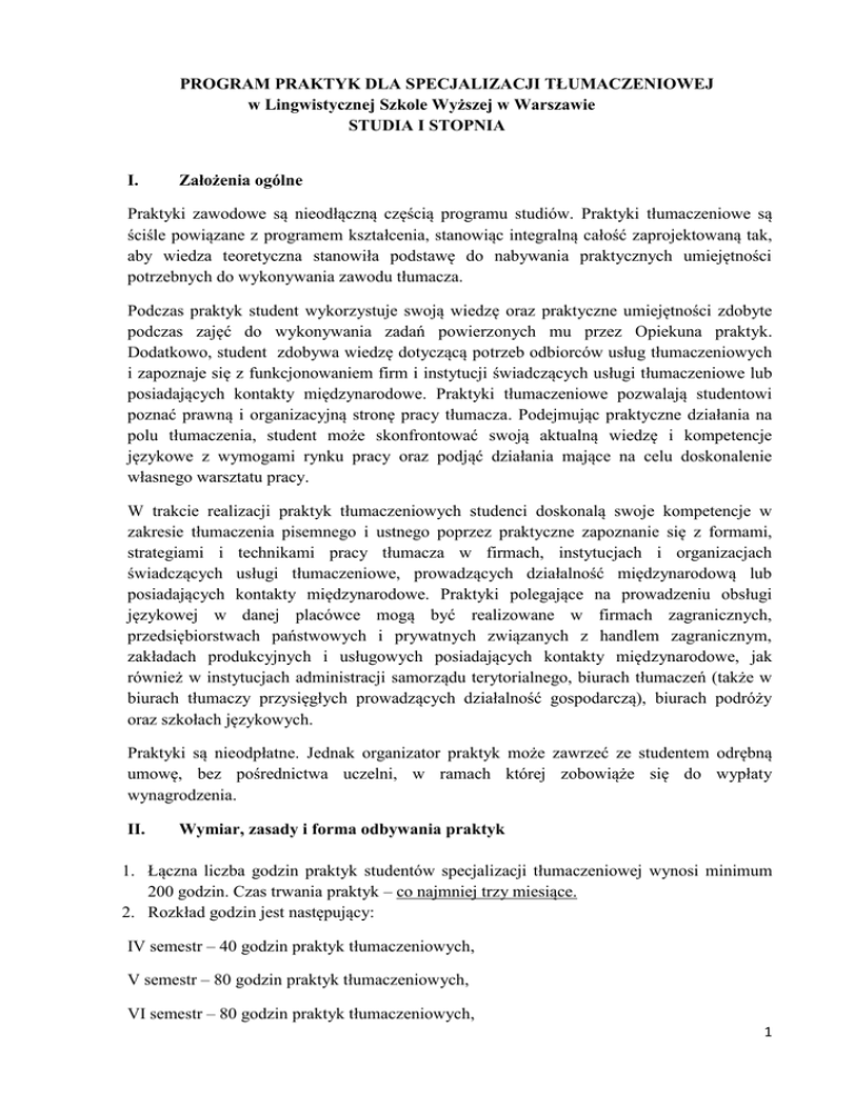 PROGRAM PRAKTYK DLA SPECJALIZACJI TŁUMACZENIOWEJ w