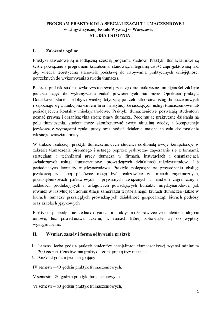PROGRAM PRAKTYK DLA SPECJALIZACJI TŁUMACZENIOWEJ w Lingwistycznej Szkole Wyższej w Warszawie STUDIA I STOPNIA I. Założenia ogólne Praktyki zawodowe są nieodłączną częścią programu studiów. Praktyki tłumaczeniowe są ściśle powiązane z programem kształcenia, stanowiąc integralną całość zaprojektowaną tak, aby wiedza teoretyczna stanowiła podstawę do nabywania praktycznych umiejętności potrzebnych do wykonywania zawodu tłumacza. Podczas praktyk student wykorzystuje swoją wiedzę oraz praktyczne umiejętności zdobyte podczas zajęć do wykonywania zadań powierzonych mu przez Opiekuna praktyk. Dodatkowo, student zdobywa wiedzę dotyczącą potrzeb odbiorców usług tłumaczeniowych i zapoznaje się z funkcjonowaniem firm i instytucji świadczących usługi tłumaczeniowe lub posiadających kontakty międzynarodowe. Praktyki tłumaczeniowe pozwalają studentowi poznać prawną i organizacyjną stronę pracy tłumacza. Podejmując praktyczne działania na polu tłumaczenia, student może skonfrontować swoją aktualną wiedzę i kompetencje językowe z wymogami rynku pracy oraz podjąć działania mające na celu doskonalenie własnego warsztatu pracy. W trakcie realizacji praktyk tłumaczeniowych studenci doskonalą swoje kompetencje w zakresie tłumaczenia pisemnego i ustnego poprzez praktyczne zapoznanie się z formami, strategiami i technikami pracy tłumacza w firmach, instytucjach i organizacjach świadczących usługi tłumaczeniowe, prowadzących działalność międzynarodową lub posiadających kontakty międzynarodowe. Praktyki polegające na prowadzeniu obsługi językowej w danej placówce mogą być realizowane w firmach zagranicznych, przedsiębiorstwach państwowych i prywatnych związanych z handlem zagranicznym, zakładach produkcyjnych i usługowych posiadających kontakty międzynarodowe, jak również w instytucjach administracji samorządu terytorialnego, biurach tłumaczeń (także w biurach tłumaczy przysięgłych prowadzących działalność gospodarczą), biurach podróży oraz szkołach językowych. Praktyki są nieodpłatne. Jednak organizator praktyk może zawrzeć ze studentem odrębną umowę, bez pośrednictwa uczelni, w ramach której zobowiąże się do wypłaty wynagrodzenia. II. Wymiar, zasady i forma odbywania praktyk 1. Łączna liczba godzin praktyk studentów specjalizacji tłumaczeniowej wynosi minimum 200 godzin. Czas trwania praktyk – co najmniej trzy miesiące. 2. Rozkład godzin jest następujący: IV semestr – 40 godzin praktyk tłumaczeniowych, V semestr – 80 godzin praktyk tłumaczeniowych, VI semestr – 80 godzin praktyk tłumaczeniowych, 1 Termin zaliczenia praktyk: nie później niż w terminie sesji poprawkowej w semestrze, w którym student odbywa praktyki. Warunkiem przystąpienia do egzaminu dyplomowego jest zaliczenie VI semestru studiów a tym samym zaliczenie praktyk, dlatego studenci, którzy chcą zdawać egzamin dyplomowy w I terminie muszą złożyć dokumenty potwierdzające odbycie praktyk odpowiednio wcześniej - w terminie ustalonym z Koordynatorem praktyk. Nie ma możliwości realizowania mniejszej liczby godzin praktyk lub w krótszym czasie niż podane powyżej. Bez zaliczenia określonej liczby godzin praktyk student nie uzyska zaliczenia semestru. Student powinien odbywać praktyki zgodnie z planem. W przypadku, gdy liczba godzin praktyk tłumaczeniowych odbytych w danej firmie/instytucji jest mniejsza od wymaganej liczby godzin praktyk tłumaczeniowych w zalecanym okresie, student, w porozumieniu z władzami uczelni oraz Koordynatorem praktyk może kontynuować praktyki tłumaczeniowe w innej placówce w wymiarze niezbędnym do zrealizowania określonego limitu. Osoby zatrudnione w firmach, instytucjach i organizacjach świadczących usługi tłumaczeniowe, prowadzących działalność międzynarodową lub posiadających kontakty międzynarodowe aktualnie w trakcie trwania studiów mogą złożyć podanie do Rektora o zaliczenie praktyk na podstawie zaświadczenia z pracy, potwierdzającego wykonywanie zadań związanych z tłumaczeniem lub obsługą językową w danej placówce oraz opinii dyrektora wraz z oceną pracy. III. Cele praktyk tłumaczeniowych Celem praktyk tłumaczeniowych jest przygotowanie studenta do wykonywania zawodu tłumacza oraz integrowanie wiedzy akademickiej z praktyką zawodową w obszarze tłumaczenia pisemnego i ustnego. W wyniku realizacji celów szczegółowych student: - pogłębia znajomość strategii i technik tłumaczeniowych oraz praktycznych umiejętności językowych nabytych w procesie kształcenia; - wykształca umiejętność pracy w zespole tłumaczeniowym w trybie zadaniowym; - potrafi ocenić własne kompetencje językowe; - potrafi zanalizować możliwość samodzielnego ich rozwijania; - zapoznaje się ze środowiskiem pracy; - nawiązuje kontakty na rynku pracy. IV. Obowiązki i zadania uczestnika praktyk 1. Praktyki tłumaczeniowe obejmują zadania, podczas których studenci mogą wykorzystać swoją znajomość języka specjalności do prowadzenia rozmów telefonicznych, pozyskiwania informacji z mediów, prowadzenia korespondencji, sporządzania tłumaczeń pisemnych i wykonywania tłumaczeń ustnych w zależności od potrzeb danej placówki. 2 2. a) b) c) d) e) V. Do obowiązków uczestników praktyk należy: zapoznanie się przed rozpoczęciem praktyk z treścią Regulaminu praktyk, aktywne uczestniczenie w praktykach tłumaczeniowych, wypełnianie poleceń i zadań wyznaczonych przez Opiekuna praktyk, przestrzeganie obowiązujących w miejscu pracy regulaminów, rzetelne wywiązywanie się z powierzonych zadań oraz przygotowanie niezbędnej dokumentacji. Obowiązki Opiekuna praktyk: Do obowiązków Opiekuna praktyk należy: a) umożliwienie studentowi realizacji efektów kształcenia praktyk zawodowych, b) wystawienie opinii o praktykancie w Dzienniku praktyk VI. EFEKTY KSZTAŁCENIA PRAKTYK TŁUMACZENIOWYCH Efekty kształcenia dla 