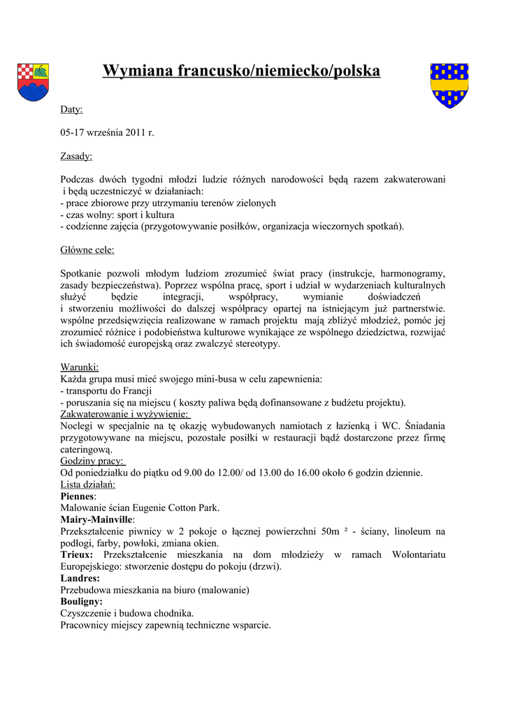 Wymiana francusko/niemiecko/polska Daty: 05-17 września 2011 r. Zasady: Podczas dwóch tygodni młodzi ludzie różnych narodowości będą razem zakwaterowani i będą uczestniczyć w działaniach: - prace zbiorowe przy utrzymaniu terenów zielonych - czas wolny: sport i kultura - codzienne zajęcia (przygotowywanie posiłków, organizacja wieczornych spotkań). Główne cele: Spotkanie pozwoli młodym ludziom zrozumieć świat pracy (instrukcje, harmonogramy, zasady bezpieczeństwa). Poprzez wspólna pracę, sport i udział w wydarzeniach kulturalnych służyć będzie integracji, współpracy, wymianie doświadczeń i stworzeniu możliwości do dalszej współpracy opartej na istniejącym już partnerstwie. wspólne przedsięwzięcia realizowane w ramach projektu mają zbliżyć młodzież, pomóc jej zrozumieć różnice i podobieństwa kulturowe wynikające ze wspólnego dziedzictwa, rozwijać ich świadomość europejską oraz zwalczyć stereotypy. Warunki: Każda grupa musi mieć swojego mini-busa w celu zapewnienia: - transportu do Francji - poruszania się na miejscu ( koszty paliwa będą dofinansowane z budżetu projektu). Zakwaterowanie i wyżywienie: Noclegi w specjalnie na tę okazję wybudowanych namiotach z łazienką i WC. Śniadania przygotowywane na miejscu, pozostałe posiłki w restauracji bądź dostarczone przez firmę cateringową. Godziny pracy: Od poniedziałku do piątku od 9.00 do 12.00/ od 13.00 do 16.00 około 6 godzin dziennie. Lista działań: Piennes: Malowanie ścian Eugenie Cotton Park. Mairy-Mainville: Przekształcenie piwnicy w 2 pokoje o łącznej powierzchni 50m ² - ściany, linoleum na podłogi, farby, powłoki, zmiana okien. Trieux: Przekształcenie mieszkania na dom młodzieży w ramach Wolontariatu Europejskiego: stworzenie dostępu do pokoju (drzwi). Landres: Przebudowa mieszkania na biuro (malowanie) Bouligny: Czyszczenie i budowa chodnika. Pracownicy miejscy zapewnią techniczne wsparcie.