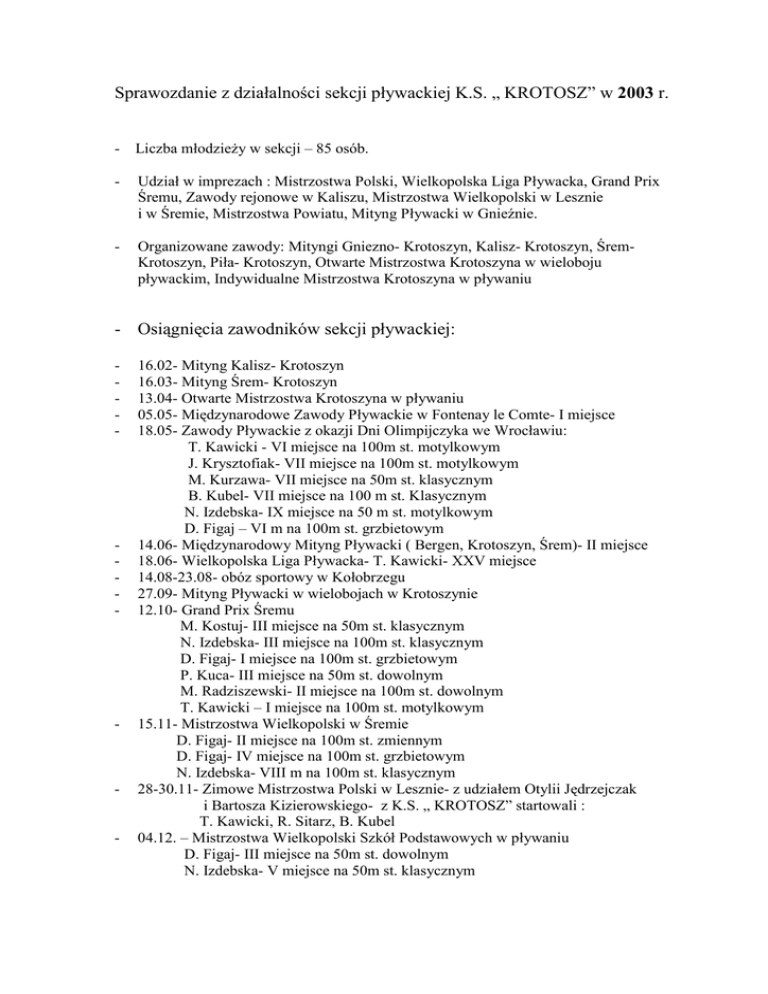 Sprawozdanie z działalności sekcji pływackiej K.S. „ KROTOSZ” w 2003 r. - Liczba młodzieży w sekcji – 85 osób. - Udział w imprezach : Mistrzostwa Polski, Wielkopolska Liga Pływacka, Grand Prix Śremu, Zawody rejonowe w Kaliszu, Mistrzostwa Wielkopolski w Lesznie i w Śremie, Mistrzostwa Powiatu, Mityng Pływacki w Gnieźnie. - Organizowane zawody: Mityngi Gniezno- Krotoszyn, Kalisz- Krotoszyn, ŚremKrotoszyn, Piła- Krotoszyn, Otwarte Mistrzostwa Krotoszyna w wieloboju pływackim, Indywidualne Mistrzostwa Krotoszyna w pływaniu - Osiągnięcia zawodników sekcji pływackiej: - - - - 16.02- Mityng Kalisz- Krotoszyn 16.03- Mityng Śrem- Krotoszyn 13.04- Otwarte Mistrzostwa Krotoszyna w pływaniu 05.05- Międzynarodowe Zawody Pływackie w Fontenay le Comte- I miejsce 18.05- Zawody Pływackie z okazji Dni Olimpijczyka we Wrocławiu: T. Kawicki - VI miejsce na 100m st. motylkowym J. Krysztofiak- VII miejsce na 100m st. motylkowym M. Kurzawa- VII miejsce na 50m st. klasycznym B. Kubel- VII miejsce na 100 m st. Klasycznym N. Izdebska- IX miejsce na 50 m st. motylkowym D. Figaj – VI m na 100m st. grzbietowym 14.06- Międzynarodowy Mityng Pływacki ( Bergen, Krotoszyn, Śrem)- II miejsce 18.06- Wielkopolska Liga Pływacka- T. Kawicki- XXV miejsce 14.08-23.08- obóz sportowy w Kołobrzegu 27.09- Mityng Pływacki w wielobojach w Krotoszynie 12.10- Grand Prix Śremu M. Kostuj- III miejsce na 50m st. klasycznym N. Izdebska- III miejsce na 100m st. klasycznym D. Figaj- I miejsce na 100m st. grzbietowym P. Kuca- III miejsce na 50m st. dowolnym M. Radziszewski- II miejsce na 100m st. dowolnym T. Kawicki – I miejsce na 100m st. motylkowym 15.11- Mistrzostwa Wielkopolski w Śremie D. Figaj- II miejsce na 100m st. zmiennym D. Figaj- IV miejsce na 100m st. grzbietowym N. Izdebska- VIII m na 100m st. klasycznym 28-30.11- Zimowe Mistrzostwa Polski w Lesznie- z udziałem Otylii Jędrzejczak i Bartosza Kizierowskiego- z K.S. „ KROTOSZ” startowali : T. Kawicki, R. Sitarz, B. Kubel 04.12. – Mistrzostwa Wielkopolski Szkół Podstawowych w pływaniu D. Figaj- III miejsce na 50m st. dowolnym N. Izdebska- V miejsce na 50m st. klasycznym - - 15.12- Grand prix Śremu T. Kawicki- I miejsce na 100m st. dowolnym B. Kubel- III miejsce na 100m st. dowolnym M. Radziszewski- III miejsce na 100m st.grzbietowym D. Figaj- I miejsce na 100m st. zmiennym M. Cegielska- III miejsce na 50m st. klasycznym B. Orpiszak- I miejsce na 50m st. dowolnym 21.12.- Mityng Pływacki- Koło- Piła- Krotoszyn- Gniezno- I miejsce Sekcja pływacka K.S. „ KROTOSZ” dokonała przy pomocy sponsorów zakupu zegara treningowego oraz koszulek klubowych. W kwietniu 2003r. odbył się kurs sędziego pływania, który ukończyło 23 osoby. Od 06.12.03 odbywa się kurs instruktora pływania, w którym bierze udział 16 osób.