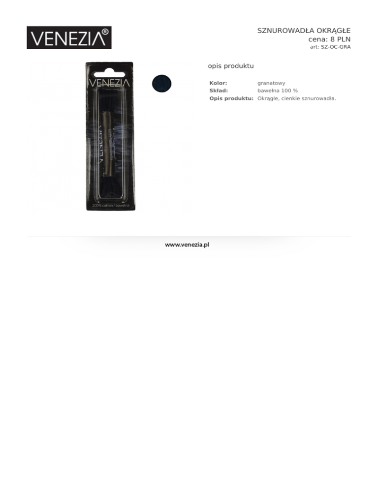 SZNUROWADŁA OKRĄGŁE cena: 8 PLN art: SZ-OC-GRA opis produktu Kolor: granatowy Skład: bawełna 100 % Opis produktu: Okrągłe, cienkie sznurowadła.