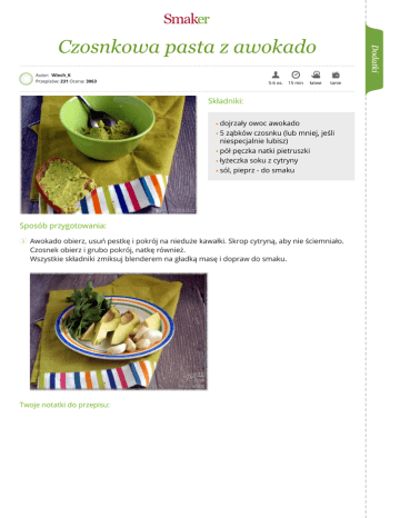 Czosnkowa pasta z awokado Autor: Wiech_K Przepisów: 231 Ocena: 3063 5-6 os. 15 min łatwe tanie Składniki: dojrzały owoc awokado 5 ząbków czosnku (lub mniej, jeśli niespecjalnie lubisz) pół pęczka natki pietruszki łyżeczka soku z cytryny sól, pieprz - do smaku Sposób przygotowania: 1 Awokado obierz, usuń pestkę i pokrój na nieduże kawałki. Skrop cytryną, aby nie ściemniało. Czosnek obierz i grubo pokrój, natkę również. Wszystkie składniki zmiksuj blenderem na gładką masę i dopraw do smaku. Twoje notatki do przepisu: