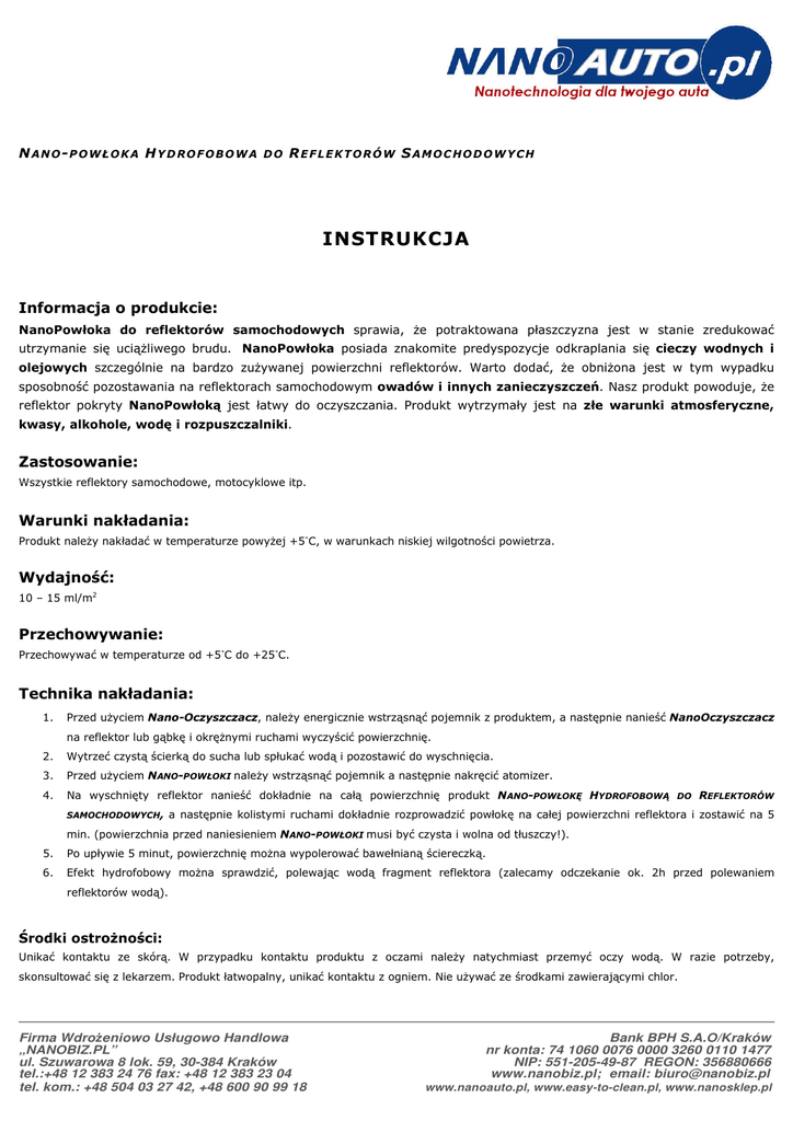 NANO-POWŁOKA HYDROFOBOWA DO REFLEKTORÓW SAMOCHODOWYCH INSTRUKCJA Informacja o produkcie: NanoPowłoka do reflektorów samochodowych sprawia, że potraktowana płaszczyzna jest w stanie zredukować utrzymanie się uciążliwego brudu. NanoPowłoka posiada znakomite predyspozycje odkraplania się cieczy wodnych i olejowych szczególnie na bardzo zużywanej powierzchni reflektorów. Warto dodać, że obniżona jest w tym wypadku sposobność pozostawania na reflektorach samochodowym owadów i innych zanieczyszczeń. Nasz produkt powoduje, że reflektor pokryty NanoPowłoką jest łatwy do oczyszczania. Produkt wytrzymały jest na złe warunki atmosferyczne, kwasy, alkohole, wodę i rozpuszczalniki. Zastosowanie: Wszystkie reflektory samochodowe, motocyklowe itp. Warunki nakładania: Produkt należy nakładać w temperaturze powyżej +5˚C, w warunkach niskiej wilgotności powietrza. Wydajność: 10 – 15 ml/m2 Przechowywanie: Przechowywać w temperaturze od +5˚C do +25˚C. Technika nakładania: 1. Przed użyciem Nano-Oczyszczacz, należy energicznie wstrząsnąć pojemnik z produktem, a następnie nanieść NanoOczyszczacz 2. Wytrzeć czystą ścierką do sucha lub spłukać wodą i pozostawić do wyschnięcia. 3. Przed użyciem NANO-POWŁOKI należy wstrząsnąć pojemnik a następnie nakręcić atomizer. na reflektor lub gąbkę i okrężnymi ruchami wyczyścić powierzchnię. 4. Na wyschnięty reflektor nanieść dokładnie na całą powierzchnię produkt NANO-POWŁOKĘ HYDROFOBOWĄ DO REFLEKTORÓW SAMOCHODOWYCH, a następnie kolistymi ruchami dokładnie rozprowadzić powłokę na całej powierzchni reflektora i zostawić na 5 min. (powierzchnia przed naniesieniem NANO-POWŁOKI musi być czysta i wolna od tłuszczy!). 5. Po upływie 5 minut, powierzchnię można wypolerować bawełnianą ściereczką. 6. Efekt hydrofobowy można sprawdzić, polewając wodą fragment reflektora (zalecamy odczekanie ok. 2h przed polewaniem reflektorów wodą). Środki ostrożności: Unikać kontaktu ze skórą. W przypadku kontaktu produktu z oczami należy natychmiast przemyć oczy wodą. W razie potrzeby, skonsultować się z lekarzem. Produkt łatwopalny, unikać kontaktu z ogniem. Nie używać ze środkami zawierającymi chlor. Firma Wdrożeniowo Usługowo Handlowa „NANOBIZ.PL” ul. Szuwarowa 8 lok. 59, 30-384 Kraków tel.:+48 12 383 24 76 fax: +48 12 383 23 04 tel. kom.: +48 504 03 27 42, +48 600 90 99 18 Bank BPH S.A.O/Kraków nr konta: 74 1060 0076 0000 3260 0110 1477 NIP: 551-205-49-87 REGON: 356880666 www.nanobiz.pl; email: [email protected] www.nanoauto.pl, www.easy-to-clean.pl, www.nanosklep.pl