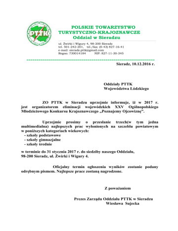 POLSKIE TOWARZYSTWO TURYSTYCZNO-KRAJOZNAWCZE Oddział w Sieradzu __________________________________________________________________________________________________________________________________________________________________________________________________________________________ ul. Żwirki i Wigury 4, 98-200 Sieradz tel. 501-242-201, tel./fax: (0-43) 827-16-41 e-mail: [email protected] Regon: 730014184 NIP: 827-11-30-345 ================================================================= Sieradz, 10.12.2016 r. Oddziały PTTK Województwa Łódzkiego ZO PTTK w Sieradzu uprzejmie informuje, iż w 2017 r. jest organizatorem eliminacji wojewódzkich XXV Ogólnopolskiego Młodzieżowego Konkursu Krajoznawczego „Poznajemy Ojcowiznę”. Uprzejmie prosimy o przesłanie trzech(w tym jedna multimedialna) najlepszych prac wyłonionych na szczeblu powiatowym w poniższych kategoriach wiekowych: - szkoły podstawowe - szkoły gimnazjalne - szkoły średnie w terminie do 31 stycznia 2017 r. do siedziby naszego Oddziału, 98-200 Sieradz, ul. Żwirki i Wigury 4. Oficjalny termin ogłoszenia wyników zostanie podany odrębnym pismem. Najlepsze prace zostaną nagrodzone. Z poważaniem Prezes Zarządu Oddziału PTTK w Sieradzu Wiesława Sujecka