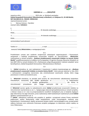 UMOWA nr ………./2015/POŚ zawarta w dniu ……………….…………… 2015 roku w Mońkach pomiędzy: Zakład Gospodarki Komunalnej i Mieszkaniowej w Mońkach, ul. Kolejowa 21, 19-100 Mońki, NIP 546-000-05-53, REGON 050501418 reprezentowanym przez: 1. Mariusz Kulesza – Dyrektor zwanym dalej Zakładem a 1. ................................................................. Nr dowodu osobistego.................................................. PESEL….. ........................................... , 2.................................................................... Nr dowodu osobistego................................................. PESEL ............................................... , zamieszkałym/i pod adresem: ………………………………………….……………………………………………………………… ………………………………………………………..………………………………………………………………………………………………… Telefon nr ………………………………………………………, e-mail: …………………………………………………………………… zwanym/i dalej Właścicielem, o następującej treści: §1 Przedmiotem umowy jest ustalenie wzajemnych zobowiązań organizacyjnych i finansowych, związanych z budową przydomowej oczyszczalni ścieków na nieruchomości Właściciela, realizowanej w ramach projektu „Budowa przydomowych oczyszczalni ścieków na terenie Gminy Mońki” współfinansowanej ze środków Unii Europejskiej z Programu Rozwoju Obszarów Wiejskich na lata 2007-2013 w ramach działania 321 „Podstawowe usługi dla gospodarki i ludności wiejskiej” przez beneficjenta tj. Zakład Gospodarki Komunalnej i Mieszkaniowej w Mońkach. §2 1. Zakład oświadcza, że jest realizatorem [ inwestorem ] zadania inwestycyjnego pn.: „Budowa przydomowych oczyszczalni ścieków na terenie Gminy Mońki”, które planuje wykonać w roku 2015 z zachowaniem szczególnej staranności, aby zminimalizować ewentualne szkody, które mogą powstawać w trakcie prowadzenia prac. §3 1. Właściciel oświadcza, że posiada tytuł prawny do nieruchomości zabudowanej budynkiem mieszkalnym, oznaczonej jako działka geodezyjna nr………………………..……, w miejscowości …......................................, w obrębie geodezyjnym.........................................., dla której to nieruchomości prowadzona jest księga wieczysta KW nr ……………………… ….................................................................................................................................................. 2. Właściciel wyraża zgodę na wybudowanie przez Zakład przydomowej oczyszczalni ścieków na nieruchomości wymienionej w ust. 1, będącej jego własnością/współwłasnością w ramach projektu, o którym mowa w § 1 oraz na przeprowadzenie wszelkich niezbędnych prac w budynku będącym jego własnością oraz jego otoczeniu, przez wykonawcę robót budowlanych wyłonionym przed Zakład zgodnie z postanowieniami ust. 3. 3. Zakład zabezpieczy realizację celu projektu tj. zgodnie z przepisami ustawy Prawo zamówień publicznych wyłoni Wykonawcę robót budowlanych, ustali harmonogram realizacji prac budowlanych i montażowych, będzie sprawować bieżący nadzór nad przebiegiem prac, przeprowadzi odbiory końcowe oraz rozliczenie finansowe projektu polegające na dokonaniu całości zapłaty na rzecz Wykonawcy. 1|S t r o n a Zakład Gospodarki Komunalnej i Mieszkaniowej w Mońkach, ul. Kolejowa 21, 19 – 100 Mońki, tel. 85 716 27 64, e-mail: [email protected], www.zgkimmonki.pl 4. Wykonawca robót budowlanych wyłoniony przez Zakład, zgodnie z postanowieniami ust. 3, dokona budowy przydomowej oczyszczalni ścieków, montażu urządzeń towarzyszących, włączenia do instalacji kanalizacyjnej oraz instalacji elektrycznej w budynku Właściciela, uruchomienia oraz przeszkolenia Właściciela z zakresu obsługi i eksploatacji oczyszczalni. 5. Właściciel udziela dla Zakładu prawa dysponowania nieruchomością o której mowa w ust. 1, na cele realizacji projektu. 6. Właściciel oświadcza, że nieruchomość wymieniona w ust. 1 zabudowana jest budynkiem mieszkalnym posiadając tym samym warunki techniczne umożliwiające budowę przydomowej oczyszczalni ścieków tj: a) budynek mieszkalny wyposażony jest w instalację wodociągową i kanalizacyjną, b) budynek posiada zasilanie energii elektrycznej oraz wyposażony jest w wewnętrzną, wykonaną zgodnie z obowiązującymi przepisami, instalację elektryczną umożliwiającą podłączenie urządzeń przydomowej oczyszczalni ścieków, c) nieruchomość posiada zapas wolnego terenu umożliwiający montaż przydomowej oczyszczalni ścieków wraz z urządzeniami towarzyszącymi, 7. Właściciel oświadcza, że jest świadomy, iż w ramach projektu wsparciem nie mogą zostać objęte budynki, w których prowadzona jest działalność komercyjna. (Należy przez to rozumieć: przedsiębiorstwo w rozumieniu art. 1 załącznika I do rozporządzenia Komisji (WE) NR 800/2008 z dnia 6 sierpnia 2008 r. uznające niektóre rodzaje pomocy za zgodne ze wspólnym rynkiem w zastosowaniu art. 87 i 88 Traktatu (ogólne rozporządzenie w sprawie wyłączeń blokowych) Dz.U. UE L Nr 214 z 9.8.2008. Zgodnie z przywołanym tu przepisem za przedsiębiorstwo uważa się podmiot prowadzący działalność gospodarczą bez względu na jego formę prawną. W świetle orzecznictwa ETS „działalnością gospodarczą” jest wszelka działalność polegająca na oferowaniu dóbr i usług na określonym rynku.) 8. W przypadku, gdy w okresie od wybudowania przydomowej oczyszczalni ścieków do zakończenia trwałości projektu, na nieruchomości, o której mowa w ust. 1, Właściciel rozpocznie działalność komercyjną, powinien zgłosić Zakładowi ten fakt, a uzyskaną pomoc uznać za „p