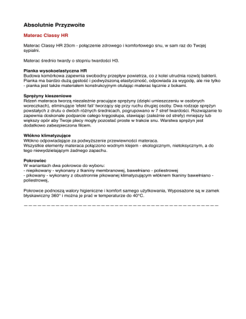 Absolutnie Przyzwoite Materac Classy HR Materac Classy HR 23cm - połączenie zdrowego i komfortowego snu, w sam raz do Twojej sypialni. Materac średnio twardy o stopniu twardości H3. Pianka wysokoelastyczna HR Budowa komórkowa zapewnia swobodny przepływ powietrza, co z kolei utrudnia rozwój bakterii. Pianka ma bardzo dużą gęstość i podwyższoną elastyczność, odpowiada za wygodę, ale nie tylko - pianka jest także materiałem konstrukcyjnym otulając materac łącznie z bokami. Sprężyny kieszeniowe Rdzeń materaca tworzą niezależnie pracujące sprężyny (dzięki umieszczeniu w osobnych woreczkach), eliminujące 'efekt fali' tworzący się przy ruchu drugiej osoby. Dwa rodzaje sprężyn powstałych z drutu o dwóch różnych średnicach, pogrupowano w 7 stref twardości. Rozwiązanie to zapewnia doskonałe podparcie całego kręgosłupa, stawiając (zależnie od strefy) mniejszy lub większy opór aby Twoje plecy mogły pozostać proste w trakcie snu. Warstwa sprężyn jest dodatkowo zabezpieczona filcem. Włókno klimatyzujące Włókno odpowiadające za podwyższenie przewiewności materaca. Wszystkie elementy materaca połączono wodnym klejem - ekologicznym, nietoksycznym, a do tego niewydzielającym żadnego zapachu. Pokrowiec W wariantach dwa pokrowce do wyboru: - niepikowany - wykonany z tkaniny membranowej, bawełniano - poliestrowej - pikowany - wykonany z obustronnie pikowanej klimatyzującym włóknem tkaniny bawełniano poliestrowej, Pokrowce podnoszą walory higieniczne i komfort samego użytkowania, Wyposażone są w zamek błyskawiczny 360° i można je prać w temperaturze do 40°C. ———————————————————————————————————————————