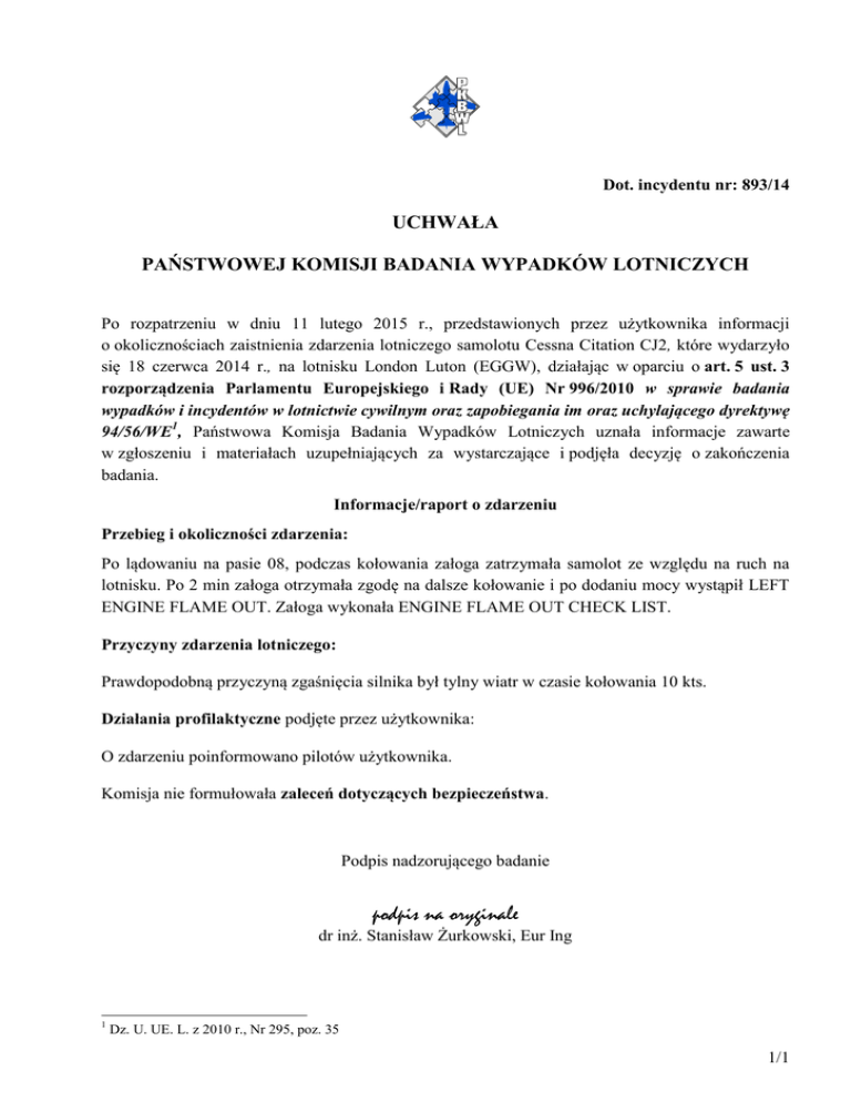 Dot. incydentu nr: 893/14 UCHWAŁA PAŃSTWOWEJ KOMISJI BADANIA WYPADKÓW LOTNICZYCH Po rozpatrzeniu w dniu 11 lutego 2015 r., przedstawionych przez użytkownika informacji o okolicznościach zaistnienia zdarzenia lotniczego samolotu Cessna Citation CJ2, które wydarzyło się 18 czerwca 2014 r., na lotnisku London Luton (EGGW), działając w oparciu o art. 5 ust. 3 rozporządzenia Parlamentu Europejskiego i Rady (UE) Nr 996/2010 w sprawie badania wypadków i incydentów w lotnictwie cywilnym oraz zapobiegania im oraz uchylającego dyrektywę 94/56/WE1, Państwowa Komisja Badania Wypadków Lotniczych uznała informacje zawarte w zgłoszeniu i materiałach uzupełniających za wystarczające i podjęła decyzję o zakończenia badania. Informacje/raport o zdarzeniu Przebieg i okoliczności zdarzenia: Po lądowaniu na pasie 08, podczas kołowania załoga zatrzymała samolot ze względu na ruch na lotnisku. Po 2 min załoga otrzymała zgodę na dalsze kołowanie i po dodaniu mocy wystąpił LEFT ENGINE FLAME OUT. Załoga wykonała ENGINE FLAME OUT CHECK LIST. Przyczyny zdarzenia lotniczego: Prawdopodobną przyczyną zgaśnięcia silnika był tylny wiatr w czasie kołowania 10 kts. Działania profilaktyczne podjęte przez użytkownika: O zdarzeniu poinformowano pilotów użytkownika. Komisja nie formułowała zaleceń dotyczących bezpieczeństwa. Podpis nadzorującego badanie podpis na oryginale dr inż. Stanisław Żurkowski, Eur Ing 1 Dz. U. UE. L. z 2010 r., Nr 295, poz. 35 1/1