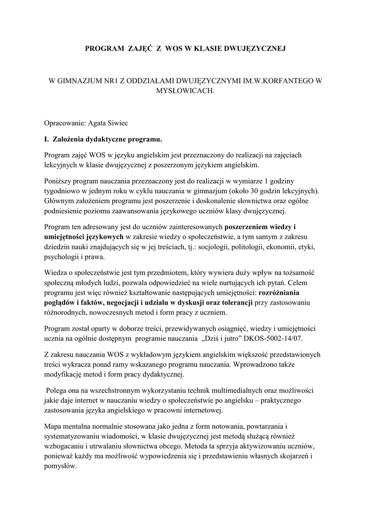 PROGRAM ZAJĘĆ Z WOS W KLASIE DWUJĘZYCZNEJ W GIMNAZJUM NR1 Z ODDZIAŁAMI DWUJĘZYCZNYMI IM.W.KORFANTEGO W MYSŁOWICACH. Opracowanie: Agata Siwiec I. Założenia dydaktyczne programu. Program zajęć WOS w języku angielskim jest przeznaczony do realizacji na zajęciach lekcyjnych w klasie dwujęzycznej z poszerzonym językiem angielskim. Poniższy program nauczania przeznaczony jest do realizacji w wymiarze 1 godziny tygodniowo w jednym roku w cyklu nauczania w gimnazjum (około 30 godzin lekcyjnych). Głównym założeniem programu jest poszerzenie i doskonalenie słownictwa oraz ogólne podniesienie poziomu zaawansowania językowego uczniów klasy dwujęzycznej. Program ten adresowany jest do uczniów zainteresowanych poszerzeniem wiedzy i umiejętności językowych w zakresie wiedzy o społeczeństwie, a tym samym z zakresu dziedzin nauki znajdujących się w jej treściach, tj.: socjologii, politologii, ekonomii, etyki, psychologii i prawa. Wiedza o społeczeństwie jest tym przedmiotem, który wywiera duży wpływ na tożsamość społeczną młodych ludzi, pozwala odpowiedzieć na wiele nurtujących ich pytań. Celem programu jest więc również kształtowanie następujących umiejętności: rozróżniania poglądów i faktów, negocjacji i udziału w dyskusji oraz tolerancji przy zastosowaniu różnorodnych, nowoczesnych metod i form pracy z uczniem. Program został oparty w doborze treści, przewidywanych osiągnięć, wiedzy i umiejętności ucznia na ogólnie dostępnym programie nauczania „Dziś i jutro” DKOS-5002-14/07. Z zakresu nauczania WOS z wykładowym językiem angielskim większość przedstawionych treści wykracza ponad ramy wskazanego programu nauczania. Wprowadzono także modyfikację metod i form pracy dydaktycznej. Polega ona na wszechstronnym wykorzystaniu technik multimedialnych oraz możliwości jakie daje internet w nauczaniu wiedzy o społeczeństwie po angielsku – praktycznego zastosowania języka angielskiego w pracowni internetowej. Mapa mentalna normalnie stosowana jako jedna z form notowania, powtarzania i systematyzowaniu wiadomości, w klasie dwujęzycznej jest metodą służącą również wzbogacaniu i utrwalaniu słownictwa obcego. Metoda ta sprzyja aktywizowaniu uczniów, ponieważ każdy ma możliwość wypowiedzenia się i przedstawieniu własnych skojarzeń i pomysłów. Portfolio językowe jest z kolei techniką uczącą wyszukiwania, segregowaniu materiałów na jeden temat. Uczniowie przez pewien czas przygotowują teczki z materiałami związanymi z podanymi przez nauczyciela zagadnieniem. Uczą się korzystać z różnych źródeł informacji (np. prasy, encyklopedii, internetu), mogą wymieniać się materiałami. Powyższe założenia i metody mają służyć podniesieniu i poszerzeniu kompetencji językowych uczniów klasy dwujęzycznej, a także poszerzeniu ich wiedzy z zakresu wiedzy o społeczeństwie. Program składa się z odrębnych modułów, szczegółowo scharakteryzowanych w załączonej tabeli 1.W ramach poszczególnych modułów przedstawiony został podział na jednostki tematyczne. Każda jednostka tematyczna zawiera wykaz treści nauczania, szczegółowych celów i osiągnięć ucznia oraz procedury osiągania celu. Korzystając z tego wykazu, można ułożyć dyspozycje do poszczególnych zajęć lekcyjnych, sformułować pytania sprawdzające wiadomości, umiejętności i postawy uczniów, a dzięki posegregowaniu w planach wynikowych osiągnięć według dwóch poziomów - podstawowego oraz rozszerzonego – można także podać i uzasadnić ocenę postępów w nauce. Poziom rozszerzony opracowany jest dla ucznia, wykazującego chęć gruntownego przygotowania się do gimnazjalnego egzaminu zewnętrznego lub językowego. Program jest tak skonstruowany, aby zapewnić każdemu uczestniczącemu w nim uczniowi osiąganie systematycznych postępów. Daje on także możliwość bieżącego monitorowania osiągnięć edukacyjnych uczniów (portfolia językowe, prace projektowe, prezentacje). II. Oczekiwane efekty, zmiany i rezultaty w wyniku realizacji programu. 1. Pozytywne zmiany w zakresie kształcenia i wychowania: • wysokie wyniki dydaktyczne uczniów objętych programem, • wyższe wyniki klasyfikacji semestralnej i końcoworocznej z języka angielskiego uczniów objętych programem, • doskonalenie kompetencji językowych ucznia, • większa aktywizacja ucznia na zajęciach, • zaangażowanie uczniów w dodatkowe zadania wynikające z realizacji założeń programu, • praca uczniów w toku poszukującym – dążenie do postawy ucznia autonomicznego, świadomego własnego potencjału i ograniczeń, • wykształcenie u uczniów postawy tolerancji oraz konieczności przestrzegania niezbywalnych praw każdego człowieka, • kształtowanie wartości obywatelskich, humanistycznych i uniwersalnych na tle dokonywających się współcześnie przemian społecznych, • rozwijanie świadomości wspólnoty interesów społecznych, wzajemnej odpowiedzialności i współuczestnictwa w podejmowaniu decyzji w ramach procedur demokratycznych. 2. Pozytywne efekty zmian metodycznych: • wprowadzenie różnorodnej oferty metod i form pracy dydaktycznej, • integracja wiedzy i umiejętności z zakresu języka obcego oraz dyscyplin składających się na wiedzę o społeczeństwie, • doskonalenie warsztatu metodycznego nauczyciela, • zaktywizowanie ucznia, szersze włączenie go do procesu dydaktycznego, • upowszechnienie posługiwania się technologią informatyczną oraz technikami multimedialnymi, Ustalone kryteria sukcesu w odniesieniu do oczekiwanych efektów realizacji programu: • wyższe wyniki klasyfikacji semestralnej i końcoworocznej z języka angielskiego uczniów objętych programem w porównaniu z oddziałami równoległymi, • pozytywne wyniki przeprowadzonych hospitacji diagnozujących i oceniających, • znaczące sukcesy uczniów w konkursach, turniejach na szczeblu miejskim i regionalnym, 