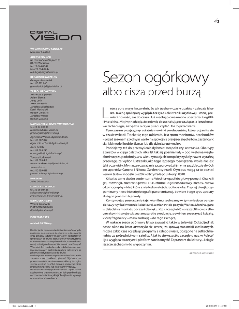 2/3 WYDAWNICTWO KENGRAF Mirosław Kiapśnia ADRES REDAKCJI ul. Powstańców Śląskich 30 01-381 Warszawa tel. 22 664 05 42 faks 22 664 05 44 [email protected] REDAKTOR NACZELNY Grzegorz Mosieniak tel. 510 211 906 [email protected] ZESPÓŁ REDAKCYJNY Arkadiusz Bąkowski Adam Biernat Jerzy Lech Artur Łuszczek Jarosław Mikołajczuk Karol Muchalski Robert Urbański Jarosław Wawer Roman Zabawa DZIAŁ MARKETINGU I KOMUNIKACJI tel. 22 664 05 43 [email protected] [email protected] Agnieszka Wolska, dyrektor działu tel. 510 087 092 [email protected] Anna Gotlib tel. 512 005 245 [email protected] Tomasz Rurkowski tel. 512 005 412 [email protected] Joanna Sabat tel. 510 199 441 [email protected] KOREKTA Julita Olszewska DZIAŁ DYSTRYBUCJI tel. 22 664 04 36 [email protected] [email protected] DZIAŁ GRAFICZNY Wojtek Jankowski Piotr Szczupakowski [email protected] ISSN 2081-2019 nakład: 18 750 egz. Redakcja nie zwraca materiałów niezamówionych, zastrzega sobie prawo do skrótów, redagowania oraz zmiany tytułów materiałów nadesłanych i przyjętych do druku, a tak że do ich wykorzystania w Internecie oraz w innych mediach, w ramach promocji miesięcznika oraz Wydawnictwa Kengraf. Wszystkie listy nadesłane do redakcji niezawierające specjalnych zastrzeżeń autora traktowane są jako materiały nadesłane do druku. Redakcja nie ponosi odpowiedzialności za treść zamieszczonych reklam i ogłoszeń. Wydawca ma prawo odmówić zamieszczenia reklamy lub ogłoszenia, jeżeli ich treść lub forma są sprzeczne z linią programową pisma lub interesem wydawcy. Wszystkie materiały publikowane w Digital Vision są chronione prawem autorskim i ich przedruk bądź rozpowszechnianie w jakiejkolwiej formie wymaga pisemnej zgody wydawcy. 003 - od redakcji.indd 3 Sezon ogórkowy albo cisza przed burzą L etnią porą wszystko zwalnia. Bo tak trzeba w czasie upałów – zalecają lekarze. Trochę spokojniej wygląda też rynek elektroniki użytkowej – mniej premier i nowości, ale do czasu. Już niedługo dwa mocne uderzenia: targi IFA i Photokina. Miejmy nadzieję, że pojawią się zaskakujące rozwiązania i przełomowe technologie, że będzie o czym pisać i czytać. Ale to przed nami. Tymczasem przejrzyjmy ostatnie nowinki producentów, które pojawiły się w czasie wakacji. Trochę się tego uzbierało. Jest sporo monitorów, notebooków – przed sezonem szkolnym warto na spokojnie przyjrzeć się ofertom, zastanowić się, jaki model będzie dla nas lub dla dziecka optymalny. Poddajemy też do przemyślenia dylemat: kompakt czy lustrzanka. Oba typy aparatów w ciągu ostatnich kilku lat tak się pozmieniały – pod wieloma względami wręcz upodobniły, a w wielu sytuacjach kompakty zyskały nawet wyraźną przewagę, że wybór lustrzanki jako tego lepszego rozwiązania, wcale nie jest taki oczywisty. My nasze rozważania przeprowadziliśmy na przykładzie dwóch par aparatów Canona i Nikona. Zwolennicy marki Olympus mogą za to poznać wyniki testów modelu E-620 i wytrzymałego µ-Tough 8010. Kilka lat temu dwóm studentom z Wiednia wpadł do głowy pomysł. Chwycili go, rozwinęli, rozpropagowali i uruchomili ogólnoświatowy biznes. Mowa o Lomography – idei, która z niedoskonałości zrobiła sztukę. Przy tej okazji przypominamy nieco historię fotografii panoramicznej, bowiem i tego typu aparaty służą pasjonatom tej mody. Kontynuując poznawanie tajników filmu, polecamy w tym miesiącu bardzo ciekawy wykład w formie książkowej, a mianowicie pozycję Waltera Murcha, guru w dziedzinie montażu obrazu i dźwięku. Kto chce zgłębić warsztat filmowca albo uatrakcyjnić swoje własne amatorskie produkcje, powinien przeczytać książkę, której fragmenty – mam nadzieję – do tego zachęcą. W wakacje sezon ogórkowy łatwo zauważyć także w telewizji. Odkąd jednak nasze okno na świat otworzyło się szerzej za sprawą transmisji satelitarnych, można zabić czas oglądając programy z całego świata, dostępne na setkach kanałów za pośrednictwem satelity. A jak to się wszystko zaczęło u nas, w Polsce? I jak wygląda teraz rynek platform satelitarnych? Zapraszam do lektury... i ciągle jeszcze zachęcam do wypoczynku. GRZEGORZ MOSIENIAK 2010-08-09 11:49:50