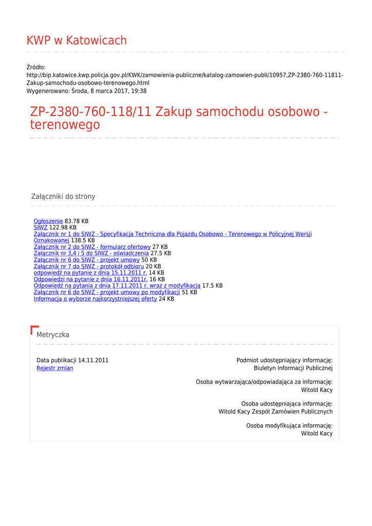 KWP w Katowicach Źródło: http://bip.katowice.kwp.policja.gov.pl/KWK/zamowienia-publiczne/katalog-zamowien-publi/10957,ZP-2380-760-11811Zakup-samochodu-osobowo-terenowego.html Wygenerowano: Środa, 8 marca 2017, 19:38 ZP-2380-760-118/11 Zakup samochodu osobowo terenowego Załączniki do strony Ogłoszenie 83.78 KB SIWZ 122.98 KB Załącznik nr 1 do SIWZ - Specyfikacja Techniczna dla Pojazdu Osobowo - Terenowego w Policyjnej Wersji Oznakowanej 138.5 KB Załącznik nr 2 do SIWZ - formularz ofertowy 27 KB Załącznik nr 3,4 i 5 do SIWZ - oświadczenia 27.5 KB Załącznik nr 6 do SIWZ - projekt umowy 50 KB Załącznik nr 7 do SIWZ - protokół odbioru 20 KB odpowiedź na pytanie z dnia 15.11.2011 r. 14 KB Odpowiedzi na pytanie z dnia 16.11.2011r. 16 KB Odpowiedź na pytania z dnia 17.11.2011 r. wraz z modyfikacją 17.5 KB Załącznik nr 6 do SIWZ - projekt umowy po modyfikacji 51 KB Informacja o wyborze najkorzystniejszej oferty 24 KB Metryczka Data publikacji 14.11.2011 Rejestr zmian Podmiot udostępniający informację: Biuletyn Informacji Publicznej Osoba wytwarzająca/odpowiadająca za informację: Witold Kacy Osoba udostępniająca informację: Witold Kacy Zespół Zamówien Publicznych Osoba modyfikująca informację: Witold Kacy