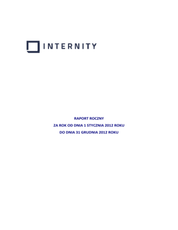 RAPORT ROCZNY ZA ROK OD DNIA 1 STYCZNIA 2012 ROKU DO DNIA 31 GRUDNIA 2012 ROKU SPIS TREŚCI 1. PISMO PREZESA ZARZĄDU 2. PODSTAWOWE DANE FINANSOWE (W TYS. EUR) 3. SPRAWOZDANIE FINANSOWE 4. SPRAWOZDANIE ZARZĄDU 5. OŚWIADCZENIA ZARZĄDU 6. INFORMACJA O STOSOWANIU ZASAD ŁADU KORPORACYJNEGO 7. OPINIA ORAZ RAPORT BIEGŁEGO REWIDENTA Pismo Prezesa Zarządu Warszawa, 7 czerwca 2013 r. Szanowni Akcjonariusze, Pracownicy i Partnerzy, INTERNITY S.A. (Spółka) jest spółką specjalizującą się w sprzedaży produktów wyposażenia wnętrz w segmencie średnim-wysokim oraz luksusowym, a także na rynku inwestycyjnym. Zarząd Internity S.A. kontynuował w 2012 roku strategię rozwoju spółki. Niestety pomimo silnego wzrostu sprzedaży w pierwszym kwartale 2012 roku (około 30%) w kolejnych kwartałach Internity zanotowało stabilizację i spadki sprzedaży w stosunku do roku 2011. W konsekwencji sprzedaż spółki ukształtowała się na zbliżonym poziomie do roku 2011. Zgodnie z szacunkami Zarządu spółki segment rynku wyposażenia wnętrz, na którym funkcjonuje spółka, skurczył się o kolejne 10%. W warunkach zmniejszającej się wartości rynku, Zarząd koncentrował się na podniesieniu efektywności działania procesów wewnętrznych w firmie, restrukturyzacji kosztowej i organizacyjnej oraz zwiększaniu udziału w rynku. Spółka Internity osiągnęła w roku 2012 przychody ze sprzedaży w wysokości 65 491 tys. złotych, które w porównaniu do roku 2011 były na zbliżonym poziomie. Utrzymanie takiego wyniku jest efektem realizowanej strategii rozwoju firmy. W strategii realizowanej przez Zarząd Internity rok 2012 był rokiem rozpoczęcia procesów restrukturyzacyjnych mających na celu: zmniejszenie liczby salonów sprzedaży w Warszawie przy jednoczesnym zwiększeniu powierzchni jednego z nich oraz równoczesnym wprowadzeniem pełnego zakresu produktów niezbędnych do wyposażenia wnętrz (tapety, farby, wykładziny, oświetlenie, drzwi, kuchnie) tworzenia nowych narzędzi softwarowych do obsługi kluczowych klientów spółki, w tym do aktywnej komunikacji z klientami poszukującymi produktów wyposażenia wnętrz w internecie. Wynik netto za 2012 roku wyniósł 945 tys. złotych. Zysk 2012 roku był także był wynikiem rozpoznania zysku z tytułu aktualizacji wyceny nieruchomości, o czym spółka informowała w swoich raportach kwartalnych. Wszelkie informacje na ten temat były szczegółowo publikowane w komunikatach oraz raportach kwartalnych. W ocenie Zarządu rok 2013 będzie dla spółki rokiem poważnych wyzwań w zakresie poszerzenie oferty, restrukturyzacji kosztowej i proponowania klientom kompleksowych rozwiązań wyposażenia wnętrz. Koszty tego procesu mogą jednorazowo obniżać wyniki rentowności spółki w najbliższych kwartałach. Dodatkowo spodziewamy się, iż rynek, na którym działa spółka zmniejszy się w przedziale 15-20% w 2013 roku. Utrzymanie poziomu sprzedaży z 2012 roku będzie trudnym wyzwaniem dla Spółki, ale Zarząd spodziewa się pozytywnych efektów działań restrukturyzacyjnych w II lub III kwartale 2013 roku, które spowodują zatrzymanie spadków a następnie wzrost przychodów. Z poważaniem, Piotr Grupiński Prezes Zarządu INTERNITY S.A. WYBRANE DANE FINANSOWE KAPITAŁ WŁASNY NALEŻNOŚCI DŁUGOTERMINOWE NALEŻNOŚCI KRÓTKOTERMINOWE ZAPASY ŚRODKI PIENIEŻNE I INNE AKTYWA ZOBOWIĄZANIA DŁUGOTERMINOWE ZOBOWIĄZANIA KRÓTKOTERMINOWE PRZEPŁYWY PIENIĘŻNE NETTO RAZEM AMORTYZACJA PRZYCHODY ZE SPRZEDAŻY ZYSK/STRATA ZE SPRZEDAŻY ZYSK/STRATA Z DZIAŁALNOŚCI OPERACYJNEJ ZYSK BRUTTO ZYSK NETTO LICZBA AKCJI ZYSK NA 1 AKCJĘ (ZŁ/ EURO) 31-12-2012 w tys. PLN w tys. EUR 16 634 4 069 9 403 2 300 9 186 2 247 152 37 3 935 962 14 893 3 643 5 1 1 028 246 65 491 15 692 88 21 2 400 1 425 945 8 330 000 0.11 575 341 226 8 330 000 0.03 31-12-2011 w tys. PLN w tys. EUR 17 189 3 892 13 185 2 985 8 156 1 847 147 33 666 151 14 632 3 313 23 6 1 197 289 65 898 15 917 1 295 313 7 807 6 818 6 351 8 330 000 0.76 1 886 1 647 1 534 8 330 000 0.18 Wybrane dane finansowe zawarte w niniejszym raporcie zostały przeliczone na EURO według następujących zasad: poszczególne pozycje aktywów i pasywów – według średniego kursu ogłoszonego na dzień 31 grudnia 2011 r. przez Narodowy Bank Polski (4,4168 zł / EURO) oraz według średniego kursu ogłoszonego na dzień 31 grudnia 2012 r. przez Narodowy Bank Polski (4,0882 zł / EURO) poszczególne pozycje sprawozdania z całkowitych dochodów oraz sprawozdania z przepływów środków pieniężnych – według kursu stanowiącego średnią arytmetyczną średnich kursów ustalonych przez Narodowy Bank Polski na ostatni dzień każdego zakończonego miesiąca okresu sprawozdawczego – odpowiednio 4,1401 zł / EURO na dzień 31.12.2011 roku oraz 4,1736 zł / EURO na dzień 31.12.2012 roku. SPRAWOZDANIE FINANSOWE INTERNITY SA ZA ROK OBROTOWY OD DNIA 1 STYCZNIA 2012 ROKU DO DNIA 31 GRUDNIA 2012 ROKU SPIS TREŚCI 1. 2. 3. 4. 5. 6. 7. 8. 9. 10. 11. a) b) c) d) e) f) g) h) i) j) k) l) m) n) o) p) q) 12. 13. 14. 15. 16. 17. 18. 19. 20. 21. 22. 23. 24. 25. 26. 27. 28. 29. 30. Sprawozdanie z sytuacji finansowej........................................................................................... 5 Sprawozdanie z całkowitych dochodów .................................................................................... 6 Sprawozdanie ze zmian w kapitale własnym ............................................................................. 7 Sprawozdanie z przepływów pieniężnych.................................................................................. 8 Podstawowe informacje o Spółce ............................................................................................ 10 Spółki zależne i spółki stowarzyszone ...................................................................................... 12 Notowania ............................................................................