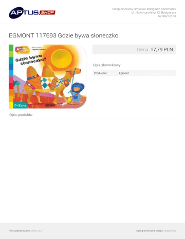 Sklep dziecięcy Smykuś Remigiusz Kaczmarek ul. Nowotoruńska 12, Bydgoszcz 52 362 02 63 EGMONT 117693 Gdzie bywa słoneczko Cena: 17,79 PLN Opis słownikowy Producent Egmont Opis produktu Plik wygenerowano: 08-03-2017 Powered by TCPDF (www.tcpdf.org) Oprogramowanie sklepu: AptusShop