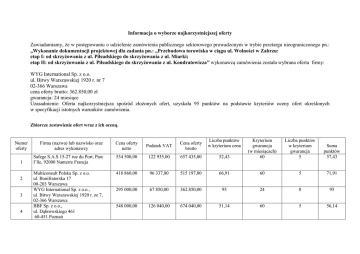 Informacja o wyborze najkorzystniejszej oferty Zawiadamiamy, że w postępowaniu o udzielenie zamówienia publicznego sektorowego prowadzonym w trybie przetargu nieograniczonego pn.: „Wykonanie dokumentacji projektowej dla zadania pn.: „Przebudowa torowiska w ciągu ul. Wolności w Zabrzu: etap I: od skrzyżowania z ul. Piłsudskiego do skrzyżowania z ul. Miarki; etap II: od skrzyżowania z ul. Piłsudskiego do skrzyżowania z ul. Kondratowicza” wykonawcą zamówienia została wybrana oferta firmy: WYG International Sp. z o.o. ul. Bitwy Warszawskiej 1920 r. nr 7 02-366 Warszawa cena oferty brutto: 362.850,00 zł gwarancja: 24 miesiące Uzasadnienie: Oferta najkorzystniejsza spośród złożonych ofert, uzyskała 95 punktów na podstawie kryteriów oceny ofert określonych w specyfikacji istotnych warunków zamówienia. Zbiorcze zestawienie ofert wraz z ich oceną. Numer oferty 1 2 3 4 52,43 Kryterium gwarancja (w miesiącach) 60 Liczba punktów w kryterium gwarancja 5 Suma punktów 57,43 515 197,80 66,91 60 5 71,91 67 850,00 362.850,00 95 24 0 95 126 040,00 674 040,00 51,14 60 5 56,14 Firma (nazwa) lub nazwisko oraz adres wykonawcy Cena oferty netto Podatek VAT Cena oferty brutto Safege S.A.S 15-27 rue du Port, Parc I’lle, 92000 Nanterre Francja 534 500,00 122 935,00 657 435,00 Multiconsult Polska Sp. z o.o. ul. Bonifraterska 17 00-203 Warszawa WYG International Sp. z o.o., ul. Bitwy Warszawskiej 1920 r. nr 7, 02-366 Warszawa BBF Sp. z o.o., ul. Dąbrowskiego 461 60-451 Poznań 418 860,00 96 337,80 295 000,00 548 000,00 Liczba punktów w kryterium cena 5 6 7 8 9 10 Konsorcjum firm: IDOM Inżynieria, Architektura i Doradztwo Sp. o.o. Idom Ingenieria y Consultoria SA, ul. Bagno 2 lok. 176, 00-112 Warszawa Systra SA 72-76 rue Henry Farman, 75015 Paryż, Francja Meritum Projekt Aleja Różana 6 (Park Śląski) 41-501 Chorzów Firma NJN Kłosek Damian, ul. 1 Maja 51 44-194 Knurów Progreg Sp. z o.o. ul. Dekarzy 7C 30-414 Kraków SWECO Consulting Sp. z o.o. ul. Ziębicka 35 60-164 Poznań 613 000,00 140 990,00 753 990,00 45,72 60 5 50,72 588 170,00 135 279,10 723 449,10 47,65 60 5 52,65 Oferta podlega odrzuceniu zgodnie z art. 89 ust 1 pkt 2 ustawy Pzp – jej treść nie odpowiada treści specyfikacji istotnych warunków zamówienia. 320 000,00 73 600,00 393 600,00 87,58 60 5 92,58 470 000,00 108 100,00 578 100,00 59,63 60 5 64,63 420 000,00 96 600,00 516 600,00 66,73 60 5 71,73