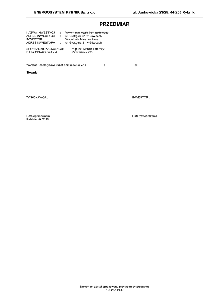 ENERGOSYSTEM RYBNIK Sp. z o.o. ul. Jankowicka 23/25, 44-200 Rybnik PRZEDMIAR NAZWA INWESTYCJI ADRES INWESTYCJI INWESTOR ADRES INWESTORA : : : : Wykonanie węzła kompaktowego ul. Grottgera 31 w Gliwicach Wspólnota Mieszkaniowa ul. Grottgera 31 w Gliwicach SPORZĄDZIŁ KALKULACJE : DATA OPRACOWANIA : mgr inż. Marcin Tatarczyk Październik 2016 Wartość kosztorysowa robót bez podatku VAT : zł Słownie: WYKONAWCA : INWESTOR : Data opracowania Październik 2016 Data zatwierdzenia Dokument został opracowany przy pomocy programu NORMA PRO Grottgera 31 - WĘZEŁ OBMIAR Lp. Podstawa Opis i wyliczenia Wykonanie węzła kompaktowego w budynku przy ul. Grottgera 31 w Gliwicach 1 CZĘŚĆ BUDOWLANA 1 Demontaz drzwi weraz z ościeżnicami d.1 wycena indywidualna 1.8*2 j.m. m2 m2 3 KNNR 3 0801-02 d.1 analogia Rozebranie posadzki z cegły o grub. 1/2 ceg. m2 25 m2 m2 Odspojenie gruntu i przewóz taczkami na odl.do 10 m w gr.kat. IV - pogłę- m3 bienie pomieszczenia o ok 25 cm 6.25 m3 5 Rozebranie istniejącej studzienki schładającej oraz wykonanie nowej o d.1 wycena indywidu- wym. 0,5x0,5x0.5m z pokrywą ze stali płaskiej alna 1 kpl. 6 Montaż umywalki ściennej porcelanowej z odporowadzeniem ścieków do d.1 wycena indywidu- studzienki schładzającej alna 1 kpl. 7 Podłoża z materiałów sypkich grub. 10-15 cm d.1 wycena indywidualna 3.75 m3 8 Podkłady betonowe grub. 7-10 cm d.1 wycena indywidualna 26*0.1 m3 9 KNR-W 2-02 d.1 0602-01 Izolacje przeciwwilgociowe powłokowe bitumiczne poziome - pierwsza warstwa 25 m2 Izolacje przeciwwilgociowe powłokowe bitumiczne poziome - druga i następna warstwa 25 m2 10 KNR-W 2-02 d.1 0602-02 12 KNNR 2 0701-02 d.1 analogia 13 KNNR 2 0701-08 d.1 analogia 14 KNNR 2 1104-01 d.1 analogia 15 KNNR 2 1104-04 d.1 analogia 16 KNNR 2 1104-04 d.1 analogia 17 KNNR 3 0701-04 d.1 analogia kpl. kpl. m3 m3 11 Wylewka betonowa zbrojona o grub 4-7 cm d.1 wycena indywidualna 25 m2 m2 m2 m2 18 m2 Ścianki działowe - dodatek za zbrojenie ścianek pełnych m2 18 m2 Montaż ościeżnic stalowych szt. 2 szt. Montaż skrzydeł drzwiowych do pomieszczenia węzła wymiennikowego m2 1.6 m2 Montaż skrzydeł drzwiowych do pomieszczenia piwnicy m2 1.6 m2 Wykucie z muru i wstawienie nowych okien zespolonych m2 0.5 m2 Norma PRO Wersja 4.37 Nr seryjny: 17929 Użytkownik: Energosystem Rybnik Sp. z o.o. 3.600 RAZEM 3.600 18.000 RAZEM 18.000 25.000 RAZEM 25.000 6.250 RAZEM 6.250 1.000 RAZEM 1.000 1.000 RAZEM 1.000 3.750 RAZEM 3.750 2.600 RAZEM 2.600 25.000 RAZEM 25.000 25.000 RAZEM 25.000 25.000 RAZEM 25.000 18.000 RAZEM 18.000 18.000 RAZEM 18.000 2.000 RAZEM 2.000 1.600 RAZEM 1.600 1.600 RAZEM 1.600 m2 Ścianki działowe z cegieł pełnych lub dziurawek gr.1/2 cegły -2- Razem m2 2 KNR 4-01 0427-05 Rozebranie ścianek działowych drewnianych d.1 analogia 18 4 KNNR 1 0303-03 d.1 Poszcz 0.500 Grottgera 31 - WĘZEŁ Lp. OBMIAR Podstawa Opis i wyliczenia j.m. 18 Przebicie otworów do komina wentylacyjnego d.1 wycena indywidualna 1 szt. 19 KNR 4-01 0701-02 Odbicie tynków wewnętrznych z zaprawy cementowo-wapiennej na ściad.1 nach, filarach, pilastrach o powierzchni odbicia do 5 m2 (przyjęto 50%) 10 m2 20 KNR 4-01 0714-02 Tynki wewnętrzne zwykłe kat. I wykonywane ręcznie na podłożu z cegły, d.1 pustaków ceramicznych, gazo- i pianobetonów na ścianach w pomieszczeniach o powierzchni podłogi ponad 5 m2 32 m2 21 KNR 4-01 0322-02 Obsadzenie kratek wentylacyjnych w ścianach z cegieł d.1 1 szt. szt. m2 m2 szt. 22 KNR 4-01 1206-02 Dwukrotne malowanie farbami olejnymi tynków wewn.ścian bez szpachlo- m2 d.1 wania - lamperie 25 m2 23 KNR 4-01 1204-02 Dwukrotne malowanie farbami emulsyjnymi tynków wewnętrznych ścian i m2 d.1 sufitów 12+7 m2 24 KNNR 2 1203-02 d.1 25 KNNR 2 1203-03 d.1 Posadzki jedno i dwubarwne z płytek z kamieni sztucznych o wym. ponad m2 15x15 cm , 10.2 m2 Cokoliki z kształtek z kamieni sztucznych układanych na zaprawie m 15 m 26 Oczyszczenie i pomalowanie istniejącej kraty zabezpieczającej okno d.1 wycena indywidualna 0.5 m2 27 Wstawienie trójnika (PP, PE, PB) d.1 wycena indywidualna 1 szt 28 KNNR 4 0111-01 d.1 29 KNNR 4 0140-01 d.1 30 KNNR 4 0123-05 d.1 31 KNNR 4 0132-01 d.1 m2 szt Rurociągi z tworzyw sztucznych (PP, PE, PB) o śr. zewnętrznej 20 mm o połączeniach zgrzewanych, na ścianach w budynkach mieszkalnych przyłącze wody zimnej 7 m Dodatki za wykonanie obustronnych podejść do wodomierzy skrzydełkowych mieszkaniowych o śr. nominalnej 20 mm w rurociągach z tworzyw sztucznych 1 kpl. Zawory przelotowe i zwrotne instalacji wodociągowych z rur z tworzyw sztucznych o śr. nominalnej 15 mm - zawór kulowy czerpalny ze złączką do węża 1 szt. kpl. szt. Norma PRO Wersja 4.37 Nr seryjny: 17929 Użytkownik: Energosystem Rybnik Sp. z o.o. 1.000 RAZEM 1.000 10.000 RAZEM 10.000 32.000 RAZEM 32.000 1.000 RAZEM 1.000 25.000 RAZEM 25.000 19.000 RAZEM 19.000 10.200 RAZEM 10.200 15.000 RAZEM 15.000 0.500 RAZEM 0.500 1.000 RAZEM 1.000 7.000 RAZEM 7.000 1.000 RAZEM 1.000 1.000 RAZEM 1.000 1.000 RAZEM 1.000 11.000 RAZEM 11.000 11.000 RAZEM 11.000 m3 m3 33 KNR 4-01 0108-10 Wywiezienie gruzu spryzmowanego samochodami skrzyniowymi - za każ- m3 d.1 dy nast. 1 km Krotność = 10 11 m3 -3- Razem 0.500 m Wodomierze skrzydełkowe domowe o śr. nominalnej 15 mm - wodomierz kpl. Qn=1,0 m3/h śr. 15 mm 1 kpl. 32 KNR 4-01 0108-09 Wywiezienie gruzu spryzmowanego samochodami skrzyniowymi na d.1 odl.do 1 km 11 Poszcz RAZEM Grottgera 31 - WĘZEŁ OBMIAR Lp. Podstawa Opis i wyliczenia 34 Koszty wysypiska - wg. Rozporządzenia w sprawie opłat za korzystanie d.1 wycena indywidu- ze środowiska alna 7 2 CZĘŚĆ TECHNOLOGICZNA 35 Dostawa i montaż węzła kompaktowego z podłączeniem do sieci WP i d.2 wycena indywidu- wew. inst. c.o. alna 1 36 KNNR 4 0511-03 d.2 analogia 37 KNNR 4 0528-01 d.2 38 KNNR 4 0529-01 d.2 j.m. t Razem 7.000 RAZEM 7.000 1.000 RAZEM 1.000 1.000 RAZEM 1.000 1.000 RAZEM 1.000 1.000 RAZEM 1.000 1.000 RAZEM 1.000 kpl. kpl. Montaż przeponowego naczynia w