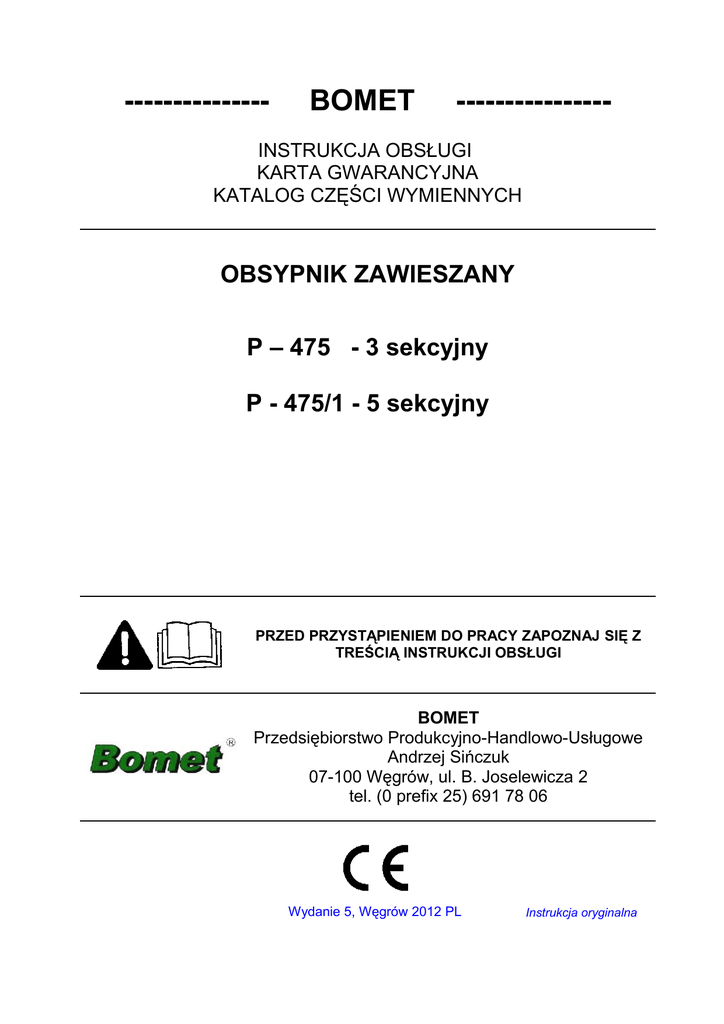 --------------- BOMET ---------------- INSTRUKCJA OBSŁUGI KARTA GWARANCYJNA KATALOG CZĘŚCI WYMIENNYCH OBSYPNIK ZAWIESZANY P – 475 - 3 sekcyjny P - 475/1 - 5 sekcyjny PRZED PRZYSTĄPIENIEM DO PRACY ZAPOZNAJ SIĘ Z TREŚCIĄ INSTRUKCJI OBSŁUGI BOMET Przedsiębiorstwo Produkcyjno-Handlowo-Usługowe Andrzej Sińczuk 07-100 Węgrów, ul. B. Joselewicza 2 tel. (0 prefix 25) 691 78 06 Wydanie 5, Węgrów 2012 PL Instrukcja oryginalna BOMET® Przedsiębiorstwo Produkcyjno-Handlowo-Usługowe Andrzej Sińczuk 07-100 Węgrów, ul. B. Joselewicza 2 tel. (0 prefix 25) 691 78 06 http:www.bomet.pl; e-mail: [email protected] DEKLARACJA ZGODNOŚCI WE dla maszyny Zgodnie z Rozporządzeniem Ministra Gospodarki z dnia 21 października 2008 r. (Dz. U. Nr 199, poz. 1228) i Dyrektywą Unii Europejskiej 2006/42/WE z dnia 17 maja 2006 r. deklarujemy z pełną odpowiedzialnością, że maszyna: Maszyna: Typ/model: OBSYPNIK ZAWIESZANY P 475 Rok produkcji: do której odnosi się niniejsza deklaracja spełnia wymagania: Rozporządzenia MG z dnia 21 października 2008 r., w sprawie zasadniczych wymagań dla maszyn (Dz. U. Nr 199, poz. 1228) i Dyrektywy Unii Europejskiej 2006/42/WE z dnia 17 maja 2006 r. Osoba odpowiedzialna za dokumentację techniczną maszyny: Andrzej Sińczuk, ul. B. Joselewicza 2, 07-100 Węgrów Do oceny zgodności zostały zastosowane również następujące normy: PN-EN ISO 12100:2011 PN-EN ISO 4254-1:2009 + AC:2010 Ta deklaracja zgodności WE traci swoją ważność, jeżeli maszyna zostanie zmieniona lub przebudowana bez naszej zgody. INSTRUKCJA OBSŁUGI STANOWI PODSTAWOWE WYPOSAŻENIE MASZYNY! Węgrów, ....................................... .......................................................... Miejsce i data wystawienia Nazwisko, imię i stanowisko osoby upoważnionej do podpisywania -1- -2- BOMET® Przedsiębiorstwo Produkcyjno-Handlowo-Usługowe Andrzej Sińczuk 07-100 Węgrów, ul. B. Joselewicza 2 tel. (0 prefix 25) 691 78 06 http:www.bomet.pl; e-mail: [email protected] DEKLARACJA ZGODNOŚCI WE dla maszyny Zgodnie z Rozporządzeniem Ministra Gospodarki z dnia 21 października 2008 r. (Dz. U. Nr 199, poz. 1228) i Dyrektywą Unii Europejskiej 2006/42/WE z dnia 17 maja 2006 r. deklarujemy z pełną odpowiedzialnością, że maszyna: Maszyna: Typ/model: OBSYPNIK ZAWIESZANY P 475 Rok produkcji: do której odnosi się niniejsza deklaracja spełnia wymagania: Rozporządzenia MG z dnia 21 października 2008 r., w sprawie zasadniczych wymagań dla maszyn (Dz. U. Nr 199, poz. 1228) i Dyrektywy Unii Europejskiej 2006/42/WE z dnia 17 maja 2006 r. Osoba odpowiedzialna za dokumentację techniczną maszyny: Andrzej Sińczuk, ul. B. Joselewicza 2, 07-100 Węgrów Do oceny zgodności zostały zastosowane również następujące normy: PN-EN ISO 12100:2011 PN-EN ISO 4254-1:2009 + AC:2010 Ta deklaracja zgodności WE traci swoją ważność, jeżeli maszyna zostanie zmieniona lub przebudowana bez naszej zgody. INSTRUKCJA OBSŁUGI STANOWI PODSTAWOWE WYPOSAŻENIE MASZYNY! Węgrów, ....................................... .......................................................... Miejsce i data wystawienia Nazwisko, imię i stanowisko osoby upoważnionej do podpisywania -3- KARTA GWARANCYJNA Obsypnik zawieszany typ P 475 Numer fabryczny ................................................ Data produkcji .................................................... Podpis kontrolera ............................................... Data sprzedaży .................................................. Podpis sprzedającego ....................................... ................................................... Pieczęć sprzedawcy UWAGA: Od sprzedawcy należy żądać dokładnego (czytelnego) wypełnienia karty gwarancyjnej oraz kuponów reklamacyjnych. Brak np. daty sprzedaży lub pieczątki punktu sprzedaży narazi użytkownika na nie uznanie ewentualnych reklamacji. Karta gwarancyjna z zapisami poprawionymi lub wypełniona nieczytelnie – jest nieważna. Zasady postępowania gwarancyjnego 1. Przez użytkownika należy rozumieć osobę fizyczną lub prawną nabywającą sprzęt rolniczy, przez sprzedawcę - jednostkę handlową dostarczającą sprzęt użytkownikowi, a przez producenta - wytwórcę sprzętu rolniczego. 2. Producent zapewnia dobrą jakość i sprawne działanie obsypnika, na który wydana jest niniejsza gwarancja. 3. Wady lub uszkodzenia obsypnika będą usuwane bezpłatnie na miejscu u nabywcy w okresie 12 miesięcy od daty sprzedaży. 4. Ujawnione wady lub uszkodzenia należy zgłosić osobiście, listownie lub telefonicznie. 5. Jeżeli w okresie gwarancji wystąpi konieczność dokonania trzech napraw gwarancyjnych, a wyrób dalej wykazuje wady uniemożliwiające jego użytkowanie zgodnie z przeznaczeniem, nabywcy przysługuje prawo do wymiany wyrobu na nowy, wolny od wad lub zwrot gotówki. 6. Jeżeli producent, sprzedawca i użytkownik nie uzgadniają innego terminu wykonania reklamacji, wymiany wyrobu lub zwrotu gotówki, powinna być ona dokonana w terminie 14 dni od daty zgłoszenia przez użytkownika. 7. Do napraw gwarancyjnych nie są kwalifikowane naprawy spowodowane : - użytkowaniem obsypnika niezgodnym z instrukcją obsługi i przeznaczeniem, - zdarzeniami losowymi lub innymi, za które odpowiedzialności nie ponosi producent. Naprawy te mogą być wykonane wyłącznie na koszt użytkownika, nabywcy. 8. Producent ma prawo anulować gwarancję na wyrób w przypadku stwierdzenia: - wprowadzenia zmian konstrukcyjnych, - wystąpienia uszkodzeń spowodowanych zdarzeniami losowymi, - braku wymaganych zapisów lub ich samodzielnego dokonania w karcie gwarancyjnej, - użytkowania obsypnika niezgodnie z przeznaczeniem lub instrukcją obsługi. -4- Kupon reklamacyjny nr 1 Obsypnik zawieszany P 475 Nr fabryczny .................................. Data zakupu ........................................ podpis i pieczątka sprzedawcy Nr protokółu reklamacyjnego ........................... Kupon r