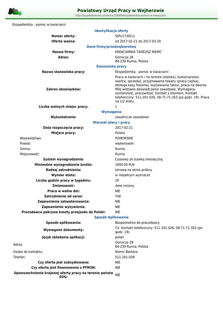 Powiatowy Urząd Pracy w Wejherowie http://pupwejherowo.pl/oferta/25899/ekspedientka-pomoc-w-kwiaciarni Ekspedientka - pomoc w kwiaciarni Identyfikacja oferty Numer oferty: StPr/17/0511 Oferta ważna: od 2017-02-21 do 2017-03-20 Dane firmy/przedsiębiorstwa Nazwa firmy: KWIACIARNIA TADEUSZ NIEMC Adres: Górnicza 28 84-230 Rumia, Polska Stanowisko pracy Nazwa stanowiska pracy: Ekspedientka - pomoc w kwiaciarni Praca w kwiaciarni i na terenie (stoiska), bukieciarstwo, wieńce, sprzedaż, przyjmowanie towaru (praca ciężka), obsługa kasy fiskalnej, wystawianie faktur, praca na dworze. Mile widziane doświadczenie zawodowe. Wymagana: sumienność, pracowitość, kontakt z klientem. Kontakt telefoniczny: 511-201-026, 58-71-71-353 (po godz. 19). Praca na 1/2 etatu. Zakres obowiązków: Liczba wolnych miejsc pracy: 1 Wymagania Wykształcenie: zasadnicze zawodowe Warunki płacy i pracy Data rozpoczęcia pracy: 2017-02-21 Miejsce pracy: Polska Województwo: POMORSKIE Powiat: wejherowski Gmina: Rumia Miejscowość: Rumia System wynagrodzenia: Czasowy ze stawką miesięczną Minimalne wynagrodzenie brutto: 1000.00 PLN Rodzaj zatrudnienia: Umowa na okres próbny Wymiar etatu: w niepełnym wymiarze Liczba godzin pracy w tygodniu: 20 Zmianowość: dwie zmiany Praca w wolne dni: NIE Zatrudnienie od zaraz: TAK Zapewnienie zakwaterowania: NIE Zapewnienie wyżywienia: NIE Pracodawca pokrywa koszty przejazdu do Polski: NIE Sposób Aplikowania Sposób aplikowania: Wymagane dokumenty: Język składania aplikacji: Bezpośrednio do pracodawcy CV. Kontakt telefoniczny: 511-201-026, 58-71-71-353 (po godz. 19). polski Adres: Górnicza 28 84-230 Rumia, Polska Osoba do kontaktu: Niemc Barbara Telefon: 511-201-026 Czy oferta jest subsydiowana: NIE Czy oferta jest finansowana z PFRON: NIE Upowszechnienie krajowej oferty pracy na terenie państw NIE EOG: