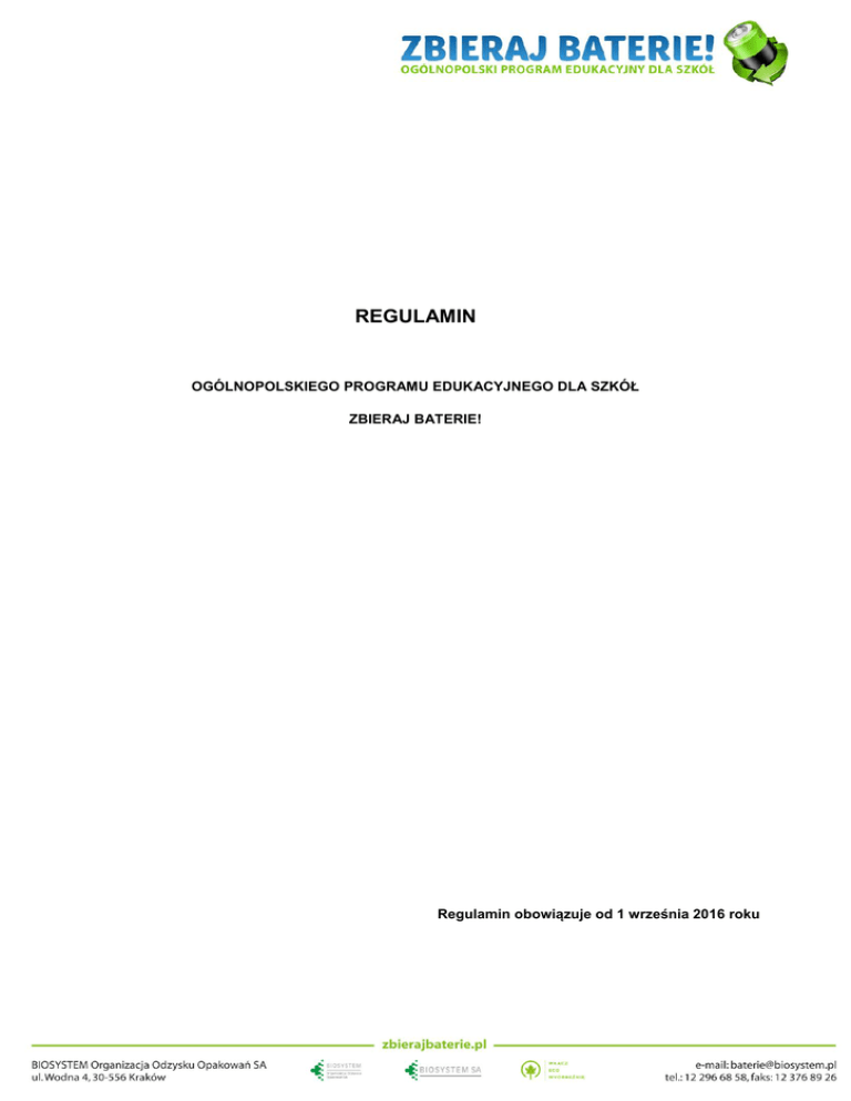 REGULAMIN OGÓLNOPOLSKIEGO PROGRAMU EDUKACYJNEGO DLA SZKÓŁ ZBIERAJ BATERIE! Regulamin obowiązuje od 1 września 2016 roku WPROWADZENIE - POSTANOWIENIA OGÓLNE §1 1. Niniejszy dokument określa zasady oraz warunki uczestnictwa w Ogólnopolskim Programie Edukacyjnym dla Szkół – „Zbieraj Baterie!” – zwanym dalej „Programem”. 2. Organizatorem Programu jest Biosystem Organizacja Odzysku Opakowań SA z siedzibą w Krakowie (30-556), przy ul. Wodnej 4, zwany dalej „Organizatorem”. 3. Partnerem Głównym Programu jest spółka Biosystem SA z siedzibą w Krakowie (30-556), przy ul. Wodnej 4, zwana dalej „Partnerem Głównym”. Partnerami Lokalnymi Programu są podmioty współpracujące z Organizatorem lub/i Partnerem w zakresie odbioru zużytych baterii i akumulatorów, zwane dalej „Partnerami Lokalnymi”. 4. Celem Programu jest edukacja ekologiczna dzieci i młodzieży oraz zbiórka zużytych baterii i akumulatorów przenośnych. 5. Do Programu mogą zgłosić się placówki oświatowe, mające siedzibę na terenie Rzeczypospolitej Polskiej, w tym publiczne oraz prywatne szkoły podstawowe, przedszkola, szkoły gimnazjalne oraz szkoły średnie zwane dalej „Placówkami”. 6. Program skierowany jest do: a. dzieci i młodzieży uczęszczających do Placówek, b. nauczycieli i innych pracowników Placówek oraz rodziców i opiekunów prawnych dzieci i młodzieży uczęszczających do Placówek, Adresaci programu opisani w pkt. §1 pkt. 6a i 6b zwani są dalej „Uczestnikami”. 7. Program ma charakter wieloletni. Podzielony jest na cykliczne etapy zwane „Edycjami”. Edycja rozpoczyna się 1 września i trwa do 10 maja. 8. Organizator zastrzega sobie prawo dokonywania zmian w Regulaminie. O każdorazowej zmianie Regulaminu, Uczestnicy będą informowani poprzez opublikowanie nowej treści Regulaminu na stronie zbierajbaterie.pl lub/i drogą e-mailową na adres podany w procesie rejestracji. ZGŁOSZENIA DO PROGRAMU §2 1. Aby przystąpić do Programu, Placówka zobligowana jest do podpisania Deklaracji Uczestnictwa w Programie, którą należy odesłać na adres Organizatora. Wzór Deklaracji dostępny jest na stronie internetowej zbierajbaterie.pl. 2. Placówka zobowiązana jest wypełnić Deklarację, o której mowa w §2 pkt. 1, w sposób kompletny, czytelny i zgodny z prawdą. Deklaracje niespełniające wymogów opisanych w niniejszym punkcie wykluczają możliwość uczestnictwa w Programie. 3. Placówka zobligowana jest do informowania Organizatora o jakichkolwiek zmianach danych zawartych w Deklaracji, o której mowa w §2 pkt. 1. Zgodnie z art. 51 ust. 1 Ustawy o bateriach i akumulatorach z dnia 24 kwietnia 2009 roku (Dz. U. z 2009 Nr 79, poz. 666), Placówka jako Miejsce Odbioru zużytych baterii, zobligowana jest do podpisania z Partnerem Głównym Programu umowy o świadczenie usług w zakresie odbioru zużytych baterii i akumulatorów, zwaną dalej „Umową”, stanowiącą załącznik nr 1 do niniejszego regulaminu z wyłączeniem: a. Placówek, mających swoją siedzibę na terenie gmin, mających podpisaną umowę o świadczenie usług w zakresie odbioru zużytych baterii i akumulatorów z Partnerem Głównym. b. Placówek, od których Partnerzy Lokalni odbierają zużyte baterie i akumulatory na podstawie odrębnej umowy z Placówką o świadczenie usług w zakresie odbioru zużytych baterii i akumulatorów. c. Placówek, od których Partnerzy Lokalni odbierają zużyte baterie i akumulatory na podstawie odrębnej umowy z gminą o świadczenie usług w zakresie odbioru zużytych baterii i akumulatorów. 4. Przystąpienie do Programu jest bezpłatne, dobrowolne i w każdej chwili w czasie jego trwania dopuszcza się możliwość odstąpienia od udziału w Programie z zachowaniem miesięcznego okresu wypowiedzenia, skutkującym wraz z końcem danego miesiąca kalendarzowego. 5. W celu odstąpienia od udziału w Programie, Placówka zobligowana jest do przesłania informacji na adres Organizatora. 6. Przystępując do Programu, Placówka wyraża zgodę na przetwarzanie, gromadzenie i systematyzowanie przez Organizatora danych w celach realizacji postanowień niniejszego Regulaminu, a także w celach marketingowych i promocyjnych Programu, w szczególności zezwala na publikację nazwy, adresu oraz numeru Placówki na stronie internetowej Organizatora i w jego materiałach promocyjnych. 7. Placówka przystępująca do Programu oświadcza, że zapoznała się z treścią niniejszego Regulaminu i akceptuje jego postanowienia w całości. EDUKACJA EKOLOGICZNA §3 1. W ciągu 21 dni od daty zgłoszenia i dostarczenia na adres Organizatora prawidłowo wypełnionej Umowy i Deklaracji, o których mowa w §2 pkt. 1-3, Placówka otrzyma materiały edukacyjne opisane w §3 pkt. 2, mające na celu dostarczenie niezbędnej wiedzy w zakresie zużytych baterii i akumulatorów oraz ułatwienie edukacji ekologicznej Uczestników Programu. 2. W skład materiałów edukacyjnych, wchodzą: a. pojemnik do zbiórki zużytych baterii i akumulatorów o wymiarach szacunkowych 26 x 16 cm oraz średnicy wrzutu wynoszącej 7 cm , zwany dalej „Pojemnikiem”, b. plakaty edukacyjne, zachęcające do zbiórki zużytych baterii i akumulatorów, zwane dalej „Plakatami edukacyjnymi”, c. folder informacyjny pt. „Bateryjne ABC”, zawierający najważniejsze informacje na temat baterii i akumulatorów przenośnych oraz ich wpływie na środowisko naturalne wskutek niewłaściwego pozbywania się po okresie eksploatacji, zwany dalej „Folderem „Bateryjne ABC””, d. płyta CD zawierająca konspekty lekcji dla nauczycieli, dotyczące zbiórki i recyklingu baterii akumulatorów i inne materiały edukacyjne, zwana dalej „Płytą CD”, e. informator o Programie, f. inne materiały edukacyjne. 3. Organizator zaleca wykorzystanie materiałów, o których mowa w §3 pkt. 2 w następujący sposób: a. Folder „Bateryjne ABC” – przeznaczony jest dla nauczycieli i pedagogów.