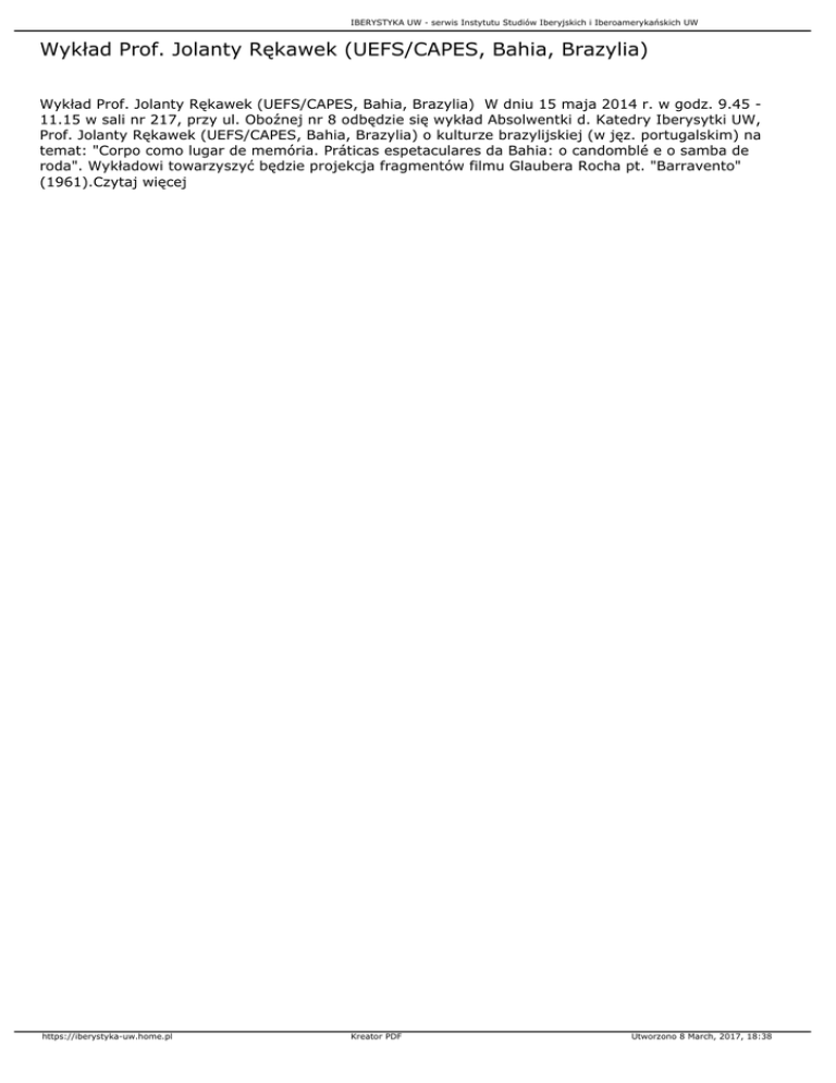 IBERYSTYKA UW - serwis Instytutu Studiów Iberyjskich i Iberoamerykańskich UW Wykład Prof. Jolanty Rękawek (UEFS/CAPES, Bahia, Brazylia) Wykład Prof. Jolanty Rękawek (UEFS/CAPES, Bahia, Brazylia) W dniu 15 maja 2014 r. w godz. 9.45 11.15 w sali nr 217, przy ul. Oboźnej nr 8 odbędzie się wykład Absolwentki d. Katedry Iberysytki UW, Prof. Jolanty Rękawek (UEFS/CAPES, Bahia, Brazylia) o kulturze brazylijskiej (w jęz. portugalskim) na temat: "Corpo como lugar de memória. Práticas espetaculares da Bahia: o candomblé e o samba de roda". Wykładowi towarzyszyć będzie projekcja fragmentów filmu Glaubera Rocha pt. "Barravento" (1961).Czytaj więcej https://iberystyka-uw.home.pl Kreator PDF Utworzono 8 March, 2017, 18:38