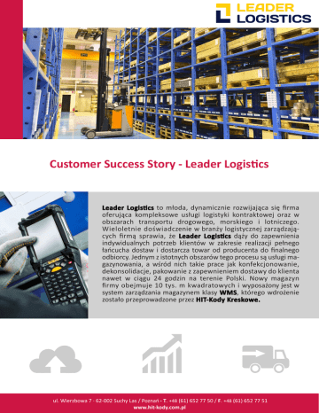 Customer Success Story - Leader Logistics Leader Logistics to młoda, dynamicznie rozwijająca się firma oferująca kompleksowe usługi logistyki kontraktowej oraz w obszarach transportu drogowego, morskiego i lotniczego. Wieloletnie doświadczenie w branży logistycznej zarządzających firmą sprawia, że Leader Logistics dąży do zapewnienia indywidualnych potrzeb klientów w zakresie realizacji pełnego łańcucha dostaw i dostarcza towar od producenta do finalnego odbiorcy. Jednym z istotnych obszarów tego procesu są usługi magazynowania, a wśród nich takie prace jak konfekcjonowanie, dekonsolidacje, pakowanie z zapewnieniem dostawy do klienta nawet w ciągu 24 godzin na terenie Polski. Nowy magazyn firmy obejmuje 10 tys. m kwadratowych i wyposażony jest w system zarządzania magazynem klasy WMS, którego wdrożenie zostało przeprowadzone przez HIT-Kody Kreskowe. ul. Wierzbowa 7 · 62-002 Suchy Las / Poznań · T. +48 (61) 652 77 50 / F. +48 (61) 652 77 51 www.hit-kody.com.pl Na sprawną implementację systemu WMS w Leader Logistics miało wpływ wiele czynników jak choćby przeprowadzona przed wdrożeniem analiza procesów logistycznych czy przygotowanie przez HIT-Kody Kreskowe profesjonalnego oznakowania kodami kreskowymi stref magazynowych i regałów. Dokładne określenie wymagań i parametrów systemu pozwoliło dostosować oprogramowanie do specyficznych potrzeb Leader Logistics. Oparte o system kodów kreskowych rozwiązanie automatyzuje obecnie większość czynności magazynowych eliminując wcześniejszą odręczną ewidencję, zapewniając lepszą wydajność i kontrolę pracy. Wdrożone rozwiązanie dostarcza również informacje na temat pracy w magazynie udostępniając menadżerom kilkadziesiąt raportów generowanych jednym kliknięciem. Wdrożony system zapewnił kontrolę stanów magazynowych i przejrzystość procesów. Praca w nowoczesnym magazynie Leader Logistics jest w pełni zautomatyzowana i między innymi dzięki temu firma jest w stanie zrealizować szereg usług magazynowych dla Klienta z dostawą towaru nawet w ciągu 24 godzin. Za wdrożonymi nowoczesnymi rozwiązaniami informatycznymi stoją wysoka jakość obsługi, szybkość i bezpieczeństwo powierzonego towaru. ul. Wierzbowa 7 · 62-002 Suchy Las / Poznań · T. +48 (61) 652 77 50 / F. +48 (61) 652 77 51 www.hit-kody.com.pl