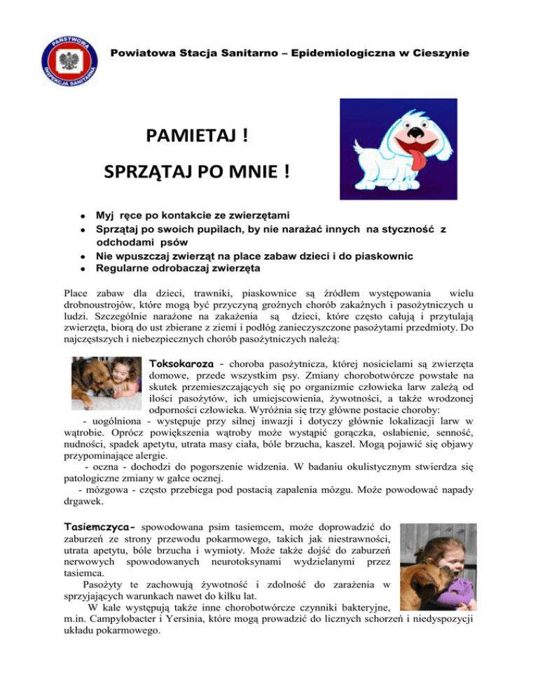 Powiatowa Stacja Sanitarno – Epidemiologiczna w Cieszynie PAMIETAJ ! SPRZĄTAJ PO MNIE ! Myj ręce po kontakcie ze zwierzętami Sprzątaj po swoich pupilach, by nie narażać innych na styczność z odchodami psów Nie wpuszczaj zwierząt na place zabaw dzieci i do piaskownic Regularne odrobaczaj zwierzęta Place zabaw dla dzieci, trawniki, piaskownice są źródłem występowania wielu drobnoustrojów, które mogą być przyczyną groźnych chorób zakaźnych i pasożytniczych u ludzi. Szczególnie narażone na zakażenia są dzieci, które często całują i przytulają zwierzęta, biorą do ust zbierane z ziemi i podłóg zanieczyszczone pasożytami przedmioty. Do najczęstszych i niebezpiecznych chorób pasożytniczych należą: Toksokaroza - choroba pasożytnicza, której nosicielami są zwierzęta domowe, przede wszystkim psy. Zmiany chorobotwórcze powstałe na skutek przemieszczających się po organizmie człowieka larw zależą od ilości pasożytów, ich umiejscowienia, żywotności, a także wrodzonej odporności człowieka. Wyróżnia się trzy główne postacie choroby: - uogólniona - występuje przy silnej inwazji i dotyczy głównie lokalizacji larw w wątrobie. Oprócz powiększenia wątroby może wystąpić gorączka, osłabienie, senność, nudności, spadek apetytu, utrata masy ciała, bóle brzucha, kaszel. Mogą pojawić się objawy przypominające alergie. - oczna - dochodzi do pogorszenie widzenia. W badaniu okulistycznym stwierdza się patologiczne zmiany w gałce ocznej. - mózgowa - często przebiega pod postacią zapalenia mózgu. Może powodować napady drgawek. Tasiemczyca- spowodowana psim tasiemcem, może doprowadzić do zaburzeń ze strony przewodu pokarmowego, takich jak niestrawności, utrata apetytu, bóle brzucha i wymioty. Może także dojść do zaburzeń nerwowych spowodowanych neurotoksynami wydzielanymi przez tasiemca. Pasożyty te zachowują żywotność i zdolność do zarażenia w sprzyjających warunkach nawet do kilku lat. W kale występują także inne chorobotwórcze czynniki bakteryjne, m.in. Campylobacter i Yersinia, które mogą prowadzić do licznych schorzeń i niedyspozycji układu pokarmowego.