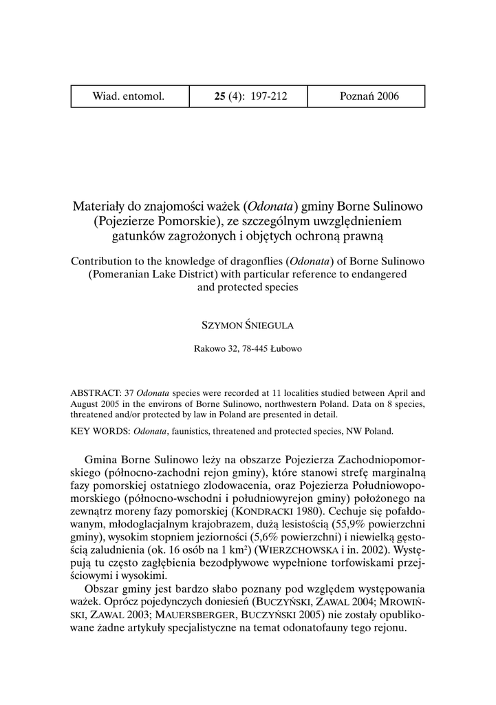 Wiad. entomol. 25 (4): 197-212 Poznań 2006 Materiały do znajomości ważek (Odonata) gminy Borne Sulinowo (Pojezierze Pomorskie), ze szczególnym uwzględnieniem gatunków zagrożonych i objętych ochroną prawną Contribution to the knowledge of dragonflies (Odonata) of Borne Sulinowo (Pomeranian Lake District) with particular reference to endangered and protected species SZYMON ŚNIEGULA Rakowo 32, 78-445 Łubowo ABSTRACT: 37 Odonata species were recorded at 11 localities studied between April and August 2005 in the environs of Borne Sulinowo, northwestern Poland. Data on 8 species, threatened and/or protected by law in Poland are presented in detail. KEY WORDS: Odonata, faunistics, threatened and protected species, NW Poland. Gmina Borne Sulinowo leży na obszarze Pojezierza Zachodniopomorskiego (północno-zachodni rejon gminy), które stanowi strefę marginalną fazy pomorskiej ostatniego zlodowacenia, oraz Pojezierza Południowopomorskiego (północno-wschodni i południowyrejon gminy) położonego na zewnątrz moreny fazy pomorskiej (KONDRACKI 1980). Cechuje się pofałdowanym, młodoglacjalnym krajobrazem, dużą lesistością (55,9% powierzchni gminy), wysokim stopniem jeziorności (5,6% powierzchni) i niewielką gęstością zaludnienia (ok. 16 osób na 1 km2) (WIERZCHOWSKA i in. 2002). Występują tu często zagłębienia bezodpływowe wypełnione torfowiskami przejściowymi i wysokimi. Obszar gminy jest bardzo słabo poznany pod względem występowania ważek. Oprócz pojedynczych doniesień (BUCZYŃSKI, ZAWAL 2004; MROWIŃSKI, ZAWAL 2003; MAUERSBERGER, BUCZYŃSKI 2005) nie zostały opublikowane żadne artykuły specjalistyczne na temat odonatofauny tego rejonu. 198 SZ. ŚNIEGULA Teren byłego poligonu radzieckiego, który stanowi znaczną część gminy, do roku 1993 nie był dostępny do badań przyrodniczych. W okresie od kwietnia do sierpnia roku 2005 przeprowadzono badania na wybranych stanowiskach położonych w północno-zachodniej i południowej części gminy Borne Sulinowo. Opierały się one na obserwacjach i odłowach imagines przy pomocy siatki entomologicznej oraz zbieraniu wylinek. Opis stanowisk 1. Kompleks jeziora Tyczno (UTM: WV94). Projektowany rezerwat (JASNOWSKA i in. 1998) ok. 2 km NE od wsi Komorze. Na otoczony lasem sosnowym kompleks, o powierzchni 165 ha, składa się jezioro oraz torfowiska niskie i przejściowe, fitocenozy szuwarowe i leśne ekosystemy bagienne. Dno jeziora miejscami piaszczyste, miejscami pokryte detrytusem lub zamulone. Woda o lekko brunatnym zabarwieniu. Większa część lustra wody przerośnięta przez Stratiotes aloides L. oraz Hydrocharis morsus-ranae L.; miejscami Nymphaea sp., Potamogeton natans L. Z roślinności szuwarowej występują m.in. Carex sp., Sparganium erectum L., Phragmites australis (CAV.) TRIN. ex STENDEL, Typha sp., Hottonia palustris L., Glyceria maxima (HERTMAN) HOLMB., Juncus sp., Equisetum fluviatile L., Eleocharis palustris (L.) ROEM. et SCH. Roślinność zanurzona: Chara sp., Ceratophyllum sp. 2. Komorze, śródleśne jeziorko 2 km E od wsi (WV94) o powierzchni ok. 2,25 ha, otoczone lasem sosnowym z domieszką brzóz. Od strony SE zakończone jest torfowiskiem przejściowym o powierzchni ok. 0,55 ha, natomiast od strony W przylega torfowisko przejściowe o powierzchni ok. 4,5 ha. Dno piaszczyste pokryte detrytusem, miejscami lekko zamulone. Zabarwienie wody lekko brunatne. Roślinność szuwarowa: Carex sp., Typha sp., Phragmites australis, Sparganium erectum, Calla palustris L., Potentilla palustris (L.) SCOP., Juncus sp., Lysimachia thyrsiflora L., Eleocharis palustris. Nimfeidy: Polygonumamphibium L., Potamogeton natans. 3. Komorze, torfowisko sfagnowe wysokie i przejściowe 1,3 km E od wsi (WV94). Powierzchnia ok. 1,3 ha, otoczone lasem sosnowym. W części południowej trzy drobne zbiorniki o wymiarach: 28×6 m, 6×1,5 m, 4,5×1,5 m. Roślinność na ple: Sphagnum sp., Oxycoccus palustris PERS., Rhynchospora alba (L.) VAHL, Drosera rotundifolia L., Andromeda polifolia L., Eriophorum vaginatum L., Carex rostrata STOKES, Vaccinium uliginosum L., Pinus sylvestris L., Betula sp. Przy granicy pła i wody: Eriophorum angustifolium HONCK., Calla palustris L., Potentilla palustris, Menyanthes trifoliata L., C. rostrata. Nimfeidy: Potamogeton natans. Rośliny zanurzone: Utricularia minor L. MATERIAŁY DO ZNAJOMOŚCI WAŻEK GMINY BORNE SULINOWO [...] 199 4. Strzeszyn, jeziorko śródleśne ok. 1 km od wsi, pomiędzy jeziorami Lubicko Wielkie i Pile (WV94). Powierzchnia ok. 1,1 ha. Dookoła zarasta płem sfagnowym o średniej szerokości 30 m. W dalszej części leśny ekosystem bagienny. Roślinność na ple: Sphagnum sp., Oxycoccus palustris, Rhynchospora alba, Andromeda polifolia, Drosera rotundifolia, Menyanthes trifoliata, Eriophorum vaginatum, Carex rostrata, Ledum palustre L., Pinus sylvestris, Betula sp. Przy granicy pła i wody: C. lasiocarpa EHRH., Lysimachia thyrsiflora, Typha sp. Nimfeidy: Nyphaea sp. Po N, E i W stronie suche na skutek działalności człowieka doły potorfowe. 5. Strzeszyn, jeziorko śródleśne 700 m N od wsi (WV94). Powierzchnia ok. 0,8 ha. Otoczone po N i NW stronie płem sfagnowym o powierzchni ok. 0,2 ha, po S, E, SW stronie leśnym ekosystemem bagiennym, gdzie dominują Alnus glutinosa (L.) GAERTN. i Betula sp. Roślinność szuwarowa: Lysimachia thyrsiflora, L. vulgaris L., Calla palustris, Menyanthes trifoliata, Potentilla palustris, Carex rostrata, C. limosa L. (NW część zbiornika), Peucedanum palustre (L.) MOENCH, Rumex hydrolapathum HUDS., Juncus sp., Typha sp. Na ple: Sphagnum sp., Rhynhospora alba, Oxycoccus palustris, Andromeda polifolia, Eriophorum vaginatum, E. angustifolium, Vaccinium ulginosum, Ledum palustre. Nimfeidy: Nuphar lutea (L.) SIBTH. et SM., Nymphaea alba L. 6. Strzeszyn, dwa jeziorka 2 km N od wsi (WV94). Zbiorniki, południowy o powierzchni ok. 0,6 ha,północny ok. 0,55 ha, oddzielone od siebie i otoczonetorfowiskiem sfagnowym. Roślinnoś