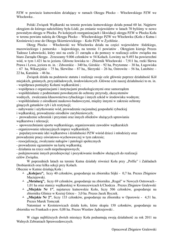 PZW w powiecie kutnowskim działający w ramach Okręgu Płocko – Włocławskiego PZW we Włocławku . Polski Związek Wędkarski na terenie powiatu kutnowskiego działa ponad 60 lat. Najpierw okręgiem do którego należeliśmy była Łódź, po zmianie województw w latach 70 byliśmy w nowo powstałym okręgu w Płocku. Po kolejnych reorganizacjach i likwidacji okręgu PZW w Płocku Koła w terenu powiatu należą do Okręgu Płocko – Włocławskiego PZW we Włocławku (Koła z Kutna i Krośniewic) oraz do Okręgu Skierniewickiego – Koło PZW w Żychlinie . Okręg Płocko – Włocławski we Włocławku działa na części województw :łódzkiego, mazowieckiego i pomorsko – kujawskiego, na terenie 11 powiatów . Okręgiem kieruje Prezes Tadeusz Lubowiecki, który stoi na czele 21 zarządu a do pomocy w realizacji celów związku ma biuro Zarządu Okręgu . Zrzeszamy 9.006 członków w 54 Kołach. Łowimy na 9.493 ha powierzchni wód, w tym 1.421 ha to jeziora. Główne łowiska to : Zbiornik Włocławski – 7,911 ha, rzeki Skrwa Prawa i Lewa, jeziora m. in. : Zdworskie – 340 ha, Górskie – 92 ha, Przytomne – 38 ha, Ługowiska – 67 ha, Wikaryjskie – 75 ha, Skrwilno – 87 ha,, Skrzynki – 26 ha, Ostrowite – 56 ha, Lutobórz – 22 ha, Karaśnia - 46 ha . Związek działa na podstawie statutu i realizuje swoje cele głównie poprzez działalność Kół miejskich, gminnych, przyzakładowych, środowiskowych .Główne cele naszej działalności to m. in. - współpraca pomiędzy Kołami wędkarskimi ; - współpraca z organizacjami i instytucjami proekologicznymi oraz samorządem - współdziałanie z podmiotami powołanymi do ochrony przyrody, ekosystemów wodnych, zwalczania kłusownictwa rybackiego i innych szkód w środowisku wodnym; - współdziałanie z ośrodkami naukowo-badawczymi, między innymi w zakresie ochrony ginących gatunków ryb i ich restytucji; - nabywanie i użytkowanie wód, prowadzenie racjonalnej gospodarki rybackiej i wędkarskiej, prowadzenie ośrodków zarybieniowych; - prowadzenie schronisk i przystani oraz innych obiektów służących uprawianiu wędkarstwa i rekreacji; - upowszechnianie sportu wędkarskiego, organizowanie zawodów wędkarskich - organizowanie rekreacyjnych imprez wędkarskich; - popularyzowanie idei wędkarstwa i działalności PZW wśród dzieci i młodzieży oraz prowadzenie pracy oświatowo-wychowawczej w tym zakresie; - resocjalizację, zwalczanie nałogów i patologii społecznych - prowadzenie egzaminów na kartę wędkarską; - działania na rzecz osób niepełnosprawnych; - podejmowanie innych przedsięwzięć i pozyskiwanie środków służących do realizacji celów Związku. W poprzednich latach na terenie Kutna działały również Koła przy „Polfie” i Zakładach Drobiarskich oraz kilka sekcji przy Kołach. Obecnie w Kutnie działają Koła : Ó „Kolejarz”, liczy 40 członków, gospodaruje na zbiorniku Sójki - 0,7 ha. Prezes Zbigniew Maciejewski. Ó „Metalurg”, liczy 69 członków, gospodaruje na zbiorniku „Rogal” w Nowych Ostrowach 1,01 ha oraz stanicy wędkarskiej w Kromszewicach k/Chodcza . Prezes Zbigniew Gralewski Ó „Miejskie Nr 1”, najstarsze kutnowskie Koło, liczy 506 członków, gospodaruje na zbiorniku Glinice w Koziej Górze - 3,0 ha. Prezes Jacek Byczek. Ó „Miejskie Nr 2”, liczy 133 członków, gospodaruje na zbiorniku w Oporowie - 4,51 ha. Prezes Marek Tomczak Natomiast w Krośniewicach działa koło, które skupia 150 członków, gospodaruje na zbiorniku we Frankach o pow. 0,88 ha. Prezes Wiesław Jędrzejewski . W ciągu najbliższych dwóch miesięcy Koła podsumują swoją działalność za rok 2011 na Walnych Zebraniach Sprawozdawczych. Opracował Zbigniew Gralewski