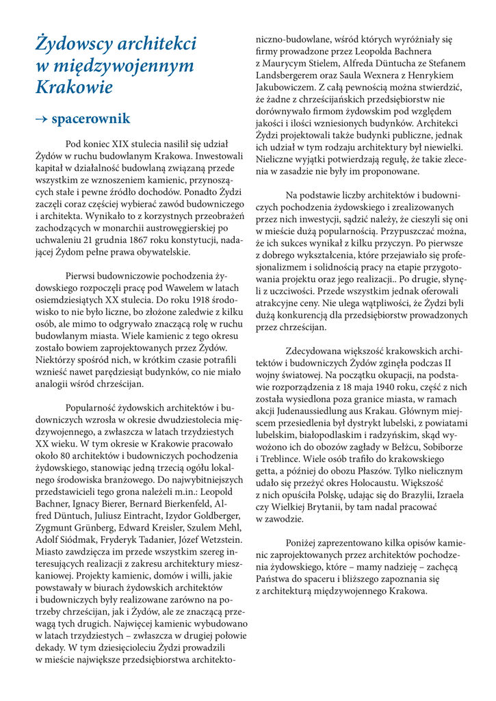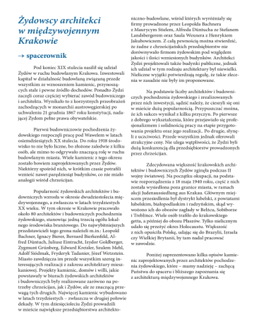Żydowscy architekci w międzywojennym Krakowie → spacerownik Pod koniec XIX stulecia nasilił się udział Żydów w ruchu budowlanym Krakowa. Inwestowali kapitał w działalność budowlaną związaną przede wszystkim ze wznoszeniem kamienic, przynoszących stałe i pewne źródło dochodów. Ponadto Żydzi zaczęli coraz częściej wybierać zawód budowniczego i architekta. Wynikało to z korzystnych przeobrażeń zachodzących w monarchii austrowęgierskiej po uchwaleniu 21 grudnia 1867 roku konstytucji, nadającej Żydom pełne prawa obywatelskie. Pierwsi budowniczowie pochodzenia żydowskiego rozpoczęli pracę pod Wawelem w latach osiemdziesiątych XX stulecia. Do roku 1918 środowisko to nie było liczne, bo złożone zaledwie z kilku osób, ale mimo to odgrywało znaczącą rolę w ruchu budowlanym miasta. Wiele kamienic z tego okresu zostało bowiem zaprojektowanych przez Żydów. Niektórzy spośród nich, w krótkim czasie potrafili wznieść nawet parędziesiąt budynków, co nie miało analogii wśród chrześcijan. Popularność żydowskich architektów i budowniczych wzrosła w okresie dwudziestolecia międzywojennego, a zwłaszcza w latach trzydziestych XX wieku. W tym okresie w Krakowie pracowało około 80 architektów i budowniczych pochodzenia żydowskiego, stanowiąc jedną trzecią ogółu lokalnego środowiska branżowego. Do najwybitniejszych przedstawicieli tego grona należeli m.in.: Leopold Bachner, Ignacy Bierer, Bernard Bierkenfeld, Alfred Düntuch, Juliusz Eintracht, Izydor Goldberger, Zygmunt Grünberg, Edward Kreisler, Szulem Mehl, Adolf Siódmak, Fryderyk Tadanier, Józef Wetzstein. Miasto zawdzięcza im przede wszystkim szereg interesujących realizacji z zakresu architektury mieszkaniowej. Projekty kamienic, domów i willi, jakie powstawały w biurach żydowskich architektów i budowniczych były realizowane zarówno na potrzeby chrześcijan, jak i Żydów, ale ze znaczącą przewagą tych drugich. Najwięcej kamienic wybudowano w latach trzydziestych – zwłaszcza w drugiej połowie dekady. W tym dziesięcioleciu Żydzi prowadzili w mieście największe przedsiębiorstwa architekto- niczno-budowlane, wśród których wyróżniały się firmy prowadzone przez Leopolda Bachnera z Maurycym Stielem, Alfreda Düntucha ze Stefanem Landsbergerem oraz Saula Wexnera z Henrykiem Jakubowiczem. Z całą pewnością można stwierdzić, że żadne z chrześcijańskich przedsiębiorstw nie dorównywało firmom żydowskim pod względem jakości i ilości wzniesionych budynków. Architekci Żydzi projektowali także budynki publiczne, jednak ich udział w tym rodzaju architektury był niewielki. Nieliczne wyjątki potwierdzają regułę, że takie zlecenia w zasadzie nie były im proponowane. Na podstawie liczby architektów i budowniczych pochodzenia żydowskiego i zrealizowanych przez nich inwestycji, sądzić należy, że cieszyli się oni w mieście dużą popularnością. Przypuszczać można, że ich sukces wynikał z kilku przyczyn. Po pierwsze z dobrego wykształcenia, które przejawiało się profesjonalizmem i solidnością pracy na etapie przygotowania projektu oraz jego realizacji.. Po drugie, słynęli z uczciwości. Przede wszystkim jednak oferowali atrakcyjne ceny. Nie ulega wątpliwości, że Żydzi byli dużą konkurencją dla przedsiębiorstw prowadzonych przez chrześcijan. Zdecydowana większość krakowskich architektów i budowniczych Żydów zginęła podczas II wojny światowej. Na początku okupacji, na podstawie rozporządzenia z 18 maja 1940 roku, część z nich została wysiedlona poza granice miasta, w ramach akcji Judenaussiedlung aus Krakau. Głównym miejscem przesiedlenia był dystrykt lubelski, z powiatami lubelskim, białopodlaskim i radzyńskim, skąd wywożono ich do obozów zagłady w Bełżcu, Sobiborze i Treblince. Wiele osób trafiło do krakowskiego getta, a później do obozu Płaszów. Tylko nielicznym udało się przeżyć okres Holocaustu. Większość z nich opuściła Polskę, udając się do Brazylii, Izraela czy Wielkiej Brytanii, by tam nadal pracować w zawodzie. Poniżej zaprezentowano kilka opisów kamienic zaprojektowanych przez architektów pochodzenia żydowskiego, które – mamy nadzieję – zachęcą Państwa do spaceru i bliższego zapoznania się z architekturą międzywojennego Krakowa. 1. Al. Krasińskiego 10 W 1925 roku Adolf Siódmak przygotował projekt kamienicy przy al. Krasińskiego 10. Należała ona do Siódmaka i jego ówczesnego wspólnika inżyniera Henryka Rittermana. Kamienicę zaprojektowano na planie zbliżonym do kwadratu, jako IV piętrową. Jej elewacja frontowa otrzymała klasycystyczne elementy, często wykorzystywane w innych projektach architekta. Były to klucze okien I piętra, tralki balkonu czy fryz metopowy pod gzymsem, między III a IV piętrem. Na osi ostatniej kondygnacji Siódmak zaprojektował kartusz o neobarokowej formie z łacińską sentencją: SI DEUS NOBISCUM QUIS CONTRA NOS – Jeśli Bóg z nami, któż przeciwko nam. Elegancki charakter elewacji frontowej kamienicy podkreślała jego okładzina. Parter potraktowany cokołowo obłożono okładziną ze sztucznego kamienia imitującą rustykę, a wyższe kondygnacje okładziną w formie boniowania. Ważnym elementem kompozycji fasady był wykusz akcentujący I i II piętro. Budowę kamienicy ukończono w grudniu 1926 roku. W związku z tym, że był to dom własny Siódmaka, architekturę kamienicy można potraktować jako manifest artystyczny autora. 2. pl. Kossaka 3 Pod koniec lat dwudziestych, krakowscy architekci zaczęli projektować w typie umiarkowanego modernizmu. Przykładem takiej tendencji w architekturze mieszkaniowej z tego czasu jest narożna kamienica przy pl. Kossaka 3 i ul. Morawskiego 2, z lat 1929-1930. Należała do Bernarda i Józefa Laxów – dyrektorów lokalnego oddziału fabryki czekolady Suchard. Jej projekt przygotowany został przez Bernarda Birkenfelda. Budynek powstał na planie z