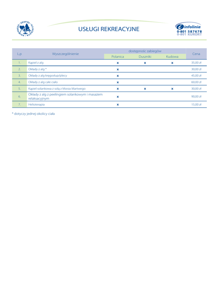 USŁUGI REKREACYJNE L.p Wyszczególnienie dostępnośc zabiegów Polanica Duszniki Kudowa x x Cena 1. Kąpiel z alg x 2. Okłady z alg * x 30,00 zł 3. Okłady z alg kręgosłup/plecy x 45,00 zł 4. Okłady z alg całe ciało x 60,00 zł 5. Kąpiel solankowa z solą z Morza Martwego x 6. Okłady z alg z peelingiem solankowym i masażem relaksacyjnym x 90,00 zł 7. Helioterapia x 15,00 zł * dotyczy jednej okolicy ciała x x 35,00 zł 30,00 zł