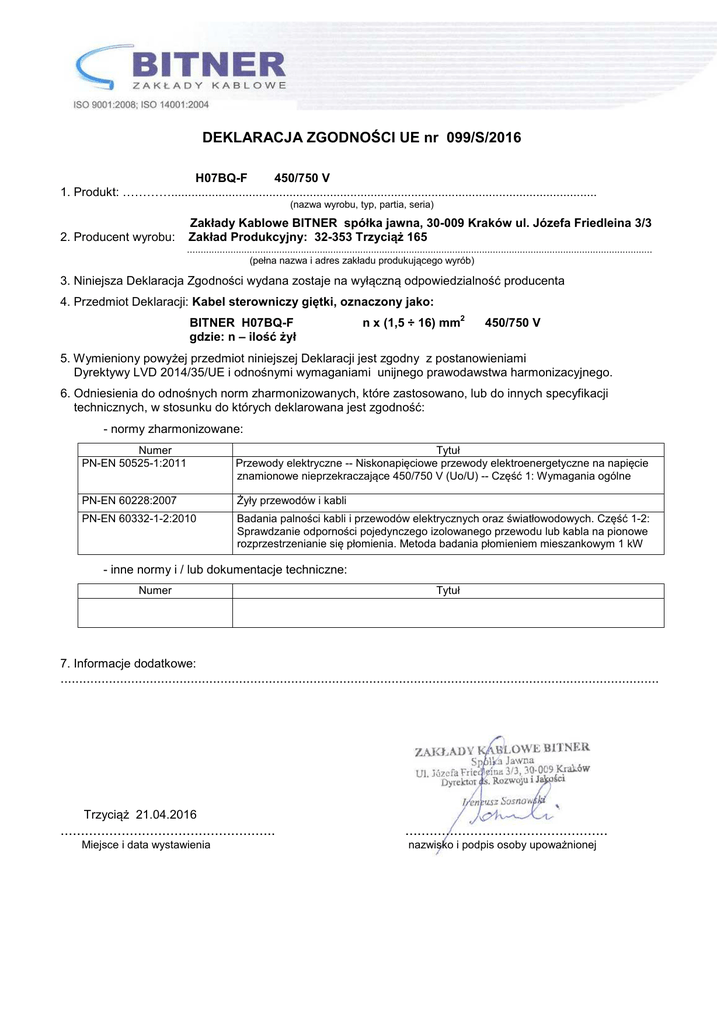 DEKLARACJA ZGODNOŚCI UE nr 099/S/2016 H07BQ-F 450/750 V 1. Produkt: ………….............................................................................................................................. (nazwa wyrobu, typ, partia, seria) 2. Producent wyrobu: Zakłady Kablowe BITNER spółka jawna, 30-009 Kraków ul. Józefa Friedleina 3/3 Zakład Produkcyjny: 32-353 Trzyciąż 165 ............................................................................................................................................................................ (pełna nazwa i adres zakładu produkującego wyrób) 3. Niniejsza Deklaracja Zgodności wydana zostaje na wyłączną odpowiedzialność producenta 4. Przedmiot Deklaracji: Kabel sterowniczy giętki, oznaczony jako: BITNER H07BQ-F gdzie: n – ilość żył n x (1,5 ÷ 16) mm 2 450/750 V 5. Wymieniony powyżej przedmiot niniejszej Deklaracji jest zgodny z postanowieniami Dyrektywy LVD 2014/35/UE i odnośnymi wymaganiami unijnego prawodawstwa harmonizacyjnego. 6. Odniesienia do odnośnych norm zharmonizowanych, które zastosowano, lub do innych specyfikacji technicznych, w stosunku do których deklarowana jest zgodność: - normy zharmonizowane: Numer PN-EN 50525-1:2011 Tytuł Przewody elektryczne -- Niskonapięciowe przewody elektroenergetyczne na napięcie znamionowe nieprzekraczające 450/750 V (Uo/U) -- Część 1: Wymagania ogólne PN-EN 60228:2007 Żyły przewodów i kabli PN-EN 60332-1-2:2010 Badania palności kabli i przewodów elektrycznych oraz światłowodowych. Część 1-2: Sprawdzanie odporności pojedynczego izolowanego przewodu lub kabla na pionowe rozprzestrzenianie się płomienia. Metoda badania płomieniem mieszankowym 1 kW - inne normy i / lub dokumentacje techniczne: Numer Tytuł 7. Informacje dodatkowe: ................................................................................................................................................................. Trzyciąż 21.04.2016 ..................................................... Miejsce i data wystawienia .................................................. nazwisko i podpis osoby upoważnionej