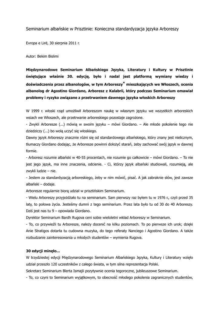 Seminarium albańskie w Prisztinie: Konieczna standardyzacja języka Arboreszy Evropa e Lirë, 30 sierpnia 2011 r. Autor: Bekim Bislimi Międzynarodowe Seminarium Albańskiego Języka, Literatury i Kultury w Prisztinie świętujące właśnie 30. edycję, było i nadal jest platformą wymiany wiedzy i doświadczenia przez albanologów, w tym Arboreszy* mieszkających we Włoszech, ocenia albanolog dr Agostino Giordano, Arboresz z Kalabrii, który podczas Seminarium omawiał problemy i ryzyko związane z przetrwaniem dawnego języka włoskich Arboreszy W 1999 r. włoski rząd umożliwił Arboreszom naukę w własnym języku we wszystkich arboreskich wsiach we Włoszech, ale przetrwanie arboreskiego pozostaje zagrożone. - Zwykli Arboresze (...) mówią w swoim języku – mówi Giordano. – Ale młode pokolenie tego nie dziedziczy (...) bo wolą uczyć się włoskiego. Dawny język Arboreszy znacznie różni się od standardowego albańskiego, który znany jest nielicznym, tłumaczy Giordano dodając, że Arboresze powinni dołożyć starań, żeby zachować swój język w dawnej formie. - Arboresz rozumie albański w 40-55 procentach, nie rozumie go całkowicie – mówi Giordano. – To nie jest jego język, ma inne znaczenia, odcienie. - Ci, którzy język albański studiowali, rozumieją, ale zwykli ludzie – nie. - Jestem za standardyzacją arboreskiego, żeby w nim mówić, pisać. A jak zabraknie słów, jest zawsze albański – dodaje. Arboresze regularnie biorą udział w prisztińskim Seminarium. - Wielu Arboreszy przyjeżdżało tu na seminarium. Sam pierwszy raz byłem tu w 1976 r., czyli przed 35 laty, to połowa życia. Jesteśmy dumni z tego seminarium. Przez lata było tu od 30 do 40 Arboreszy. Dziś jest nas tu 9 – opowiada Giordano. Dyrektor Seminarium Bardh Rugova ceni sobie wieloletni wkład Arboreszy w Seminarium. - To, co przywieźli tu Arboresze, należy docenić na kilku poziomach. To po pierwsze ich urok; dzięki Anie Stratigos dotarła tu cudowna muzyka, do tego referaty Nanciego i Agostino Giordano. A także rozbudzanie zainteresowania u młodych studentów – wymienia Rugova. 30 edycji minęło... W trzydziestej edycji Międzynarodowego Seminarium Albańskiego Języka, Kultury i Literatury wzięło udział przeszło 120 uczestników z całego świata, w tym silna reprezentacja Polski. Sekretarz Seminarium Blerta Ismajli pozytywnie ocenia tegoroczne, jubileuszowe Seminarium. - To, co czyni to Seminarium wyjątkowym, to obecność młodego pokolenia zagranicznych studentów, którzy (...) zaprezentowali tu ciekawe prace – powiedziała Ismajli. - Chodzi o to, że nie przyjeżdżają tylko, powiedzmy, weteranach seminarium, którzy dziś są znanymi profesorami, ale również młodzi, co jest dowodem rozwoju albanologii. Pozytywne opinie wyrażane przez seminarzystów są dla organizatorów najlepszą nagrodą. - To, że są zadowoleni z Seminarium i chcieliby wrócić w przyszłym roku, jest dla nas, jako organizatorów, pozytywnym sygnałem – dodała. – Od poniedziałku zaczynamy przygotowania do kolejnej edycji, za rok. *Arboresze (alb. Arbëreshë) to potomkowie Albańczyków, którzy w XV-XVIII w. emigrowali z Albanii do Włoch; mieszkają w 50 społecznościach w południowych Włoszech, przede wszystkim w Kalabrii, Apulii i na Sycylii, posługują się dialektem języka albańskiego, i są w większości katolikami obrządku wschodniego. Tłum. i red. Marta Kołczyńska