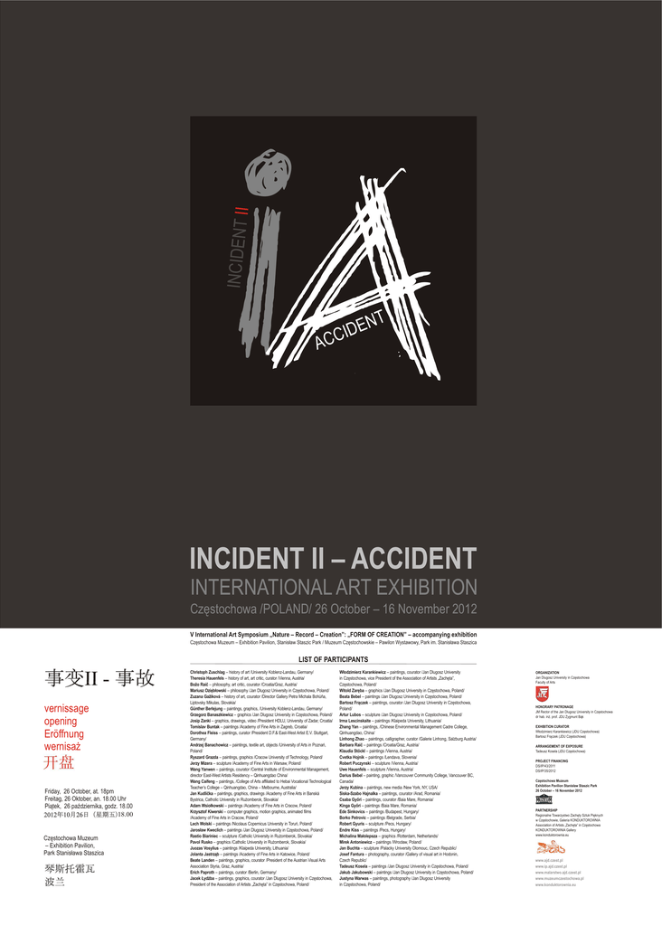 INCIDENT II IA T N E D I C C A INCIDENT II – ACCIDENT INTERNATIONAL ART EXHIBITION Czêstochowa /POLAND/ 26 October – 16 November 2012 V International Art Symposium „Nature – Record – Creation”: „FORM OF CREATION” – accompanying exhibition Czêstochowa Muzeum – Exhibition Pavilion, Stanis³aw Staszic Park / Muzeum Czêstochowskie – Pawilon Wystawowy, Park im. Stanis³awa Staszica LIST OF PARTICIPANTS vernissage opening Eröffnung wernisa¿ Friday, 26 October, at. 18pm Freitag, 26 Oktober, an. 18.00 Uhr Pi¹tek, 26 paŸdziernika, godz. 18.00 18.00 Czêstochowa Muzeum – Exhibition Pavilion, Park Stanis³awa Staszica Christoph Zuschlag – history of art /University Koblenz-Landau, Germany/ Theresia Hauenfels – history of art, art critic, curator /Vienna, Austria/ Božo Raiè – philosophy, art critic, courator /Croatia/Graz, Austria/ Mariusz Oziêb³owski – philosophy /Jan Dlugosz University in Czêstochowa, Poland/ Zuzana Gažiková – history of art, courator /Director Gallery Petra Michala Bohúòa, Liptovsky Mikulas, Slovakia/ Günther Berlejung – paintings, graphics, /University Koblenz-Landau, Germany/ Grzegorz Banaszkiewicz – graphics /Jan Dlugosz University in Czêstochowa, Poland/ Josip Zanki – graphics, drawings, video /President HDLU, University of Zadar, Croatia/ Tomislav Buntak – paintings /Academy of Fine Arts in Zagreb, Croatia/ Dorothea Fleiss – paintings, curator /President D.F.& East-West Artist E.V. Stuttgart, Germany/ Andrzej Banachowicz – paintings, textile art, objects /University of Arts in Poznañ, Poland/ Ryszard Grazda – paintings, graphics /Cracow University of Technology, Poland/ Jerzy Mizera – sculpture /Academy of Fine Arts in Warsaw, Poland/ Wang Yanwen – paintings, courator /Central Institute of Environmental Management, director East-West Artists Residency – Qinhuangdao China/ Wang Caifeng – paintings, /College of Arts affiliated to Hebai Vocational Technological Teacher’s College – Qinhuangdao, China – Melbourne, Australia/ Jan Kudlièka – paintings, graphics, drawings /Academy of Fine Arts in Banská Bystrica, Catholic University in Ru¿omberok, Slovakia/ Adam Wsio³kowski – paintings /Academy of Fine Arts in Cracow, Poland/ Krzysztof Kiwerski – computer graphics, motion graphics, animated films /Academy of Fine Arts in Cracow, Poland/ Lech Wolski – paintings /Nicolaus Copernicus University in Toruñ, Poland/ Jaros³aw Kweclich – paintings /Jan Dlugosz University in Czêstochowa, Poland/ Rastio Biariniec – sculpture /Catholic University in Ru¿omberok, Slovakia/ Pavol Rusko – graphics /Catholic University in Ru¿omberok, Slovakia/ Juozas Vosylius – paintings /Klaipeda University, Lithuania/ Jolanta Jastrz¹b – paintings /Academy of Fine Arts in Katowice, Poland/ Beate Landen – paintings, graphics, courator /President of the Austrian Visual Arts Association Styria, Graz, Austria/ Erich Paproth – paintings, curator /Berlin, Germany/ Jacek £yd¿ba – paintings, graphics, courator /Jan Dlugosz University in Czêstochowa, President of the Association of Artists „Zachêta” in Czêstochowa, Poland/ W³odzimierz Karankiewicz – paintings, courator /Jan Dlugosz University in Czêstochowa, vice President of the Association of Artists „Zachêta”, Czêstochowa, Poland/ Witold Zarêba – graphics /Jan Dlugosz University in Czêstochowa, Poland/ Beata Bebel – paintings /Jan Dlugosz University in Czêstochowa, Poland/ Bartosz Fr¹czek – paintings, courator /Jan Dlugosz University in Czêstochowa, Poland/ Artur Lubos – sculpture /Jan Dlugosz University in Czêstochowa, Poland/ Irma Lescinskaite – paintings /Klaipeda University, Lithuania/ Zhang Yan – paintings, /Chinese Environmental Management Cadre College, Qinhuangdao, China/ Linhong Zhao – paintings, calligrapher, curator /Galerie Linhong, Salzburg Austria/ Barbara Raiè – paintings /Croatia/Graz, Austria/ Klaudia Stöckl – paintings /Vienna, Austria/ Cvetka Hojnik – paintings /Lendava, Slovenia/ Robert Puczynski – sculpture /Vienna, Austria/ Uwe Hauenfels – sculpture /Vienna, Austria/ Darius Bebel – painting, graphic /Vancouver Community College, Vancouver BC, Canada/ Jerzy Kubina – paintings, new media /New York, NY, USA/ Siska-Szabo Hajnalka – paintings, courator /Arad, Romania/ Csaba Gyõri – paintings, courator /Baia Mare, Romania/ Kinga Gyõri – paintings /Baia Mare, Romania/ Ede Sinkovics – paintings /Budapest, Hungary/ Borko Petrovic – paintings /Belgrade, Serbia/ Robert Gyuris – sculpture /Pecs, Hungary/ Endre Kiss – paintings /Pecs, Hungary/ Michalina Ma³olepsza – graphics /Rotterdam, Netherlands/ Mirek Antoniewicz – paintings /Wroc³aw, Poland/ Jan Buchta – sculpture /Palacky University Olomouc, Czech Republic/ Josef Fantura – photography, courator /Gallery of visual art in Hodonin, Czech Republic/ Tadeusz Kosela – paintings /Jan Dlugosz University in Czêstochowa, Poland/ Jakub Jakubowski – paintings /Jan Dlugosz University in Czêstochowa, Poland/ Justyna Warwas – paintings, photography /Jan Dlugosz University in Czêstochowa, Poland/ ORGANIZATION Jan Dlugosz University in Czêstochowa Faculty of Arts HONORARY PATRONAGE JM Rector of the Jan Dlugosz University in Czêstochowa dr hab. in¿. prof. JDU Zygmunt B¹k EXHIBITION CURATOR W³odzimierz Karankiewicz (JDU Czêstochowa) Bartosz Fr¹czek (JDU Czêstochowa) ARRANGEMENT OF EXPOSURE Tadeusz Kosela (JDU Czêstochowa) PROJECT FINANCING DS/IP/43/2011 DS/IP/35/2012 Czêstochowa Muzeum Exhibition Pavilion Stanis³aw Staszic Park 26 October – 16 November 2012 PARTNERSHIP Regionalne Towarzystwo Zachêty Sztuk Piêknych w Czêstochowie, Galeria KONDUKTOROWNIA Association of Artists „Zachêta” in Czêstochowa KONDUKTOROWNIA Gallery www.konduktorownia.eu www.ajd.czest.pl www.ip.ajd.czest.pl www.malarstwo.ajd.czest.pl www.muzeumczestochowa.pl www.konduktorownia.eu