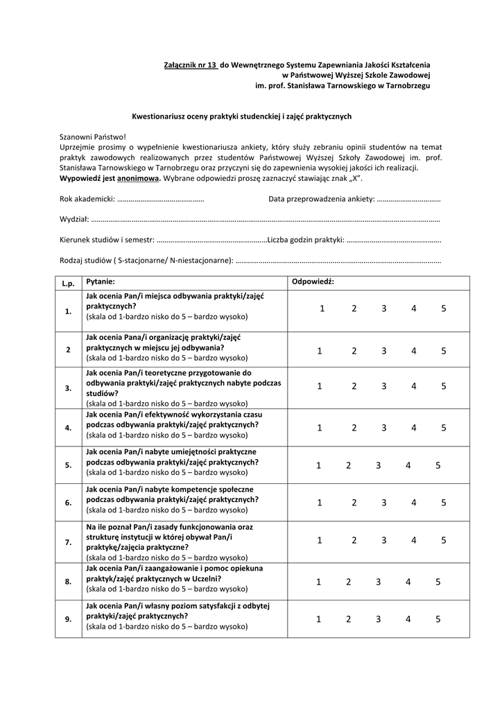 Załącznik nr 13 do Wewnętrznego Systemu Zapewniania Jakości Kształcenia w Państwowej Wyższej Szkole Zawodowej im. prof. Stanisława Tarnowskiego w Tarnobrzegu Kwestionariusz oceny praktyki studenckiej i zajęć praktycznych Szanowni Państwo! Uprzejmie prosimy o wypełnienie kwestionariusza ankiety, który służy zebraniu opinii studentów na temat praktyk zawodowych realizowanych przez studentów Państwowej Wyższej Szkoły Zawodowej im. prof. Stanisława Tarnowskiego w Tarnobrzegu oraz przyczyni się do zapewnienia wysokiej jakości ich realizacji. Wypowiedź jest anonimowa. Wybrane odpowiedzi proszę zaznaczyć stawiając znak „X”. Rok akademicki: ……………………………………… Data przeprowadzenia ankiety: …………………………… Wydział: ……………………………………………………………………………………………………………………………………………………………… Kierunek studiów i semestr: …………………………………………………Liczba godzin praktyki: …………………………………………. Rodzaj studiów ( S-stacjonarne/ N-niestacjonarne): ……………………………………………………………………………………………. L.p. 1. 2 3. 4. Pytanie: Jak ocenia Pan/i miejsca odbywania praktyki/zajęć praktycznych? (skala od 1-bardzo nisko do 5 – bardzo wysoko) Jak ocenia Pana/i organizację praktyki/zajęć praktycznych w miejscu jej odbywania? (skala od 1-bardzo nisko do 5 – bardzo wysoko) Jak ocenia Pan/i teoretyczne przygotowanie do odbywania praktyki/zajęć praktycznych nabyte podczas studiów? (skala od 1-bardzo nisko do 5 – bardzo wysoko) Jak ocenia Pan/i efektywność wykorzystania czasu podczas odbywania praktyki/zajęć praktycznych? (skala od 1-bardzo nisko do 5 – bardzo wysoko) Odpowiedź: 1 2 3 4 5 1 2 3 4 5 1 2 3 4 5 1 2 3 4 5 5. Jak ocenia Pan/i nabyte umiejętności praktyczne podczas odbywania praktyki/zajęć praktycznych? (skala od 1-bardzo nisko do 5 – bardzo wysoko) 1 6. Jak ocenia Pan/i nabyte kompetencje społeczne podczas odbywania praktyki/zajęć praktycznych? (skala od 1-bardzo nisko do 5 – bardzo wysoko) 1 2 3 4 5 1 2 3 4 5 7. 8. 9. Na ile poznał Pan/i zasady funkcjonowania oraz strukturę instytucji w której obywał Pan/i praktykę/zajęcia praktyczne? (skala od 1-bardzo nisko do 5 – bardzo wysoko) Jak ocenia Pan/i zaangażowanie i pomoc opiekuna praktyk/zajęć praktycznych w Uczelni? (skala od 1-bardzo nisko do 5 – bardzo wysoko) Jak ocenia Pan/i własny poziom satysfakcji z odbytej praktyki/zajęć praktycznych? (skala od 1-bardzo nisko do 5 – bardzo wysoko) 2 3 4 5 1 2 3 4 5 1 2 3 4 5 10. 11. 12. 13. Co Pana/i zdaniem należałoby zmienić, aby praktyki/zajęcia praktyczne były jeszcze bardziej satysfakcjonujące i przydatne: ………………………………………………………………………………………………………………………………………………………………………. ………………………………………………………………………………………………………………………………………………………………………… …………………………………………………………………………………………………………………………………………………………………………. Czy wystąpiły jakieś trudności podczas realizowania praktyk/zajęć praktycznych? • tak, • nie. Jeśli tak to jakie? ………………………………………………………………………………………………………………………………………………. …………………………………………………………………………………………………………………………………………………………………………… …………………………………………………………………………………………………………………………………………………………………………… Czy Pana/i zdaniem czas praktyki/zajęć praktycznych • zdecydowanie tak, był wystarczający? • raczej tak, • zdecydowanie nie, (proszę zaznaczyć znakiem „X” jedną odpowiedź)* • raczej nie, • nie mam zdania. Proszę zaznaczyć sektor w którym odbywał Pan/i się • sektor publiczny • sektor prywatny praktyki/zajęcia praktyczne* (proszę zaznaczyć znakiem „X” jedną odpowiedź) * Nie dotyczy kierunku Pielęgniarstwo