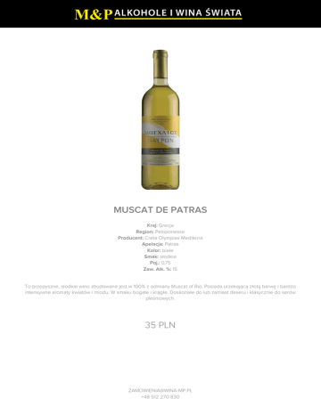 MUSCAT DE PATRAS Kraj: Grecja Region: Peloponesse Producent: Creta Olympias Mediterra Apelacja: Patras Kolor: białe Smak: słodkie Poj.: 0,75 Zaw. Alk. %: 15 To przepyszne, słodkie wino zbudowane jest w 100% z odmiany Muscat of Rio. Posiada urzekającą złotą barwę i bardzo intensywne aromaty kwiatów i miodu. W smaku bogate i krągłe. Doskonałe do lub zamiast deseru i klasycznie do serów pleśniowych. 35 PLN [email protected] +48 512 270 830