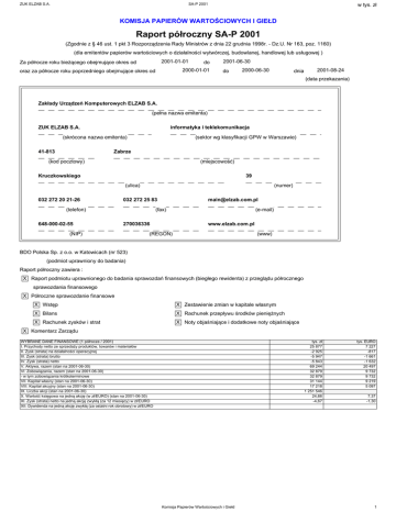 ZUK ELZAB S.A. SA-P 2001 w tys. zł KOMISJA PAPIERÓW WARTOŚCIOWYCH I GIEŁD Raport półroczny SA-P 2001 (Zgodnie z § 46 ust. 1 pkt 3 Rozporządzenia Rady Ministrów z dnia 22 grudnia 1998r. - Dz.U. Nr 163, poz. 1160) (dla emitentów papierów wartościowych o działalności wytwórczej, budowlanej, handlowej lub usługowej ) 2001-01-01 Za półrocze roku bieżącego obejmujące okres od do 2000-01-01 oraz za półrocze roku poprzedniego obejmujące okres od 2001-06-30 do 2000-06-30 dnia 2001-08-24 (data przekazania) Zakłady Urządzeń Komputerowych ELZAB S.A. (pełna nazwa emitenta) ZUK ELZAB S.A. informatyka i teklekomunikacja (skrócona nazwa emitenta) 41-813 (sektor wg klasyfikacji GPW w Warszawie) Zabrze (kod pocztowy) (miejscowość) Kruczkowskiego 39 (ulica) 032 272 20 21-26 (numer) 032 272 25 83 (telefon) 648-000-02-55 [email protected] (fax) 270036336 (NIP) (e-mail) www.elzab.com.pl (REGON) (www) BDO Polska Sp. z o.o. w Katowicach (nr 523) (podmiot uprawniony do badania) Raport półroczny zawiera : X Raport podmiotu uprawnionego do badania sprawozdań finansowych (biegłego rewidenta) z przeglądu półrocznego sprawozdania finansowego X Półroczne sprawozdanie finansowe X Wstęp X Zestawienie zmian w kapitale własnym X Bilans X Rachunek przepływu środków pieniężnych X Rachunek zysków i strat X Noty objaśniające i dodatkowe noty objaśniające X Komentarz Zarządu WYBRANE DANE FINANSOWE (1 półrocze / 2001) I. Przychody netto ze sprzedaży produktów, towarów i materiałów II. Zysk (strata) na działalności operacyjnej III. Zysk (strata) brutto IV. Zysk (strata) netto V. Aktywa, razem (stan na 2001-06-30) VI. Zobowiązania, razem (stan na 2001-06-30) - w tym zobowiązania krótkoterminowe VII. Kapitał własny (stan na 2001-06-30) VIII. Kapitał akcyjny (stan na 2001-06-30) IX. Liczba akcji (stan na 2001-06-30) X. Wartość księgowa na jedną akcję (w zł/EURO) (stan na 2001-06-30) XI. Zysk (strata) netto na jedną akcję zwykłą (za 12 miesięcy) w zł/EURO XII. Dywidenda na jedną akcję zwykłą (za ostatni rok obrotowy) w zł/EURO tys. zł 25 877 -2 925 -5 947 -5 843 69 244 32 879 32 879 31 144 17 218 1 251 546 24,88 -4,67 Komisja Papierów Wartościowych i Giełd tys. EURO 7 227 -817 -1 661 -1 632 20 497 9 732 9 732 9 219 5 097 7,37 -1,30 1 Raport biegłego rewidenta z przeglądu sprawozdania finansowego obejmującego okres od 1.01.2001 roku do 30.06.2001 roku Dla Akcjonariuszy, Rady Nadzorczej i Zarządu Zakładów Urządzeń Komputerowych „ELZAB” S.A. z siedzibą w Zabrzu Dokonaliśmy przeglądu załączonego śródrocznego sprawozdania finansowego Zakładów Urządzeń Komputerowych „ELZAB” S.A. z siedzibą w Zabrzu, stanowiącego raport półroczny dla Komisji Papierów Wartościowych i Giełd, na które składa się: - bilans sporządzony na dzień 30.06.2001 roku, który po stronie aktywów i pasywów wykazuje sumę 69.244.000,15 zł, - rachunek zysków i strat za okres od dnia 1.01.2001 roku do dnia 30.06.2001 roku wykazujący stratę netto 5.843.014,91 zł, - zestawienie zmian w kapitale własnym, - sprawozdanie z przepływu środków pieniężnych wykazujące zmniejszenie stanu środków pieniężnych netto w okresie od dnia 1.01.2001 roku do dnia 30.06.2001 roku na sumę 2.960.353,41 zł, - komentarz Zarządu na temat działalności gospodarczej emitenta, - informacja dodatkowa. Za rzetelność, prawidłowość i jasność informacji zawartych w tym sprawozdaniu odpowiada Zarząd Spółki. Naszym zadaniem było dokonanie przeglądu tego sprawozdania. Przegląd ten przeprowadziliśmy stosownie do postanowień: 1. Rozporządzenia Rady Ministrów z dnia 22.12.1998 roku (Dz.U. Nr 163, poz. 1160 z późniejszymi zmianami) w sprawie rodzaju, formy i zakresu informacji bieżących i okresowych oraz terminów ich przekazywania przez emitentów papierów wartościowych dopuszczonych do publicznego obrotu, 2. Normy nr 6 wykonywania zawodu biegłego rewidenta, wydanej przez Krajową Radę Biegłych Rewidentów (Biuletyn KIBR Nr 30 z 1996 roku), 3. Międzynarodowych Standardów Rewizji Finansowej mających zastosowanie do przeglądu sprawozdania finansowego. Przeglądu dokonaliśmy głównie drogą analizy danych śródrocznego sprawozdania finansowego, wglądu w księgi rachunkowe oraz wykorzystania informacji uzyskanych od Zarządu oraz personelu odpowiedzialnego za finanse i księgowość Spółki. Zakres i metoda przeglądu śródrocznego sprawozdania finansowego istotnie różni się od badań leżących u podstaw opinii wydawanej o rzetelności, prawidłowości i jasności rocznego sprawozdania finansowego, dlatego nie możemy wydać takiej opinii o załączonym sprawozdaniu. Dokonany przez nas przegląd nie wykazał potrzeby dokonania istotnych zmian w załączonym sprawozdaniu finansowym, aby przedstawiało ono prawidłowo, rzetelnie i jasno sytuację majątkową i finansową spółki na dzień 30.06.2001 roku oraz jej wynik finansowy, rentowność, zmiany w kapitale własnym i przepływy środków pieniężnych za okres od 1.01.2001 roku do 30.06.2001 roku zgodnie z zasadami rachunkowości określonymi w ustawie z dnia 29.09.1994 roku o rachunkowości (Dz.U. Nr 121, poz. 591 z późniejszymi zmianami) i wydanymi na jej podstawie przepisami. Sprawozdanie finansowe za okres od dnia 1.01.2001 roku do dnia 30.06.2001 roku zostało sporządzone zgodnie z przepisami określonymi w rozporządzeniu Rady Ministrów z dnia 22.12.1998 roku w sprawie rodzaju, formy i zakresu informacji bieżących i okresowych oraz terminów ich przekazywania przez emitentów papierów wartościowych dopuszczonych do publicznego obrotu (Dz.U. Nr 163, poz. 1160 z późniejszymi zmianami), które przewiduje odmienny format prezentacji i zakres ujawnionych informacji w stosunku do wymogów ustawy z dnia 29.09.1994 roku o rachunkowości (Dz.U. Nr 121, poz. 591 z późniejszymi zmianami). Katowice, dnia 14 sierpnia 2001 roku BDO Polska Spółka z o.o. Katowice, ul. Drzym