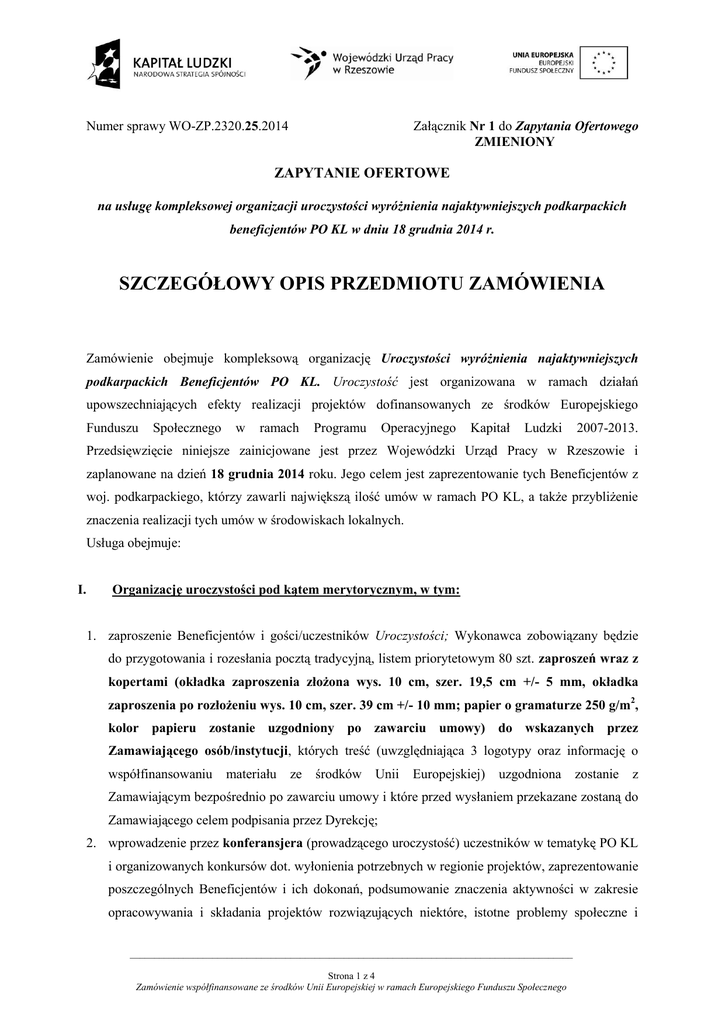 Załącznik Nr 1 do Zapytania Ofertowego ZMIENIONY Numer sprawy WO-ZP.2320.25.2014 ZAPYTANIE OFERTOWE na usługę kompleksowej organizacji uroczystości wyróżnienia najaktywniejszych podkarpackich beneficjentów PO KL w dniu 18 grudnia 2014 r. SZCZEGÓŁOWY OPIS PRZEDMIOTU ZAMÓWIENIA Zamówienie obejmuje kompleksową organizację Uroczystości wyróżnienia najaktywniejszych podkarpackich Beneficjentów PO KL. Uroczystość jest organizowana w ramach działań upowszechniających efekty realizacji projektów dofinansowanych ze środków Europejskiego Funduszu Społecznego w ramach Programu Operacyjnego Kapitał Ludzki 2007-2013. Przedsięwzięcie niniejsze zainicjowane jest przez Wojewódzki Urząd Pracy w Rzeszowie i zaplanowane na dzień 18 grudnia 2014 roku. Jego celem jest zaprezentowanie tych Beneficjentów z woj. podkarpackiego, którzy zawarli największą ilość umów w ramach PO KL, a także przybliżenie znaczenia realizacji tych umów w środowiskach lokalnych. Usługa obejmuje: I. Organizację uroczystości pod kątem merytorycznym, w tym: 1. zaproszenie Beneficjentów i gości/uczestników Uroczystości; Wykonawca zobowiązany będzie do przygotowania i rozesłania pocztą tradycyjną, listem priorytetowym 80 szt. zaproszeń wraz z kopertami (okładka zaproszenia złożona wys. 10 cm, szer. 19,5 cm +/- 5 mm, okładka zaproszenia po rozłożeniu wys. 10 cm, szer. 39 cm +/- 10 mm; papier o gramaturze 250 g/m2, kolor papieru zostanie uzgodniony po zawarciu umowy) do wskazanych przez Zamawiającego osób/instytucji, których treść (uwzględniająca 3 logotypy oraz informację o współfinansowaniu materiału ze środków Unii Europejskiej) uzgodniona zostanie z Zamawiającym bezpośrednio po zawarciu umowy i które przed wysłaniem przekazane zostaną do Zamawiającego celem podpisania przez Dyrekcję; 2. wprowadzenie przez konferansjera (prowadzącego uroczystość) uczestników w tematykę PO KL i organizowanych konkursów dot. wyłonienia potrzebnych w regionie projektów, zaprezentowanie poszczególnych Beneficjentów i ich dokonań, podsumowanie znaczenia aktywności w zakresie opracowywania i składania projektów rozwiązujących niektóre, istotne problemy społeczne i ___________________________________________________________________________________________ Strona 1 z 4 Zamówienie współfinansowane ze środków Unii Europejskiej w ramach Europejskiego Funduszu Społecznego zawodowe mieszkańców Podkarpacia. Prowadzący uroczystość winien posiadać doświadczenie w zakresie prowadzenia podobnych imprez oraz przygotować się z tematyki, której dotyczy zlecane przedsięwzięcie. Kandydatury osób prowadzących (min. dwie) winny być przedstawione Zamawiającemu wraz z opisem prowadzonych imprez i doświadczenia w tym zakresie bezzwłocznie po zawarciu umowy. Zamawiający wybierze konferansjera, który poprowadzi uroczystość. Niezbędne informacje dot. Beneficjentów, ich projektów, realizacji PO KL na Podkarpaciu Zamawiający usługę dostarczy Wykonawcy bezpośrednio po zawarciu z Wykonawcą umowy; 3. przygotowanie w formie dyplomów (wielkość - format A4, papier o gramaturze ok. 170-250 g/m2, kolor papieru zostanie uzgodniony po zawarciu umowy), w ilości 27 szt., podziękowania za zaangażowanie w aplikowaniu o środki finansowe EFS dla zaproszonych Beneficjentów, których treść (uwzględniająca 3 kolorowe logotypy oraz informację o współfinansowaniu materiału ze środków Unii Europejskiej) uzgodniona zostanie z Zamawiającym bezpośrednio po zawarciu z Wykonawcą umowy, dyplomy winny być przed rozdaniem przekazane do Zamawiającego celem podpisania przez Dyrekcję; struktura i gramatura papieru musi zostać uzgodniona z Zamawiajacym; 4. zakupienie 11 szt. szklanych lub z pleksy statuetek na podstawce w kształcie konturów mapy Podkarpacia (wys. statuetki bez podstawki min. 16,5 cm, szer. min. 14 cm, grubość do 1 cm; wysokość podstawki ok. 3-4 cm, szer. ok. 11 cm, głębokość ok. 5,5 cm), na statuetce zamieszczony zostanie tekst gratulacyjny – treść opracowana zostanie przez Zamawiającego i przekazana Wykonawcy po zawarciu umowy. Na podstawce, z przodu statuetki winna zostać zamieszczona informacja o współfinansowaniu materiału ze środków Unii Europejskiej wraz z 3 logotypami (stosowana informacja wraz z logotypami zostanie przekazana Wykonawcy po podpisaniu umowy). Nadruk na statuetce i podstawce winien zostać wykonany grawerem. Propozycje dot. ostatecznej wielkości statuetek Wykonawca winien przedstawić Zamawiającemu do akceptacji bezpośrednio po zawarciu umowy. II. Organizację uroczystości pod kątem organizacyjnym, w tym: Uroczystość będzie zorganizowana dla 80 osób w Rzeszowie, w odległości nie większej niż 1,5 ( półtora ) kilometra od Dworców Głównych PKS i PKP. Czas trwania Uroczystości: ok. 2-3 godziny zegarowe. Przewidywany czas rozpoczęcia Uroczystości godz. 17:00, (kawa na przywitanie) winna być gotowa na godzinę 16:30. 1. zapewnienie klimatyzowanej sali/auli w hotelu lub centrum konferencyjno-hotelowym o standardzie odpowiadającym co najmniej 3 gwiazdkom, posiadającym restaurację w tym samym ___________________________________________________________________________________________ Strona 2 z 4 Zamówienie współfinansowane ze środków Unii Europejskiej w ramach Europejskiego Funduszu Społecznego budynku (bez konieczności przechodzenia uczestników do innego budynku) wraz z następującym wyposażeniem: a) wielkość sali dostosowana do 80 uczestników Uroczystości, b) miejsca siedzące (ustawienie kinowe) dla 80 uczestników Uroczystości, c) nagłośnienie – 2 mikrofony bezprzewodowe dla prowadzących Uroczystość, d) projektor multimedialny, e) ekran (widoczność ekranu musi zostać zapewniona z każdego miejsca siedzącego umieszczonego w sali), f) miejsce (stolik) na laptopa, g) okablowanie, h) scena/podest z mównicą, i) odpowiednie oświetlenie z możliwością zaciem