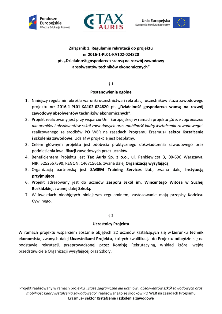 Załącznik 1. Regulamin rekrutacji do projektu nr 2016-1-PL01-KA102-024820 pt. „Działalność gospodarcza szansą na rozwój zawodowy absolwentów techników ekonomicznych” §1 Postanowienia ogólne 1. Niniejszy regulamin określa warunki uczestnictwa i rekrutacji uczestników stażu zawodowego projektu nr: 2016-1-PL01-KA102-024820 pt. „Działalność gospodarcza szansą na rozwój zawodowy absolwentów techników ekonomicznych”. 2. Projekt realizowany jest przy wsparciu Unii Europejskiej w ramach projektu „Staże zagraniczne dla uczniów i absolwentów szkół zawodowych oraz mobilność kadry kształcenia zawodowego” realizowanego ze środków PO WER na zasadach Programu Erasmus+ sektor Kształcenie i szkolenia zawodowe. Udział w projekcie jest bezpłatny. 3. Celem głównym projektu jest zdobycia praktycznego doświadczenia zawodowego oraz podniesienia kwalifikacji zawodowych przez uczniów. 4. Beneficjentem Projektu jest Tax Auris Sp. z o.o., ul. Pankiewicza 3, 00-696 Warszawa, NIP: 5252557590, REGON: 146715616, zwana dalej Organizacją wysyłającą. 5. Organizacją partnerską jest SAGEM Training Services Ltd., zwana dalej Instytucją przyjmującą. 6. Projekt adresowany jest do uczniów Zespołu Szkół im. Wincentego Witosa w Suchej Beskidzkiej, zwanej dalej Szkołą. 7. W kwestiach nieobjętych niniejszym regulaminem, zastosowanie mają przepisy Kodeksu Cywilnego. §2 Uczestnicy Projektu W ramach projektu wsparciem zostanie objętych 22 uczniów kształcących się w kierunku technik ekonomista, zwanych dalej Uczestnikami Projektu, których kwalifikacja do Projektu odbędzie się na podstawie rekrutacji, przeprowadzonej przez Komisję Rekrutacyjną, w skład której wejdą przedstawiciele Organizacji wysyłającej oraz Szkoły. Projekt realizowany w ramach projektu „Staże zagraniczne dla uczniów i absolwentów szkół zawodowych oraz mobilność kadry kształcenia zawodowego” realizowanego ze środków PO WER na zasadach Programu Erasmus+ sektor Kształcenie i szkolenia zawodowe §3 Zakres wsparcia 1. Czas trwania stażu dla każdego uczestnika wyniesie 10 dni, w tym: staż dla jednego uczestnika wynosi łącznie 60 godzin; staż będzie realizowany w sposób ciągły przez 2 kolejne następujące po sobie tygodnie; staż będzie realizowany przez 5 dni (dni robocze) w tygodniu; dobowy wymiar czasu pracy nie może przekroczyć 6 godzin; uczeń nie może świadczyć pracy w godzinach nadliczbowych; czas trwania stażu uwzględnia przerwy wynikające z przepisów obowiązujących w danym zakładzie pracy. 2. Uczestnikowi zostanie wyznaczony opiekun stażu w zakładzie pracy, który będzie czuwał nad prawidłową realizacją stażu przez uczestnika zgodnie z wcześniejszym opracowanym i skonstruowanym programem stażu. 3. W przypadku choroby lub innych nieoczekiwanych zdarzeń losowych uniemożliwiających stawienie się w zakładzie pracy, uczestnik ma obowiązek poinformować o tym fakcie, w tym samym dniu, opiekuna praktyk w zakładzie pracy oraz koordynatora projektu i Szkoły, wskazując jednocześnie dzień powrotu do zakładu pracy celem kontynuowania stażu. 4. Szczegółowe zasady odbywania stażu zostaną zawarte w umowie pomiędzy Uczestnikiem stażu, a Organizacją wysyłającą. §4 Zasady rekrutacji uczestników 1. Rekrutacja zostanie poprzedzona akcją informacyjną, w czasie której zostaną podane jej zasady. 2. Rekrutacja do projektu będzie się odbywać z uwzględnieniem zasady równych szans, w tym zasady równości płci. 3. Podstawą kwalifikowania osób do realizacji staży w ramach projektu będzie spełnienie następujących warunków: Przynależności do grupy określonej grupy docelowej, opisanej w § 2; Złożenie poprawnie wypełnionego formularza rekrutacyjnego. 4. Rekrutację przeprowadzi Organizacja wysyłająca wraz z Dyrekcją Szkoły. 5. Utworzona zostanie Komisja Rekrutacyjna składająca się z Dyrektora Szkoły, Koordynatora projektu z Organizacji Wysyłającej oraz nauczyciel zawodu z ramienia Szkoły. Projekt realizowany w ramach projektu „Staże zagraniczne dla uczniów i absolwentów szkół zawodowych oraz mobilność kadry kształcenia zawodowego” realizowanego ze środków PO WER na zasadach Programu Erasmus+ sektor Kształcenie i szkolenia zawodowe 6. Chęć udziału w projekcie uczeń zgłasza poprzez złożenie w sekretariacie danej Szkoły Formularza rekrutacyjnego. 7. Formularze rekrutacyjne będą rozdawane podczas spotkań informacyjnych oraz dostępne w sekretariacie Szkoły i na stronie internetowej projektu. 8. Uczniowie zobowiązują się do podania prawdziwych danych w formularzach rekrutacyjnych. 9. Szczegółowe kryteria rekrutacji obejmują: średnia ocen z poprzedzającego rekrutację semestru/roku szkolnego, gdzie średnia ocen 3.0 – 3,5 odpowiada 3 pkt; 3,6 – 3,9 odpowiada 4 pkt; 4,0 – 4,5 odpowiada 5 pkt; 4,6 – 5 odpowiada 6 pkt; 5,1 – 6 odpowiada 7 pkt; średnia ocen z praktyk/przedmiotów zawodowych z poprzedzającego rekrutację semestru/roku szkolnego, gdzie średnia ocen 3.0 – 3,5 odpowiada 3 pkt; 3,6 – 3,9 odpowiada 4 pkt; 4,0 – 4,5 odpowiada 5 pkt; 4,6 – 5 odpowiada 6 pkt; 5,1 – 6 odpowiada 7 pkt; ocena z języka angielskiego z poprzedzającego rekrutację semestru/roku szkolnego, gdzie skala od 3-6 odpowiada punktacji 3-6 pkt; zaangażowanie w życie szkoły (samorząd uczniowski, konkursy, wolontariat, imprezy szkolne, olimpiady i inne) – za zaangażowanie w konkretną akcję uczeń może otrzymać 1 pkt, maksymalna liczba punktów do zdobycia 5 pkt; frekwencja, gdzie 61-70% odpowiada 3 pkt; 71-80% odpowiada 4 pkt; 81-90% odpowiada 5 pkt, 91-100% odpowiada 6 pkt; ocena z zachowania, gdzie ocena dostateczna odpowiada 3 pkt; dobra odpowiada 4 pkt; bardzo dobra odpowiada 5 pkt, a wzorowa odpowiada 6 pkt; opinia wychowawcy – dobra odpowiada 3 pkt; bardzo dobra odpowiada 4 pkt i wzorowa odpowiada 5 pkt. 10. Punkty za poszczególne kategorie będą przyznawane prze