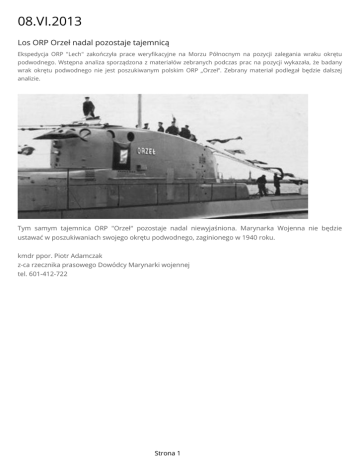 08.VI.2013 Los ORP Orzeł nadal pozostaje tajemnicą Ekspedycja ORP "Lech" zakończyła prace weryfikacyjne na Morzu Północnym na pozycji zalegania wraku okrętu podwodnego. Wstępna analiza sporządzona z materiałów zebranych podczas prac na pozycji wykazała, że badany wrak okrętu podwodnego nie jest poszukiwanym polskim ORP „Orzeł”. Zebrany materiał podlegał będzie dalszej analizie. Tym samym tajemnica ORP "Orzeł" pozostaje nadal niewyjaśniona. Marynarka Wojenna nie będzie ustawać w poszukiwaniach swojego okrętu podwodnego, zaginionego w 1940 roku. kmdr ppor. Piotr Adamczak z-ca rzecznika prasowego Dowódcy Marynarki wojennej tel. 601-412-722 Strona 1
