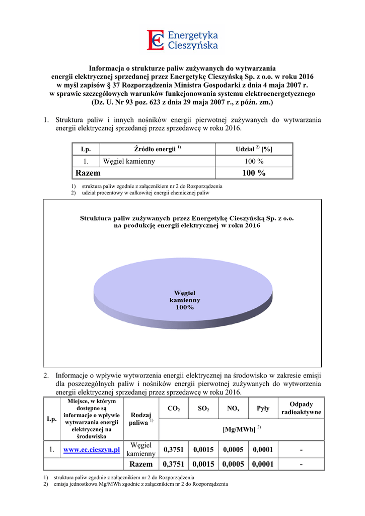 Informacja o strukturze paliw zużywanych do wytwarzania energii elektrycznej sprzedanej przez Energetykę Cieszyńską Sp. z o.o. w roku 2016 w myśl zapisów § 37 Rozporządzenia Ministra Gospodarki z dnia 4 maja 2007 r. w sprawie szczegółowych warunków funkcjonowania systemu elektroenergetycznego (Dz. U. Nr 93 poz. 623 z dnia 29 maja 2007 r., z późn. zm.) 1. Struktura paliw i innych nośników energii pierwotnej zużywanych do wytwarzania energii elektrycznej sprzedanej przez sprzedawcę w roku 2016. Źródło energii 1) Lp. 1. Udział 2) [%] Węgiel kamienny 100 % Razem 1) 2) 100 % struktura paliw zgodnie z załącznikiem nr 2 do Rozporządzenia udział procentowy w całkowitej energii chemicznej paliw 2. Informacje o wpływie wytworzenia energii elektrycznej na środowisko w zakresie emisji dla poszczególnych paliw i nośników energii pierwotnej zużywanych do wytworzenia energii elektrycznej sprzedanej przez sprzedawcę w roku 2016. Lp. 1. Miejsce, w którym dostępne są informacje o wpływie wytwarzania energii elektrycznej na środowisko Rodzaj paliwa 1) www.ec.cieszyn.pl Węgiel kamienny CO2 Razem 1) 2) SO2 NOx Pyły Odpady radioaktywne [Mg/MWh] 2) 0,3751 0,0015 0,0005 0,0001 - 0,3751 0,0015 0,0005 0,0001 - struktura paliw zgodnie z załącznikiem nr 2 do Rozporządzenia emisja jednostkowa Mg/MWh zgodnie z załącznikiem nr 2 do Rozporządzenia