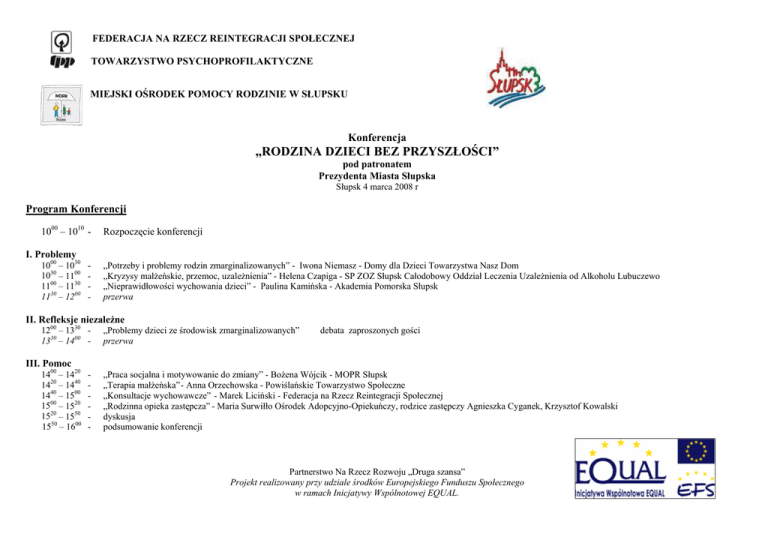 FEDERACJA NA RZECZ REINTEGRACJI SPOŁECZNEJ TOWARZYSTWO PSYCHOPROFILAKTYCZNE MIEJSKI OŚRODEK POMOCY RODZINIE W SŁUPSKU Konferencja „RODZINA DZIECI BEZ PRZYSZŁOŚCI” pod patronatem Prezydenta Miasta Słupska Słupsk 4 marca 2008 r Program Konferencji 1000 – 1010 - Rozpoczęcie konferencji I. Problemy 1000 – 1030 1030 – 1100 1100 – 1130 1130 – 1200 - „Potrzeby i problemy rodzin zmarginalizowanych” - Iwona Niemasz - Domy dla Dzieci Towarzystwa Nasz Dom „Kryzysy małżeńskie, przemoc, uzależnienia” - Helena Czapiga - SP ZOZ Słupsk Całodobowy Oddział Leczenia Uzależnienia od Alkoholu Lubuczewo „Nieprawidłowości wychowania dzieci” - Paulina Kamińska - Akademia Pomorska Słupsk przerwa II. Refleksje niezależne 1200 – 1330 1330 – 1400 - „Problemy dzieci ze środowisk zmarginalizowanych” przerwa debata zaproszonych gości III. Pomoc 1400 – 1420 1420 – 1440 1440 – 1500 1500 – 1520 1520 – 1550 1550 – 1600 - „Praca socjalna i motywowanie do zmiany” - Bożena Wójcik - MOPR Słupsk „Terapia małżeńska” - Anna Orzechowska - Powiślańskie Towarzystwo Społeczne „Konsultacje wychowawcze” - Marek Liciński - Federacja na Rzecz Reintegracji Społecznej „Rodzinna opieka zastępcza” - Maria Surwiłło Ośrodek Adopcyjno-Opiekuńczy, rodzice zastępczy Agnieszka Cyganek, Krzysztof Kowalski dyskusja podsumowanie konferencji Partnerstwo Na Rzecz Rozwoju „Druga szansa” Projekt realizowany przy udziale środków Europejskiego Funduszu Społecznego w ramach Inicjatywy Wspólnotowej EQUAL.