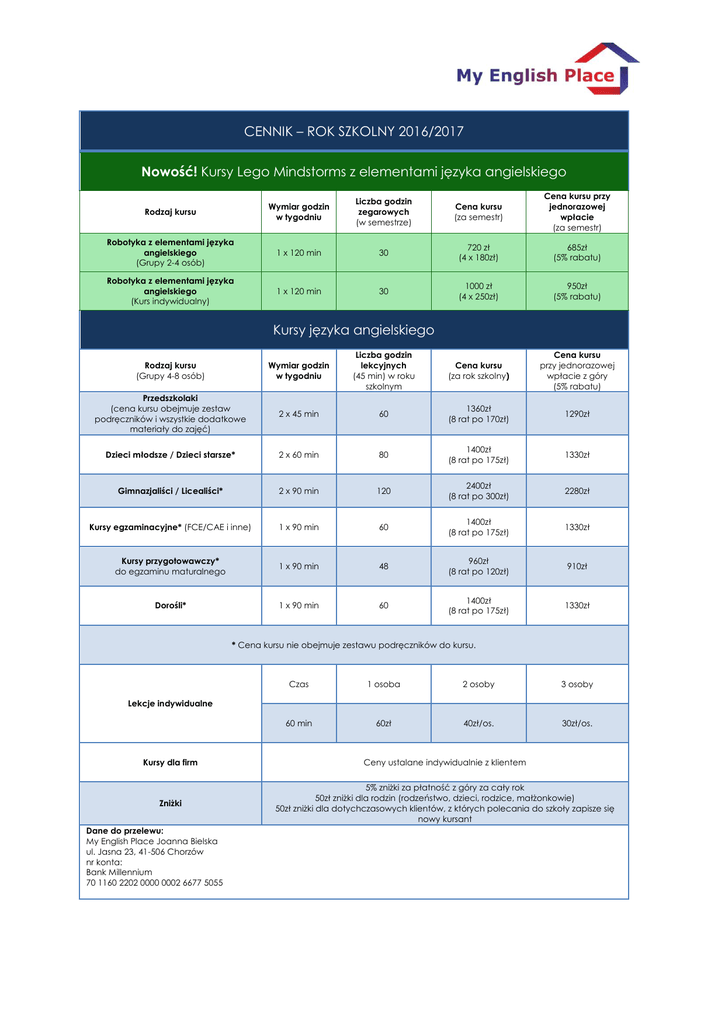 CENNIK – ROK SZKOLNY 2016/2017 Nowość! Kursy Lego Mindstorms z elementami języka angielskiego Rodzaj kursu Wymiar godzin w tygodniu Liczba godzin zegarowych (w semestrze) Cena kursu (za semestr) Cena kursu przy jednorazowej wpłacie (za semestr) Robotyka z elementami języka angielskiego (Grupy 2-4 osób) 1 x 120 min 30 720 zł (4 x 180zł) 685zł (5% rabatu) Robotyka z elementami języka angielskiego (Kurs indywidualny) 1 x 120 min 30 1000 zł (4 x 250zł) 950zł (5% rabatu) Kursy języka angielskiego Rodzaj kursu (Grupy 4-8 osób) Wymiar godzin w tygodniu Liczba godzin lekcyjnych (45 min) w roku szkolnym Cena kursu (za rok szkolny) Cena kursu przy jednorazowej wpłacie z góry (5% rabatu) Przedszkolaki (cena kursu obejmuje zestaw podręczników i wszystkie dodatkowe materiały do zajęć) 2 x 45 min 60 1360zł (8 rat po 170zł) 1290zł Dzieci młodsze / Dzieci starsze* 2 x 60 min 80 1400zł (8 rat po 175zł) 1330zł Gimnazjaliści / Licealiści* 2 x 90 min 120 2400zł (8 rat po 300zł) 2280zł Kursy egzaminacyjne* (FCE/CAE i inne) 1 x 90 min 60 1400zł (8 rat po 175zł) 1330zł Kursy przygotowawczy* do egzaminu maturalnego 1 x 90 min 48 960zł (8 rat po 120zł) 910zł Dorośli* 1 x 90 min 60 1400zł (8 rat po 175zł) 1330zł * Cena kursu nie obejmuje zestawu podręczników do kursu. Czas 1 osoba 2 osoby 3 osoby 60 min 60zł 40zł/os. 30zł/os. Lekcje indywidualne Kursy dla firm Ceny ustalane indywidualnie z klientem Zniżki 5% zniżki za płatność z góry za cały rok 50zł zniżki dla rodzin (rodzeństwo, dzieci, rodzice, małżonkowie) 50zł zniżki dla dotychczasowych klientów, z których polecania do szkoły zapisze się nowy kursant Dane do przelewu: My English Place Joanna Bielska ul. Jasna 23, 41-506 Chorzów nr konta: Bank Millennium 70 1160 2202 0000 0002 6677 5055