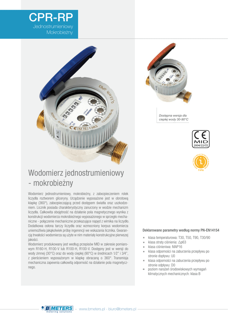 CPR-RP Jednostrumieniowy Mokrobieżny Dostępna wersja dla ciepłej wody 30-90°C Wodomierz jednostrumieniowy - mokrobieżny Wodomierz jednostrumieniowy, mokrobieżny, z zabezpieczeniem rolek liczydła roztworem gliceryny. Urządzenie wyposażone jest w obrotową klapkę (360°), zabezpieczającą przed dostępem światła oraz uszkodzeniem. Licznik posiada charakterystyczny zanurzony w wodzie mechanizm liczydła. Całkowita obojętność na działanie pola magnetycznego wynika z konstrukcji wodomierza mokrobieżnego wyposażonego w sprzegło mechaniczne - połączenie mechaniczne przekazujące napęd z wirnika na liczydło. Dodatkowa osłona tarczy liczydła oraz wzmocniony korpus wodomierza uniemożliwia jakąkolwiek próbę ingerencji we wskazania licznika. Gwarancją trwałości wodomierza są użyte w nim materiały konstrukcyjne pierwszej jakości. Wodomierz produkowany jest według przepisów MID w zakresie pomiarowym R160-H, R100-V lub R100-H, R100-V. Dostępny jest w wersji do wody zimnej (30°C) oraz do wody ciepłej (90°C) w średnicach 1⁄2’’ i 3⁄4’’, z pierścieniem wyposażonym w klapkę obracaną o 360°. Transmisja mechaniczna zapewnia całkowitą odporność na działanie pola magnetycznego. metering solutions www.bmeters.pl - [email protected] Deklarowane parametry według normy PN-EN14154 klasa temperaturowa: T30, T50, T90, T30/90 klasa straty ciśnienia: Δp63 klasa ciśnieniwa: MAP16 klasa odporności na zaburzenia przepływu po stronie dopływu: U0 klasa odporności na zaburzenia przepływu po stronie odpływu: D0 poziom narażeń środowiskowych wymagań klimatycznych mechanicznych: klasa B Mokrobieżny, jednostrumieniowy MID R160-H, R100-V, R100-H, R100-V, Zimna woda 30°C, Ciepła woda 90°C Charakterystyka techniczna: R = 160 R = 100 Średnica DN mm in 15 (1/2") 15 (1/2") 20 20 (3/4") Plastikowa pokrywka Plastic Lid Przepływ maksymalny Q4 m³/h 2.0 3.125 5 Ciągły strumień objętości Q3 m³/h 1.6 2.5 4 Pośredni strumień objętości Q2 l/h 25 40 64 Minimalny strumień objętości Q1 l/h 16 25 40 Liczydło Totalising mechanism Pośredni strumień objętości Q2 l/h 25 40 Uszczelka Gasket Minimalny strumień objętości Q1 l/h 16 25 Odczyt minimalny l 0,05 m³/h 99.999 Odczyt maksymalny Maksymalne dopuszczalne ciśnienie bar Pierścień zabezpieczający 360° Anti-fraud 360° rotable ring Mosiężny pierścień zamykający Brass sealing ring Szkło Glass Wirnik Turbine Sworzeń Pivot Regulator przepływu Flux regulator Mosiężny korpus Brass body Filtr Strainer 16 STRATA CIŚNIENIA bar 1 Pozycje montażu: 0,5 0 0 1 2 3 Przepływ m3/h Wymiary i waga: Średnica mm in 15 (1/2") 20 (3/4”) L mm 110 130 I mm 190 228 H mm 86 86 h mm 23 23 B mm 82 82 in 3/4" 1" ze śrubunkami kg 0,83 1,01 bez śrubunków kg 0,69 0,80 D Gwint Waga Ø20 Ø15 Gwint - Threading EN ISO 228-1:2000 www.bmeters.pl - [email protected] metering solutions 4 5