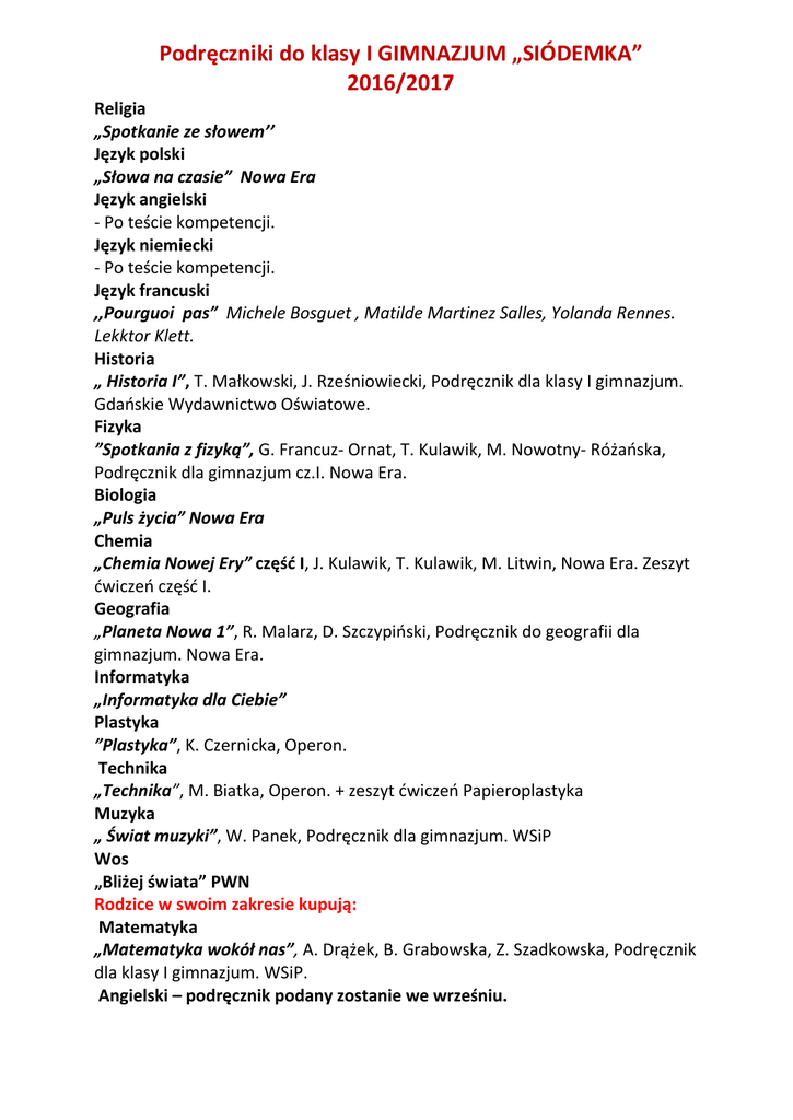 Podręczniki do klasy I GIMNAZJUM „SIÓDEMKA” 2016/2017 Religia „Spotkanie ze słowem’’ Język polski „Słowa na czasie” Nowa Era Język angielski - Po teście kompetencji. Język niemiecki - Po teście kompetencji. Język francuski ,,Pourguoi pas” Michele Bosguet , Matilde Martinez Salles, Yolanda Rennes. Lekktor Klett. Historia „ Historia I”, T. Małkowski, J. Rześniowiecki, Podręcznik dla klasy I gimnazjum. Gdańskie Wydawnictwo Oświatowe. Fizyka ”Spotkania z fizyką”, G. Francuz- Ornat, T. Kulawik, M. Nowotny- Różańska, Podręcznik dla gimnazjum cz.I. Nowa Era. Biologia „Puls życia” Nowa Era Chemia „Chemia Nowej Ery” część I, J. Kulawik, T. Kulawik, M. Litwin, Nowa Era. Zeszyt ćwiczeń część I. Geografia „Planeta Nowa 1”, R. Malarz, D. Szczypiński, Podręcznik do geografii dla gimnazjum. Nowa Era. Informatyka „Informatyka dla Ciebie” Plastyka ”Plastyka”, K. Czernicka, Operon. Technika „Technika”, M. Biatka, Operon. + zeszyt ćwiczeń Papieroplastyka Muzyka „ Świat muzyki”, W. Panek, Podręcznik dla gimnazjum. WSiP Wos „Bliżej świata” PWN Rodzice w swoim zakresie kupują: Matematyka „Matematyka wokół nas”, A. Drążek, B. Grabowska, Z. Szadkowska, Podręcznik dla klasy I gimnazjum. WSiP. Angielski – podręcznik podany zostanie we wrześniu. Podręczniki do klasy II GIMNAZJUM „SIÓDEMKA” 2016/2017 Religia „Aby nie ustać w drodze” Język polski „Świat w słowach i obrazach”, W. Bobiński, WSiP. Język angielski „Voices 3”, Katherine & Steve Bilsborough, Macmillan. “Next MOVE 3” Pearson Język niemiecki we wrześniu podany Język francuski ,, Pourguoi pas” Michele Bosguet , Matilde Martinez Salles, Yolanda Rennes. Lekktor Klett. Historia „ Historia II”. Podręcznik dla klasy II gimnazjum, T. Małkowski, J. Rześniowiecki , Gdańskie Wydawnictwo Oświatowe. Fizyka ”Spotkania z fizyką”. Podręcznik dla gimnazjum cz.II, G. Francuz- Ornat, T. Kulawik, M. Nowotny- Różańska, Nowa Era. Biologia „Puls życia 2” Nowa Era Chemia „Chemia Nowej Ery” część II , J. Kulawik, T. Kulawik, M. Litwicz, Nowa Era, podręcznik i zeszyt ćwiczeń. Geografia „Planeta Nowa” 2, R. Malarz, D. Szczypiński, Podręcznik do geografii dla gimnazjum, Nowa Era. Informatyka „Informatyka dla Ciebie”. Zajęcia techniczne „Technika”, M. Biatka, Operon. + zeszyt ćwiczeń Papieroplastyka Muzyka „ Świat muzyki”, W. Panek, Podręcznik dla gimnazjum, WSiP . Wos „Bliżej świata” PWN Rodzice w swoim zakresie kupują: Matematyka „Matematyka wokół nas”. Podręcznik dla klasy II gimnazjum, A. Drążek, B.Grabowska, Z. Szadkowska, WSiP. Angielski Podręczniki do klasy III GIMNAZJUM „SIÓDEMKA” 2016/2017 Religia „Żyć w miłości Boga” Język polski „Świat w słowach i obrazach” 3, W. Bobiński, Kształcenie literackie i kulturowe. Podręcznik dla klasy III gimnazjum ( wydanie zmienione). WSiP. ” Gramatyka i stylistyka” 3, Z. Czarniecka- Rodzik. WSiP. Język angielski Kontynuacja podręcznika Język niemiecki „Das ist Deutsch 3”, T. Potapowicz, K. Tkaczyk, WSiP. (pani Milena Sobania) Historia „ Historia ”, T. Małkowski, J. Rześniowiecki, Podręcznik dla klasy III gimnazjum, Gdańskie Wydawnictwo Oświatowe. Matematyka „Matematyka wokół nas”, A. Drążek, B. Grabowska, Z. Szadkowska, Podręcznik dla klasy III gimnazjum. WSiP. „Matematyka kalendarz gimnazjalisty” Przygotowanie do egzaminu po gimnazjum; M. Dobrowolska , M. Karpiński, J. Lech. Wyd. GWO Fizyka ”Spotkania z fizyką”, G. Francuz- Ornat, T. Kulawik, M. Nowotny- Różańska, Podręcznik dla gimnazjum cz.III. Nowa Era. Biologia „Biologia 3”, W. Lewiński, J. Prokop, Podręcznik dla uczniów gimnazjum (wydanie drugie zmienione). OPERON. Chemia „Chemia dla gimnazjum” cz.III, , Podręcznik dla gimnazjum. Wydawnictwo Edukacyjne „Nowa Era”. Geografia „Planeta Nowa” 3, R. Malarz, D. Szczypiński, Podręcznik do geografii dla gimnazjum, Nowa Era. WOS „Bliżej swiata”