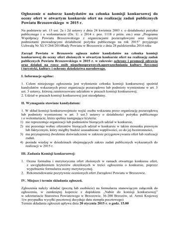 Ogłoszenie o naborze kandydatów na członka komisji konkursowej do oceny ofert w otwartym konkursie ofert na realizację zadań publicznych Powiatu Brzozowskiego w 2015 r. Na podstawie art. 15 ust. 2a i 2d ustawy z dnia 24 kwietnia 2003 r. o działalności pożytku publicznego i o wolontariacie (Dz. U. z 2014 r. poz. 1118 z późn. zm.) oraz „Programu Współpracy Powiatu Brzozowskiego z organizacjami pozarządowymi oraz innymi podmiotami prowadzącymi działalność pożytku publicznego na rok 2015” przyjętego Uchwałą Nr XLV/264/2014Rady Powiatu w Brzozowie z dnia 28 października 2014 roku Zarząd Powiatu w Brzozowie ogłasza nabór kandydatów na członka komisji konkursowej do oceny ofert złożonych w otwartym konkursie ofert na realizację zadań publicznych Powiatu Brzozowskiego w 2015 r. w zakresie: ochrony i promocji zdrowia oraz działań na rzecz osób niepełnosprawnych,upowszechniania kultury fizycznej i turystyki, kultury i ochrony dziedzictwa narodowego. I. Informacje ogólne: 1. Celem niniejszego ogłoszenia jest wyłonienie członka komisji konkursowej spośród kandydatów wskazanych przez organizacje pozarządowe lub podmioty wymienione w art. 3 ust. 3 ustawy, któresą zainteresowane udziałem w pracach komisji konkursowej. 2. Udział w pracach komisji konkursowej jest nieodpłatny. II. Wymagania stawiane kandydatom: 1. W skład komisji konkursowejmoże wejść osoba wskazana przez organizację pozarządową lub podmioty wymienione w art. 3 ust.3 ustawy o działalności pożytku publicznego i o wolontariacie, która spełnia następujące kryteria: 1) nie reprezentuje organizacji lub podmiotów biorących udział w konkursie, 2) nie pozostaje wobec oferentów biorących udział w konkursie w takim stosunku prawnym lub faktycznym, który mógłby budzić uzasadnione wątpliwości, co do jej bezstronności, 3) ma przynajmniej dwuletnie doświadczenie w zakresie przygotowywania ofert lub realizacji zadań. 4) posiada wiedzę w dziedzinach obejmujących zakres zadań publicznych wykazanych do realizacji w 2015 r. III. Zadania Komisji konkursowej: 1. Ocena formalna i merytoryczna ofert złożonych w ramach otwartego konkursu ofert, z uwzględnieniem kryteriów określonych w treści ogłoszenia o konkursie, poprzez wypełnienie formularza oceny merytorycznej. 2. Rekomendowanie pozytywnie ocenionych ofert Zarządowi Powiatu w Brzozowie. IV. Miejsce i termin składania zgłoszeń. Zgłoszenia należy składać (pocztą lub osobiście) na formularzu stanowiącym załącznik do ogłoszenia, w zamkniętej kopercie z dopiskiem „Nabór do komisji konkursowej” w sekretariacie Starostwa Powiatowego w Brzozowie, 36-200 Brzozów, ul. Armii Krajowej 1(w przypadku wysyłki pocztowej decyduje data stempla pocztowego) Termin składania zgłoszeń upływa dnia 20 stycznia 2015 r. o godz. 15.00 FORMULARZ ZGŁOSZENIOWY Nabór na członka Komisji Konkursowej I. Dane dotyczące Kandydata na członka Komisji 1. Imię i Nazwisko 2. Adres do korespondencji 3. Telefon kontaktowy 4. Kandydat reprezentuje następujące organizacje pozarządowe/ podmioty wymienione w art. 3 ust. 3 ustawy o działalności pożytku publicznego i o wolontariacie 5. Krótki opis doświadczenia kandydata II. Oświadczenie kandydata o wyrażeniu zgody na kandydowanie: Ja niżej podpisany(a).................................................................................................................. , deklaruję chęć udziału w Komisji Konkursowej w celu opiniowania ofert do otwartych konkursów ofert na realizacje zadań publicznych. .................................................................... Data i czytelny podpis Kandydata na członka Komisji III. Wyrażenie zgody na przetwarzanie danych osobowych. Wyrażam zgodę na przetwarzanie moich danych osobowych dla potrzeb niezbędnych do realizacji procesu wyboru członków Komisji Konkursowych oraz związanych z udziałem w pracach Komisji, zgodnie z ustawą z dnia 29 sierpnia 1997 r. o ochronie danych osobowych (Dz.U. z 2014 r. poz. 1182zpóźn. zm.) .................................................................... Data i czytelny podpis Kandydata na członka Komisji V. Wypełnia podmiot uprawniony, który kandydata wskazuje Zgłaszamy w/w kandydata do bazy kandydatów na członków Komisji Konkursowych jako reprezentanta naszej organizacji/podmiotu. ......................................................................................................... Pieczęć organizacji /podmiotu i podpisy osób upoważnionych do reprezentacji organizacji / podmiotu zgłaszającego kandydata VI. Wypełnia Wydział Oświaty, Rozwoju Regionalnego i Promocji Powiatu Starostwa Powiatowego w Brzozowie. Ocena formalna: 1) kandydat uprawniony do kandydowania TAK/NIE 2) kandydat zgłoszony przez podmiot uprawniony TAK/NIE 3) formularz zgłoszeniowy złożony w terminie TAK/NIE 4) wypełnione wszystkie pola formularza TAK/NIE ................................................. (data, miejscowość) ............................................... (podpis)